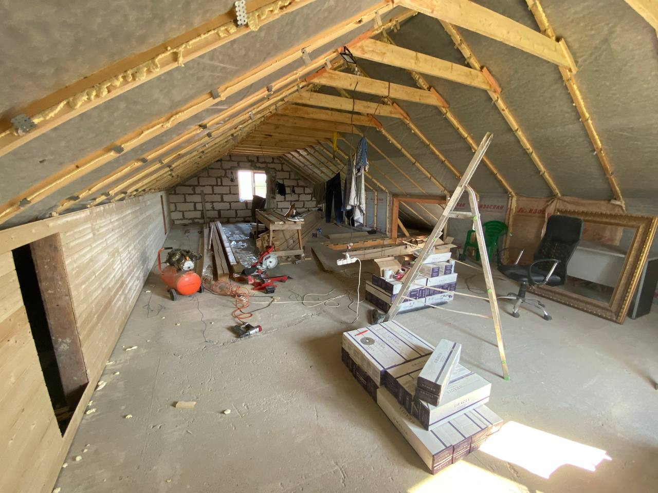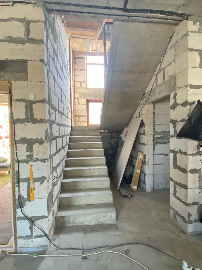 На 3 этаже ведутся работы по облицовки стен вагонкой штиль, и так же имеется плитка на пол. Пол 3 этажа тоже залили бетоном так как там имеется теплый пол, водяной. Лестница до второго этажа бетонная, на третий планировалась на метале, либо можно тоже залить бетоном.