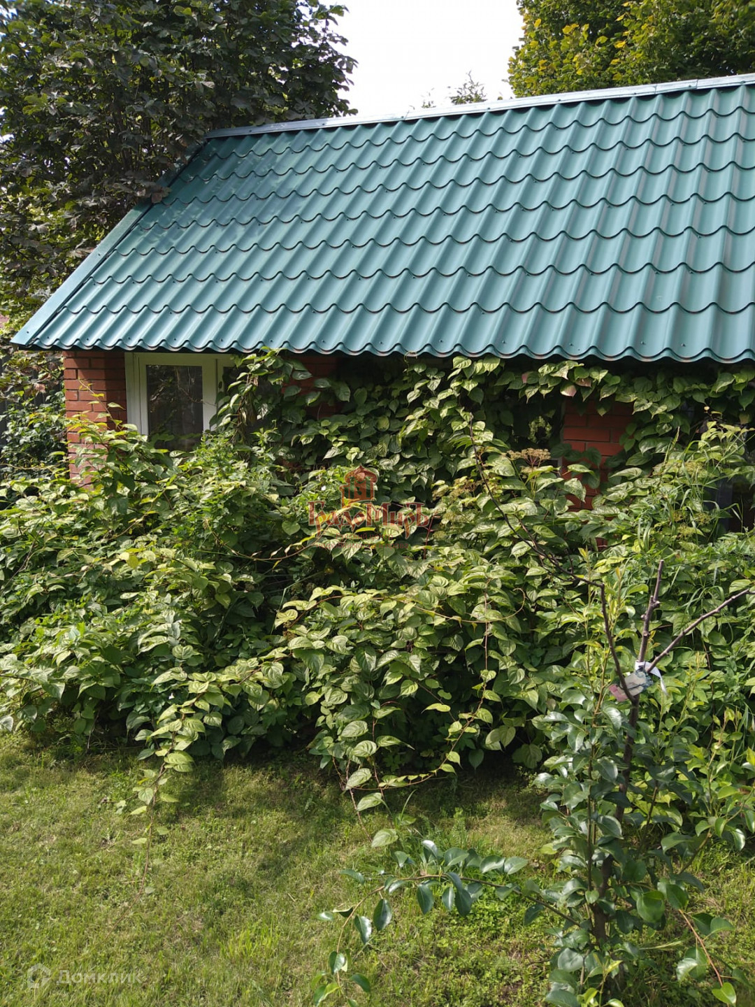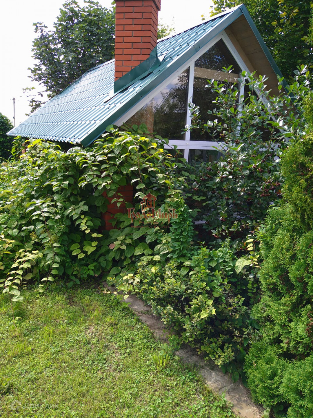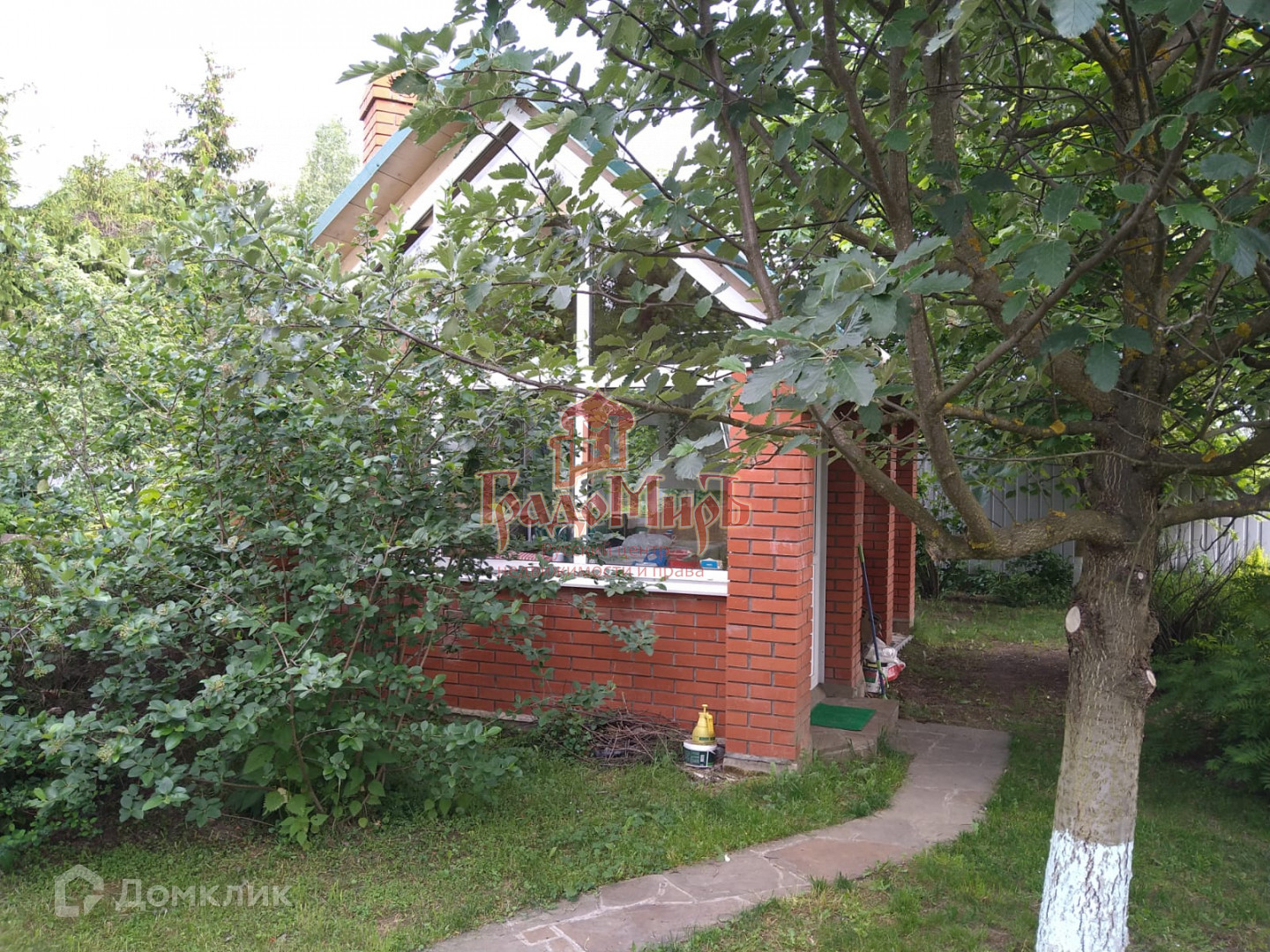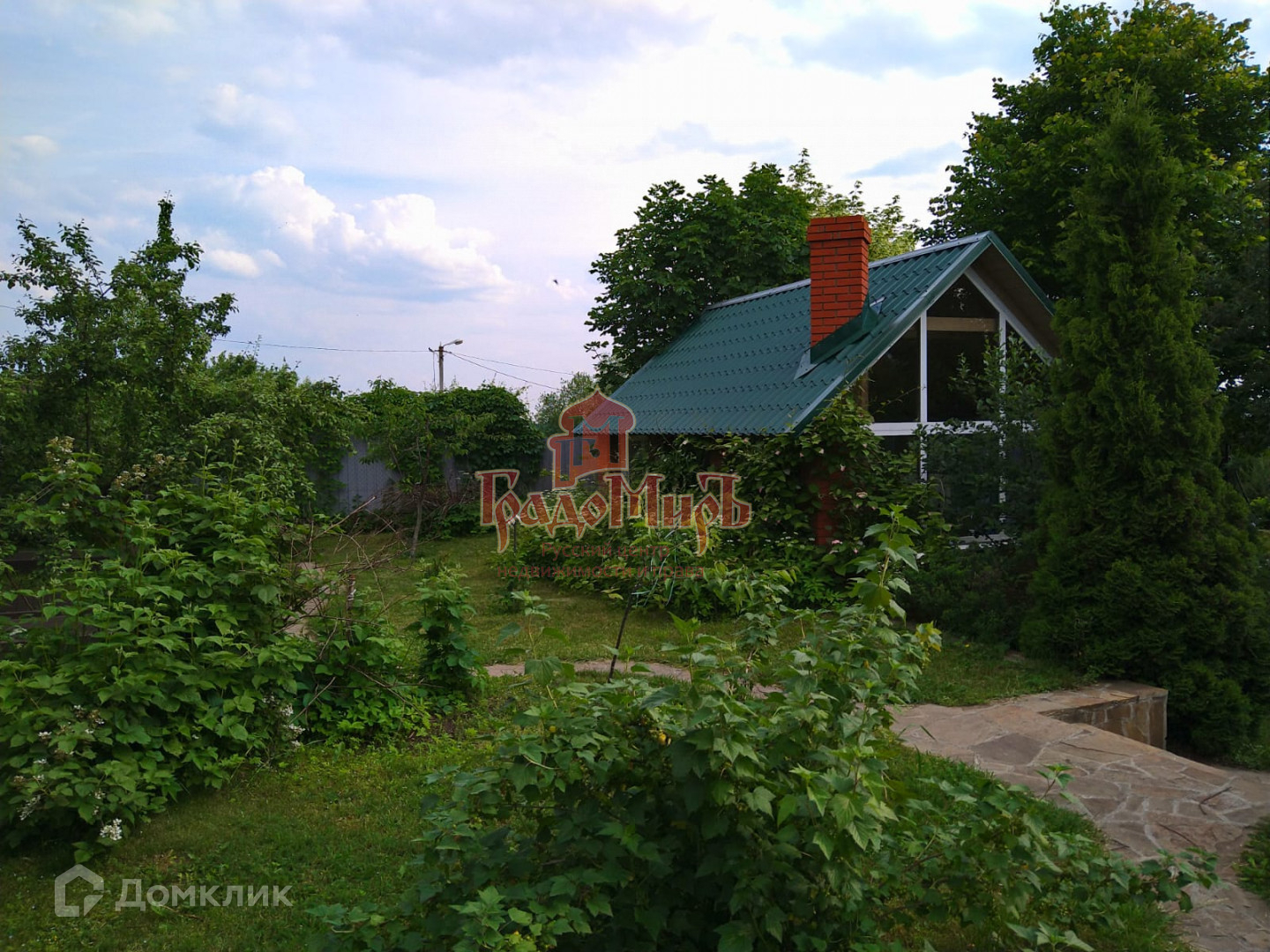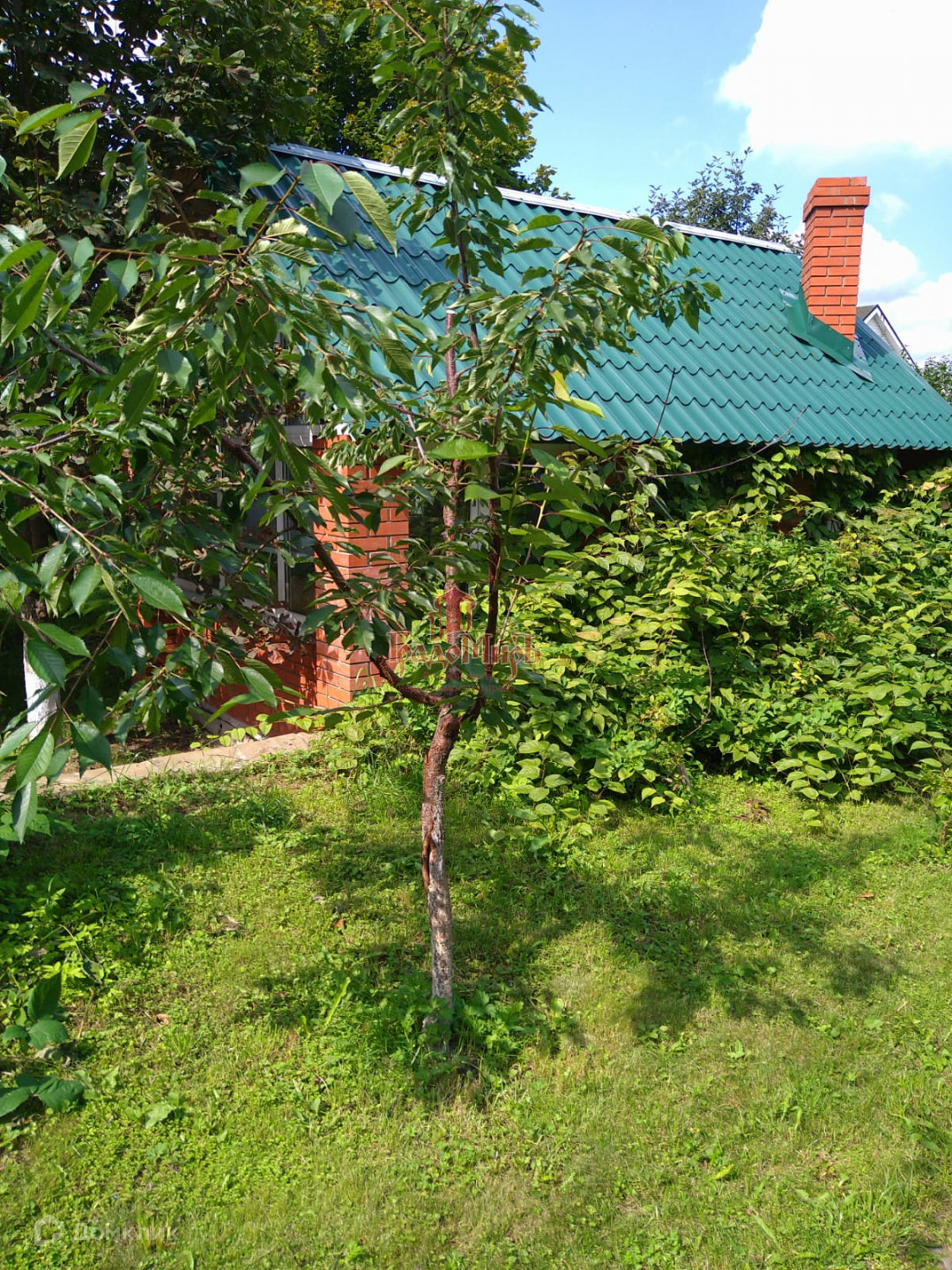 Ухоженный участок с газоном, плодовыми деревьями, кустарниками и теплицей.