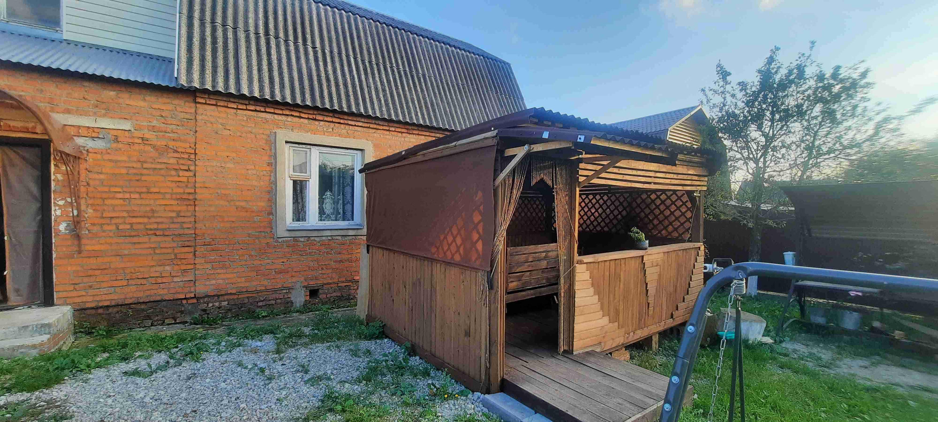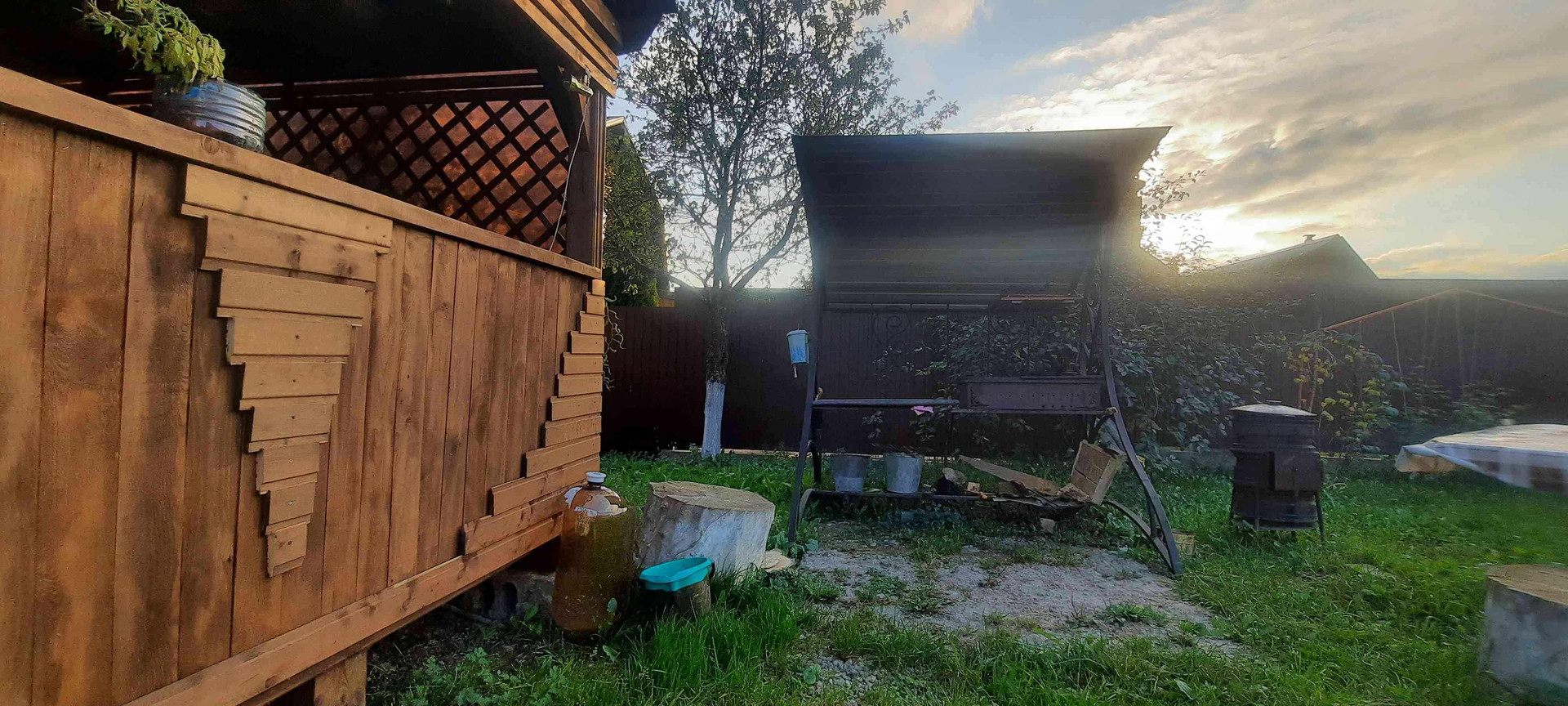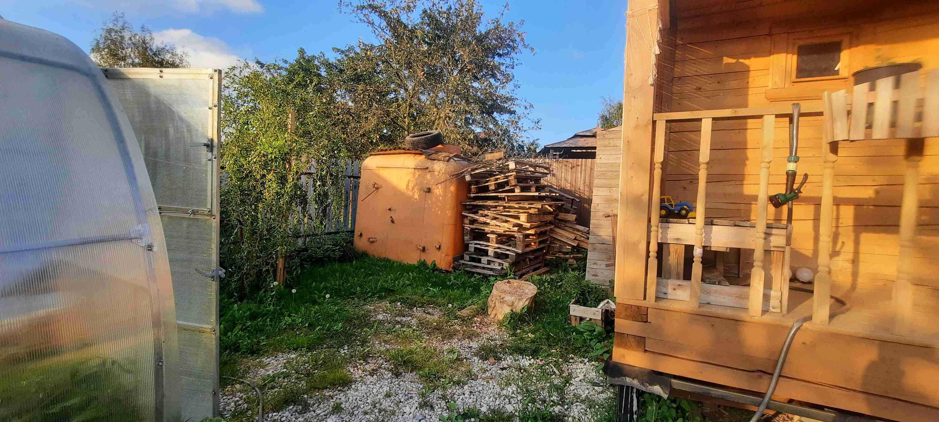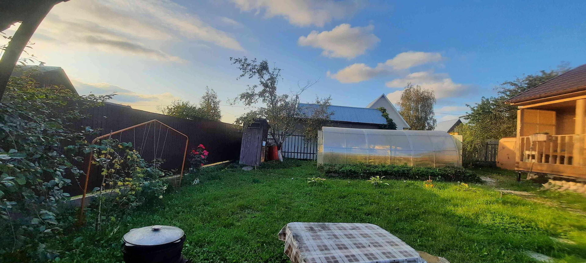 6 соток, сухой, ровный, прямоугольной формы огороженный по периметру забором из профнастила с калиткой и воротами. Парковочное место на 2 машины. На участке: дом (75 кв.м.), баня (5х6) с большой верандой и комнатой отдыха (12 кв.м.), беседка (3х4), мангальная зона, вагончик, теплица, много плодовых деревьев и цветов.