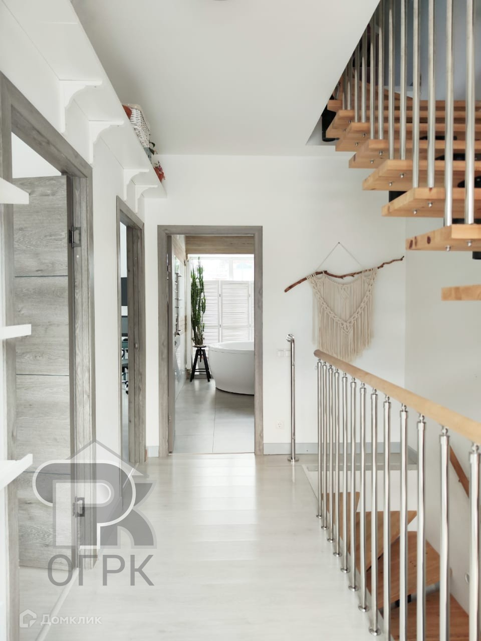На 2-ом этаже 2 спальни 13 м2 и 12 м2 и просторная ванная комната 10 м2 с глубокой круглой ванной и панорамным окнами. В одной из спален имеется гардеробная комната с организованной системой хранения 5 м2. Два панорамных окна наполнят комнату светом. Вторая комната также имеет два окна и удобную планировку. Просторный коридор 6,16 м2 имеет выход на балкон 5,1 м2, на котором летом вы сможете наслаждаться потрясающими закатами. На полу лежит светлый ламинат.