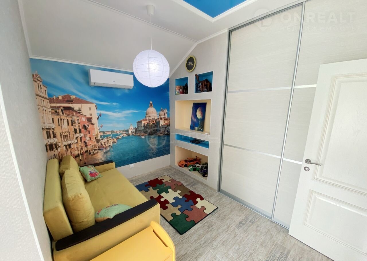 На первом этаже: санузел, гостевая, детская, кухня гостиная, прихожая, бойлерная, выход на улицу во двор, гардеробная.