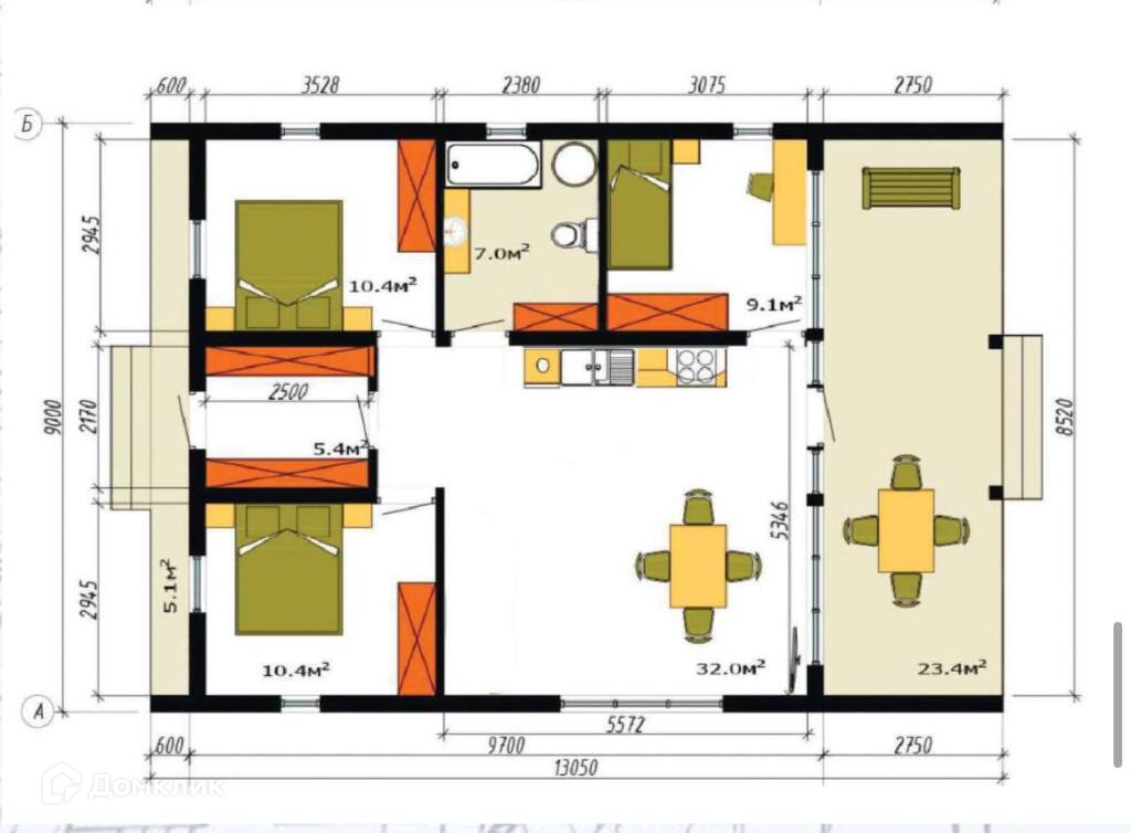 Внутреннее пространство дома разделено на кухню-гостиную площадью 30 кв.м и три отдельные спальни. Панорамные окна и высокие потолки высотой 3,50 м создают ощущение простора и света. Дополнительно имеется просторная веранда площадью 23,4 кв.м, идеальное место для приятного времяпровождения на свежем воздухе.
