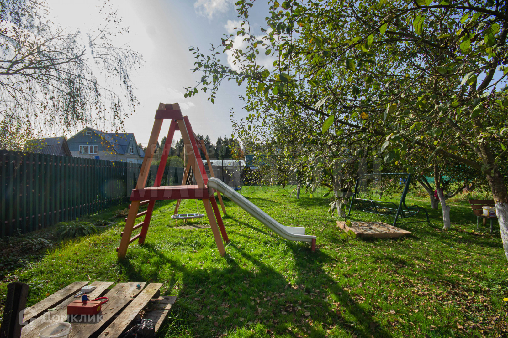 Огорожен металлопрофилем + евроштакетник.