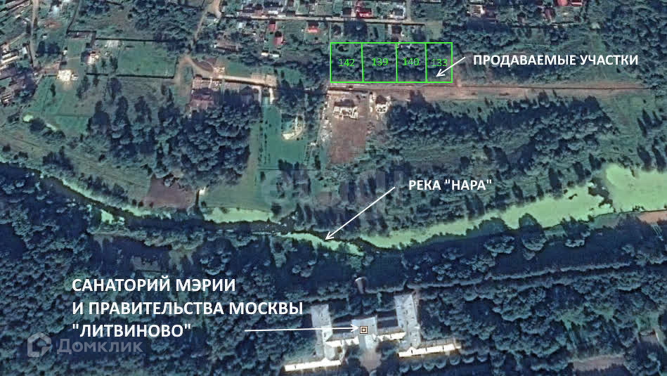 Участок находится в 250 метрах от реки Нара, которая в этом месте делает поворот. Есть место для купания. ядом Графские пруды и два озера. Место тихое и спокойное. Напротив через реку располагается санаторий Правительства и Мэрии Москвы - "Литвиново",расположенный на территории старинной усадьбы с парком.