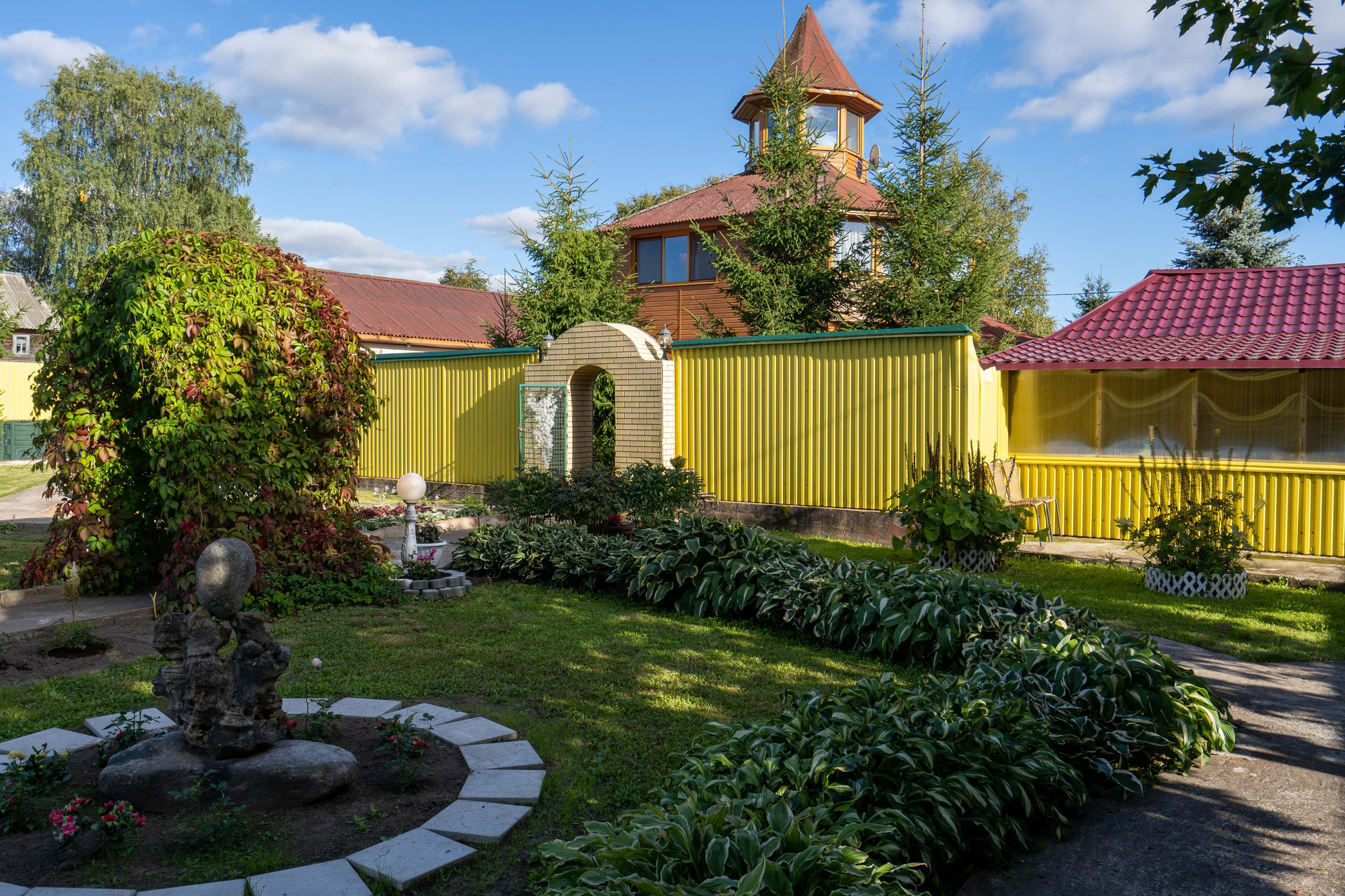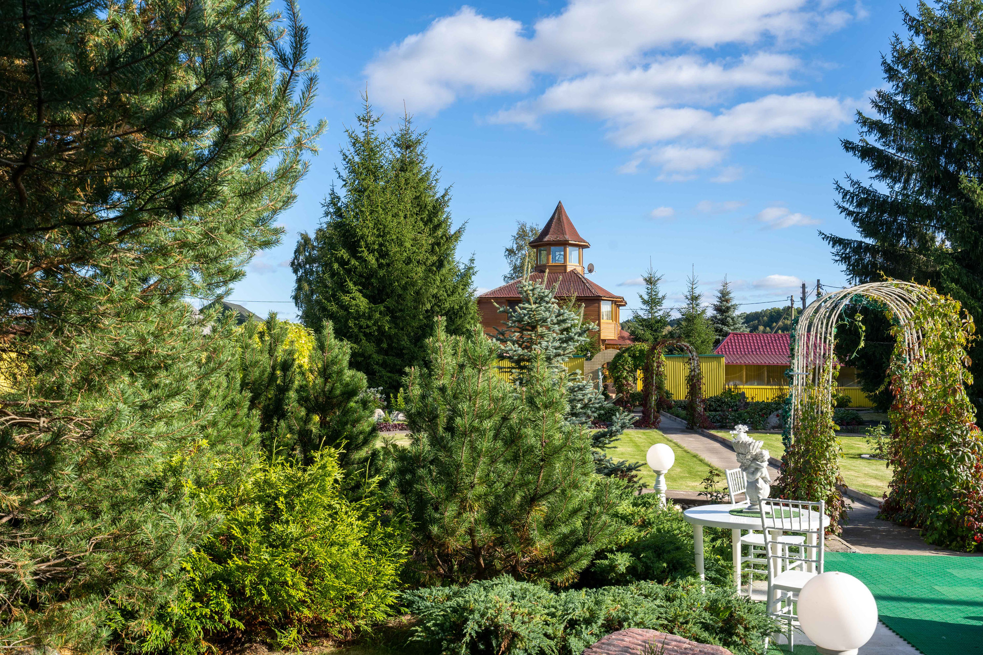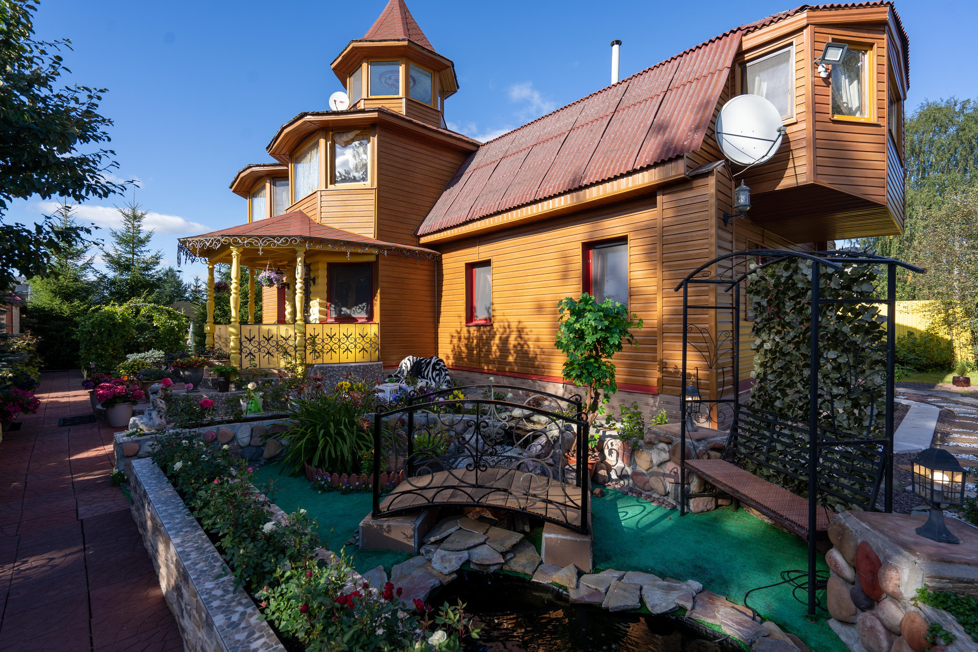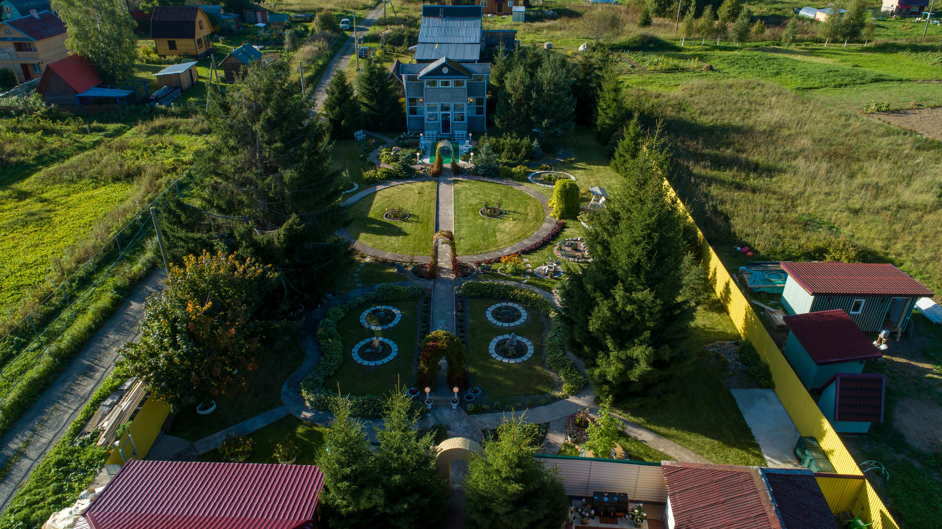 На участке: пруды, фонтанчики, гроты, альпинарии, зоны барбекю.