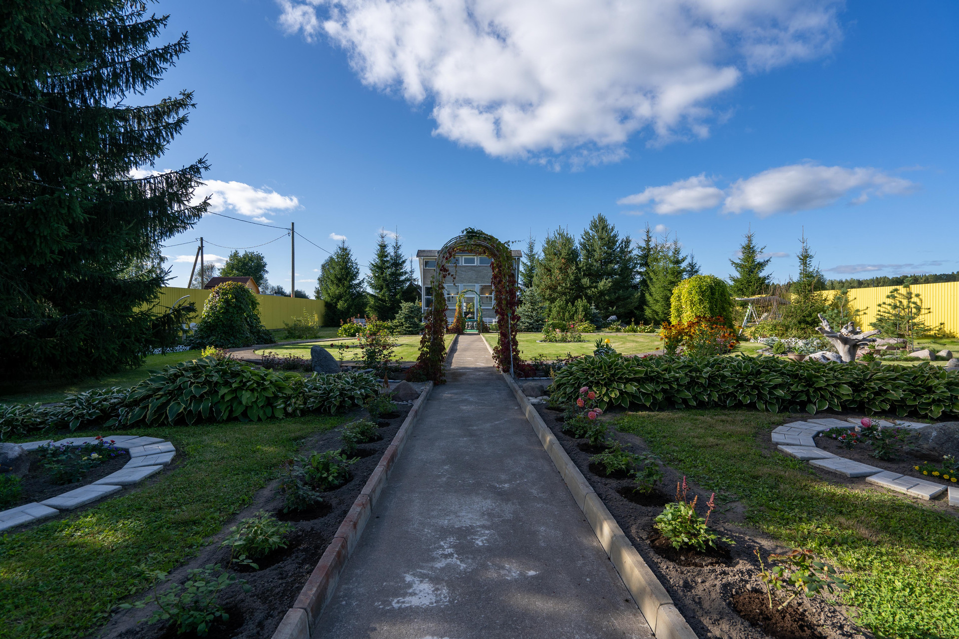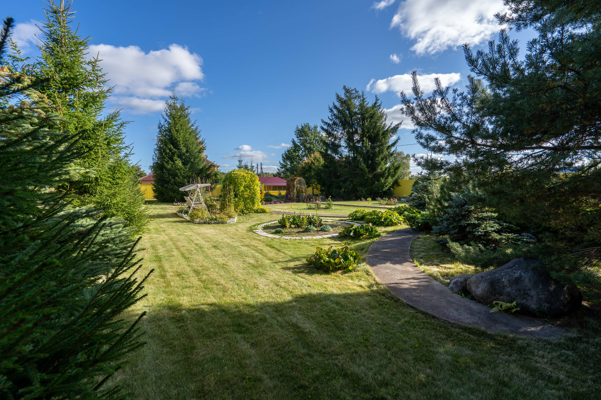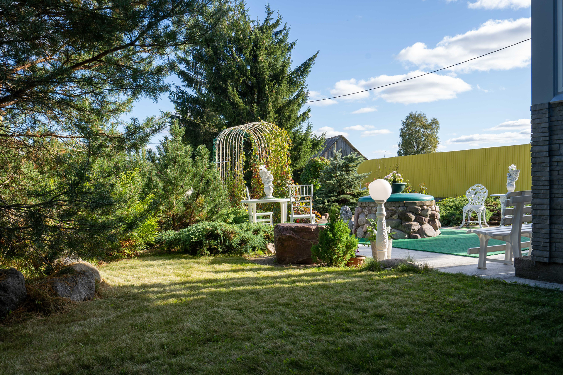 На участке: пруды, фонтанчики, гроты, альпинарии, зоны барбекю.