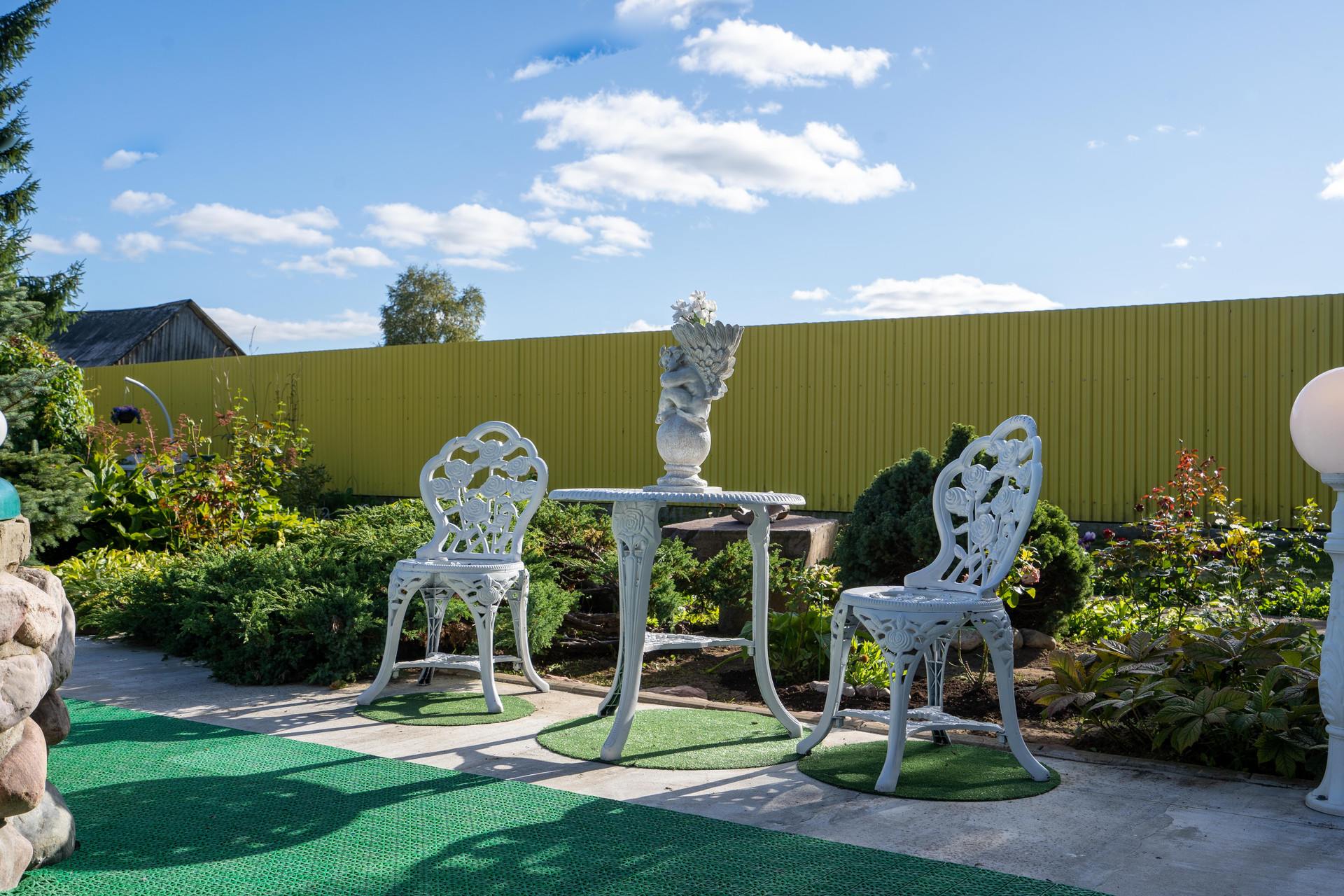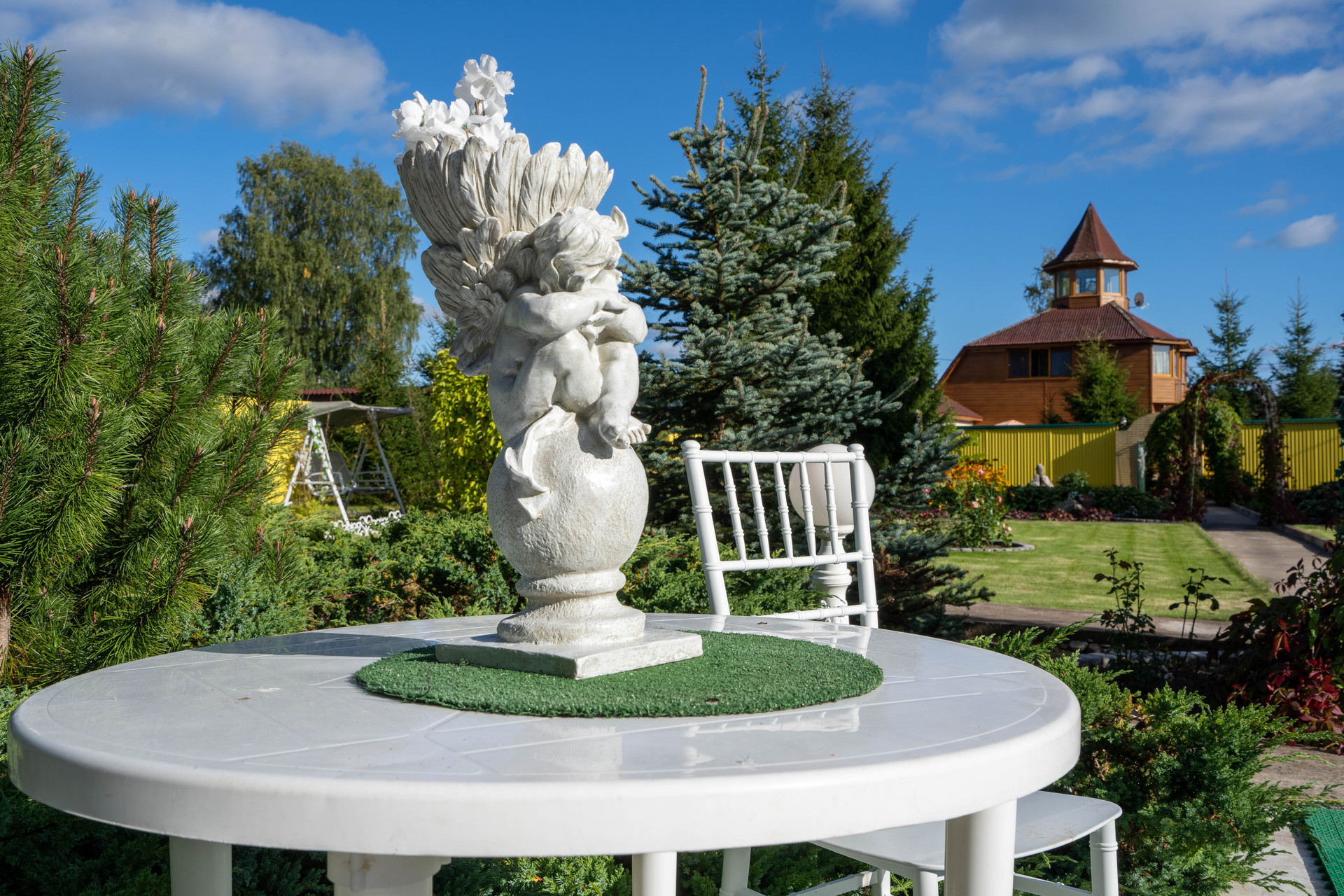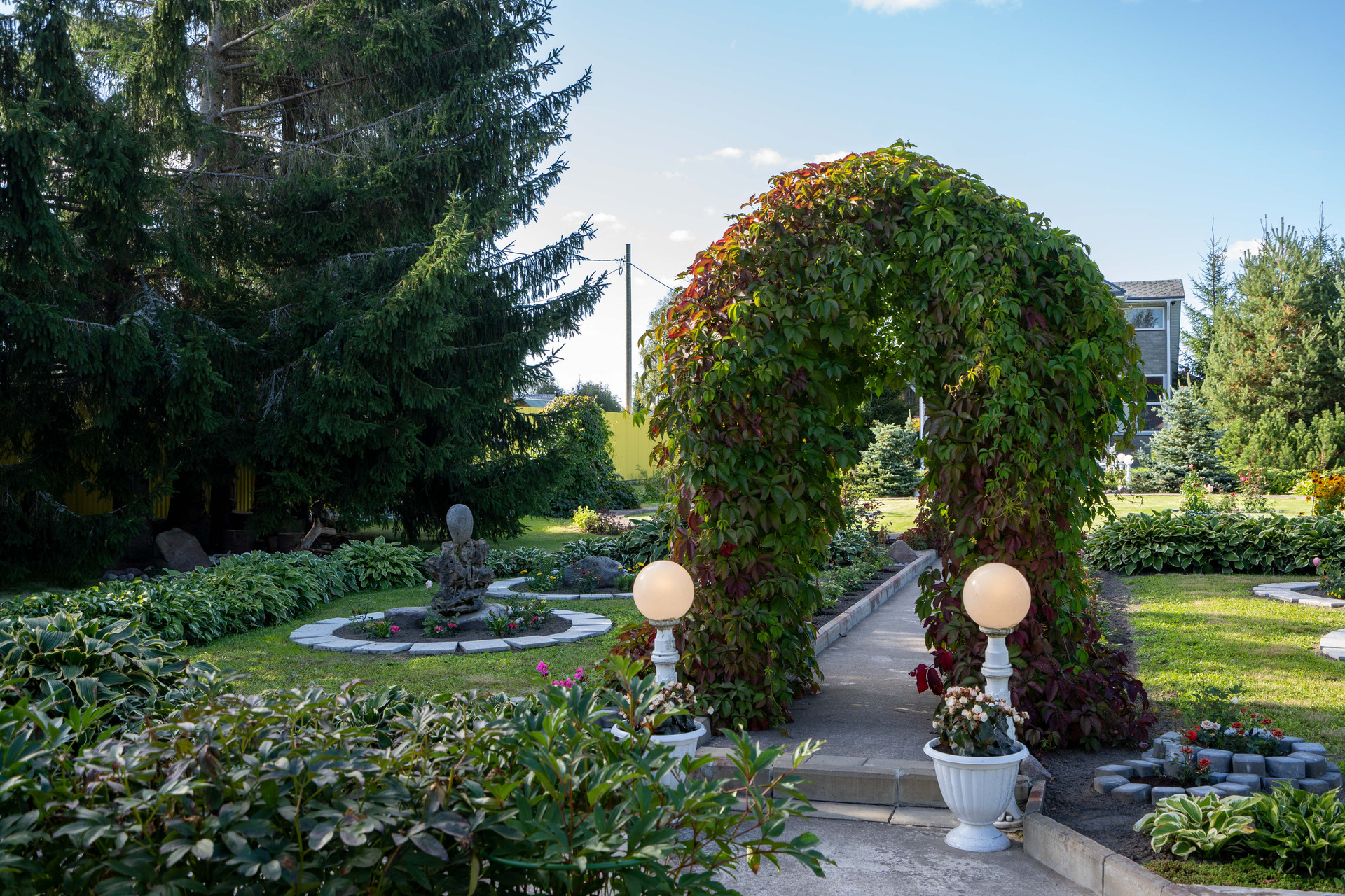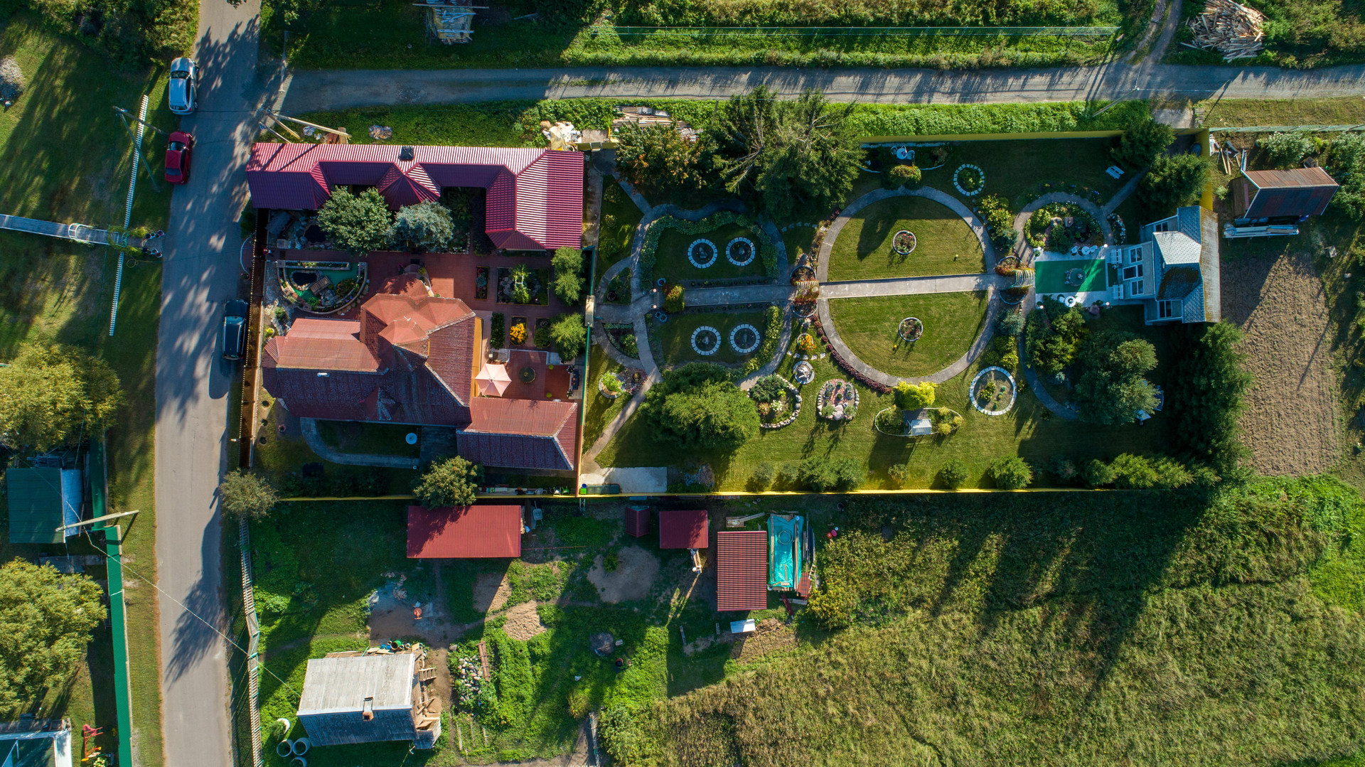 На участке: пруды, фонтанчики, гроты, альпинарии, зоны барбекю.