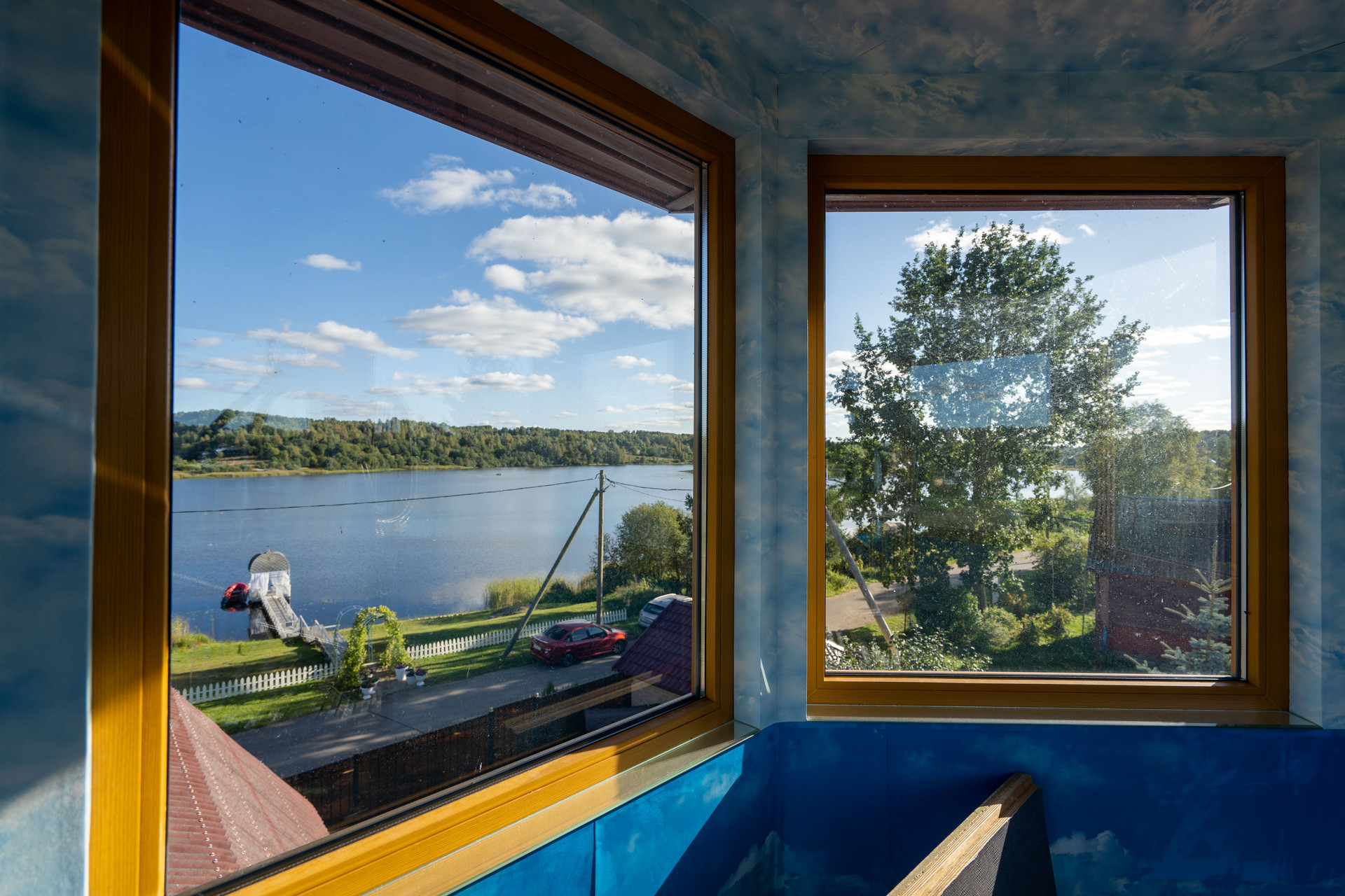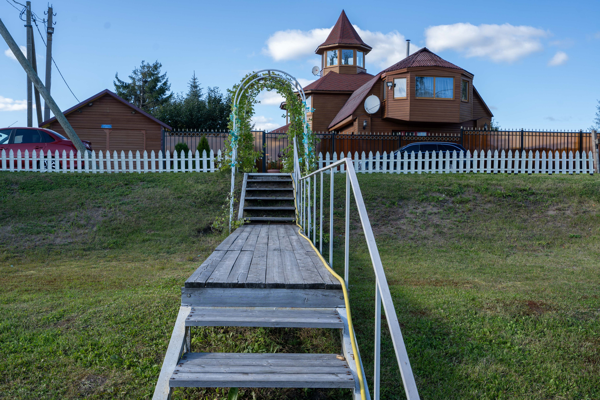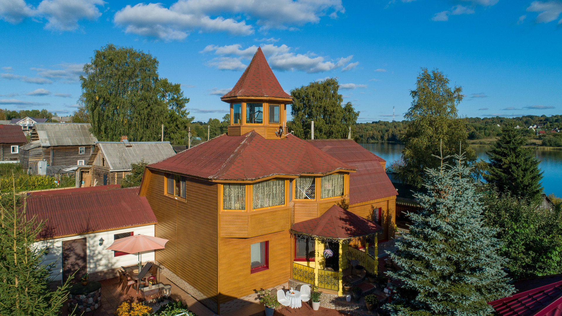 Парк и участок 21 сотка, плюс берег 4 сотки. Зимний дом 155 м², монплезир 60 м², гостевой дом 52 м², летняя кухня-гостиная 40 м² и два гаража.