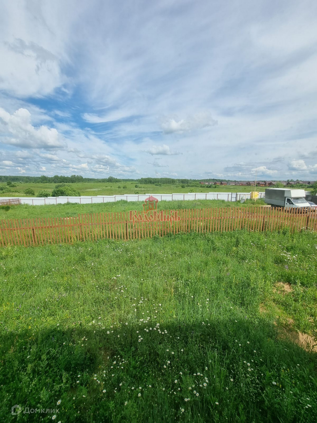 11 соток, правильной прямоугольной формы. Огорожен деревянным штакетником, есть калитка