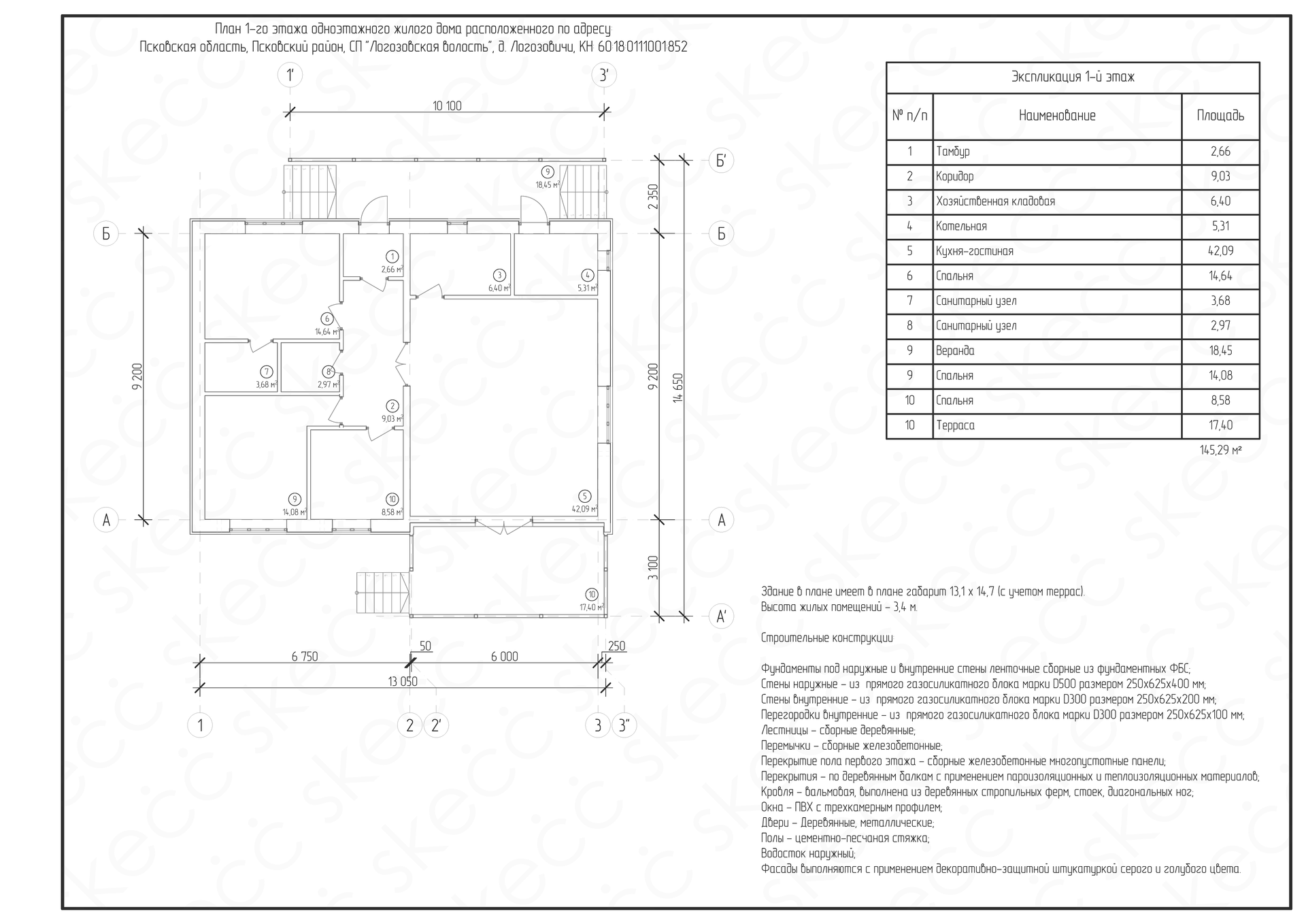 Продается одноэтажный жилой дом в деревне Логозовичи, расположенный на участке 12 соток в 11 км от города Пскова. Дом построен из надежных и безопасных материалов, обладает отличной тепло- и звукоизоляцией благодаря толстым стенам из газосиликатного блока, утепленных и отштукатуренных, а также железобетонным перекрытиям и фундаментам. Кровля дома вальмовая, выполнена из деревянных ферм и имеет покрытие металлочерепицы. Высота потолка 3,4 м, что создает ощущение пространства и воздуха. Дом имеет удобную и функциональную планировку: три комнаты (8,6+14,6+14,1 м. кв.), два санузла, тамбур, коридор, кладовую, котельную, кухню-гостиную и две террасы (18,5+17,4 м. кв.). Дом светлый и воздушный, имеет много окон и выходов на террасы.