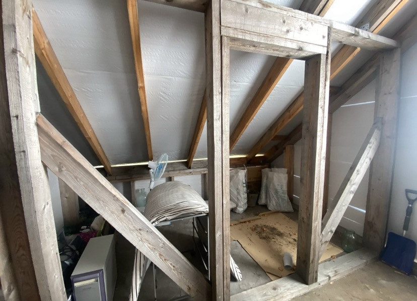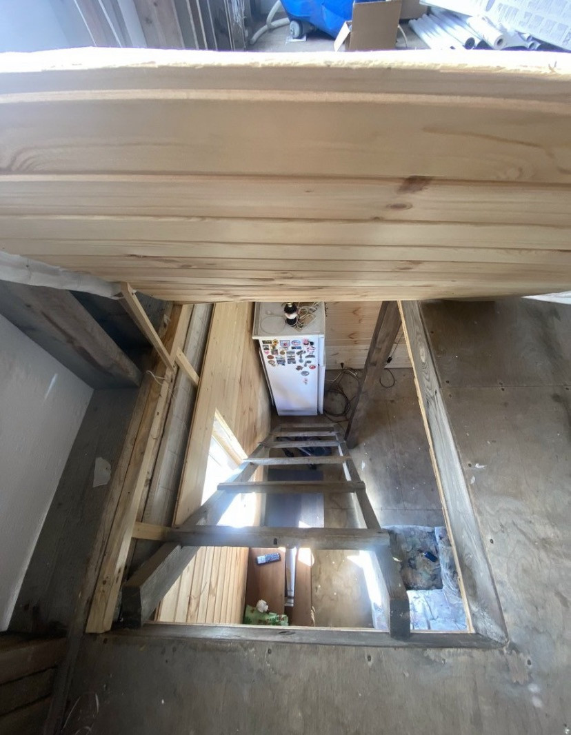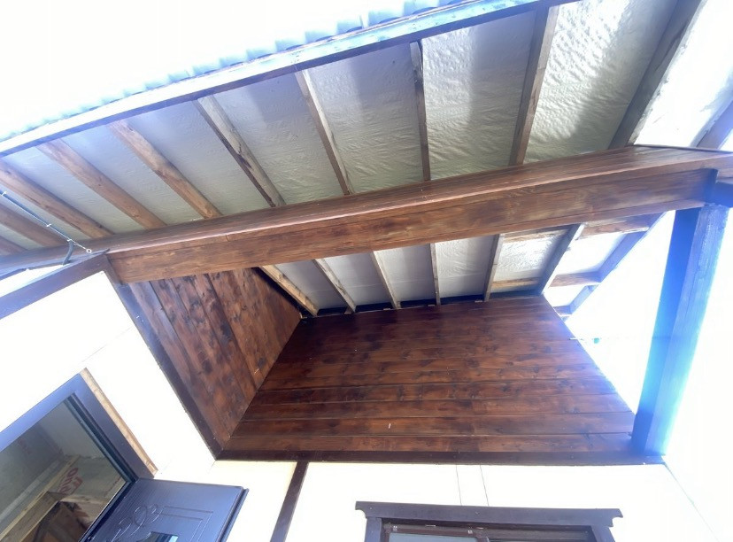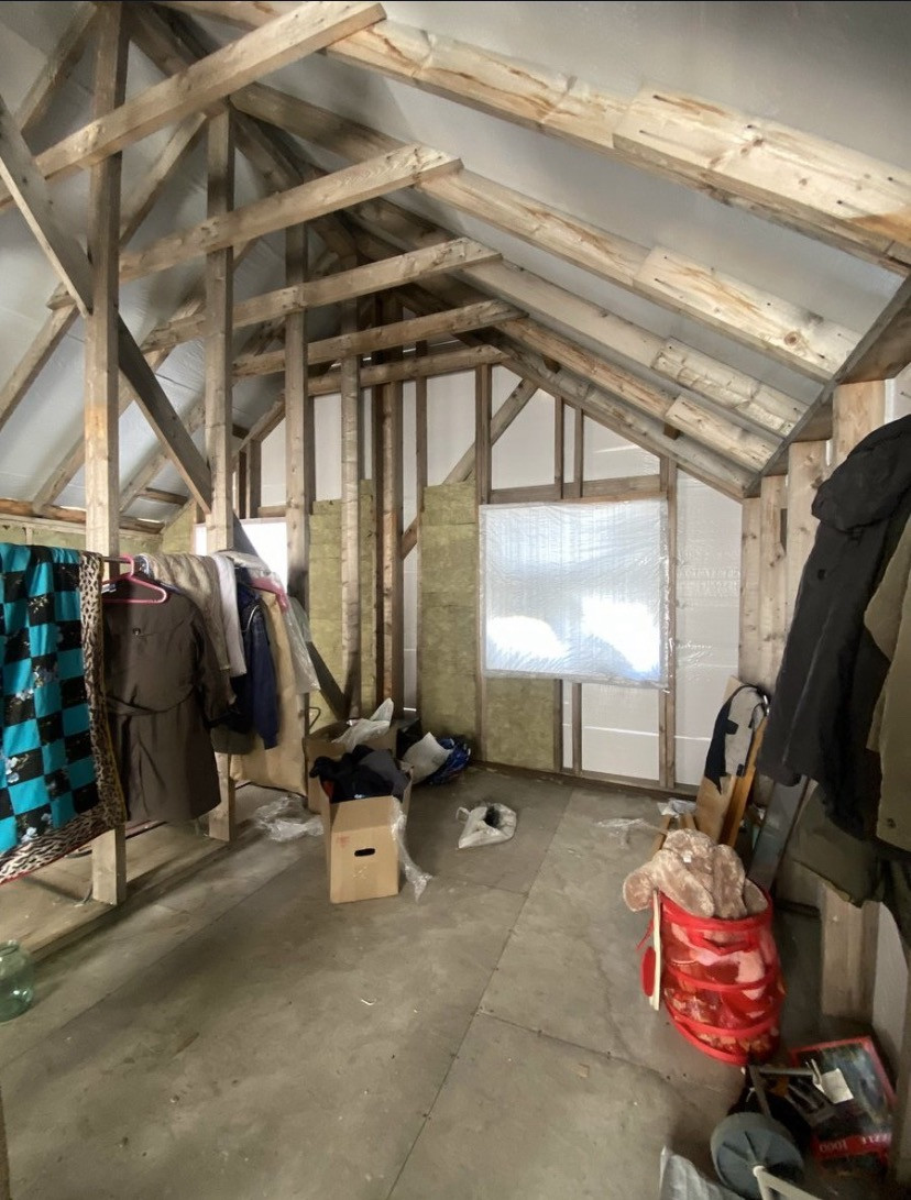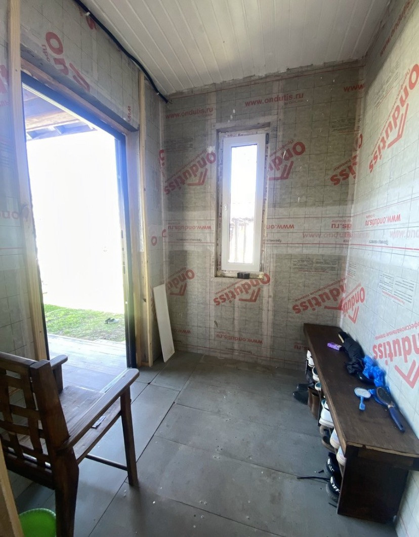 Первый этаж- терраса под крышей, тёплый тамбур, холл, санузел, спальня, просторная кухня-гостиная.