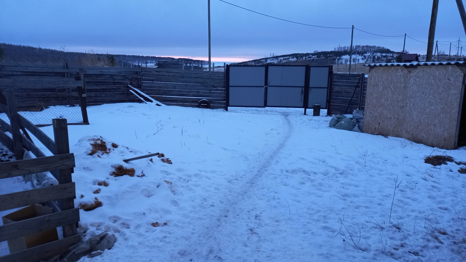 Участок ровный без склонов, огорожен. Ворота из металлопрофиля, распашные.