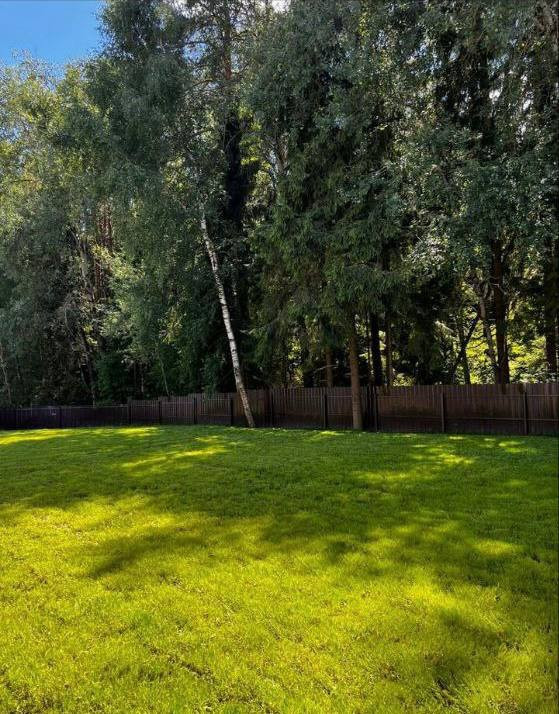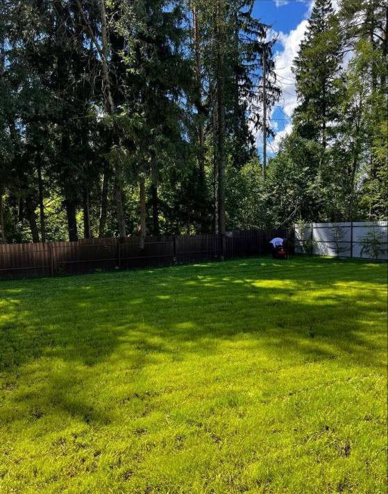 Участок правильной формы,выровнен,покрыт геотекстилем с засыпкой черноземом и посеяна многолетняя трава,высаженные дополнительные зеленые насаждения,построен забор на капитальном фундаменте из металлопрофиля с откатными воротами.