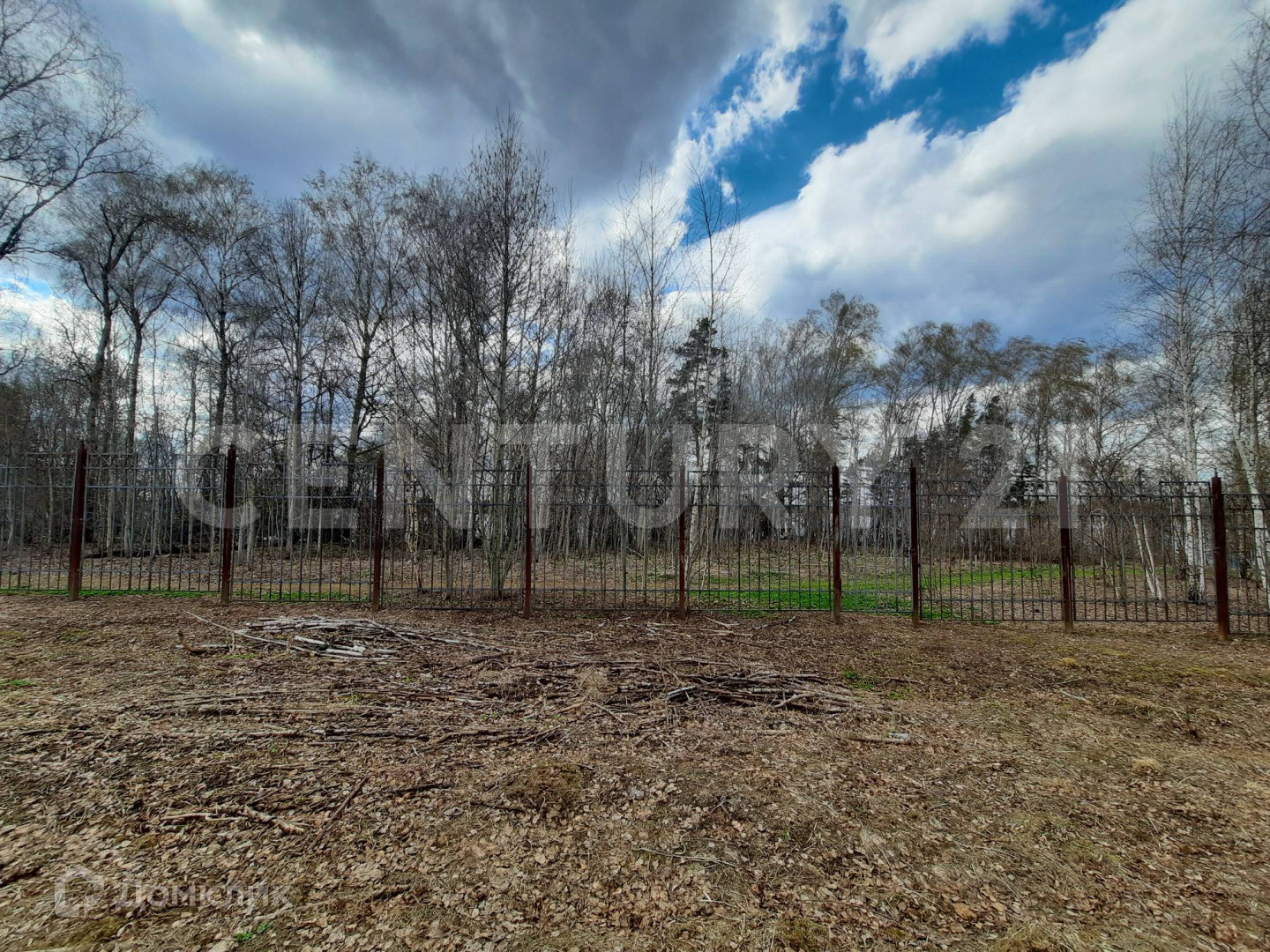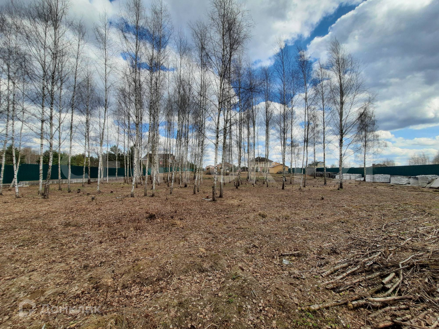 На участке растут взрослые деревья: березы и несколько сосен.