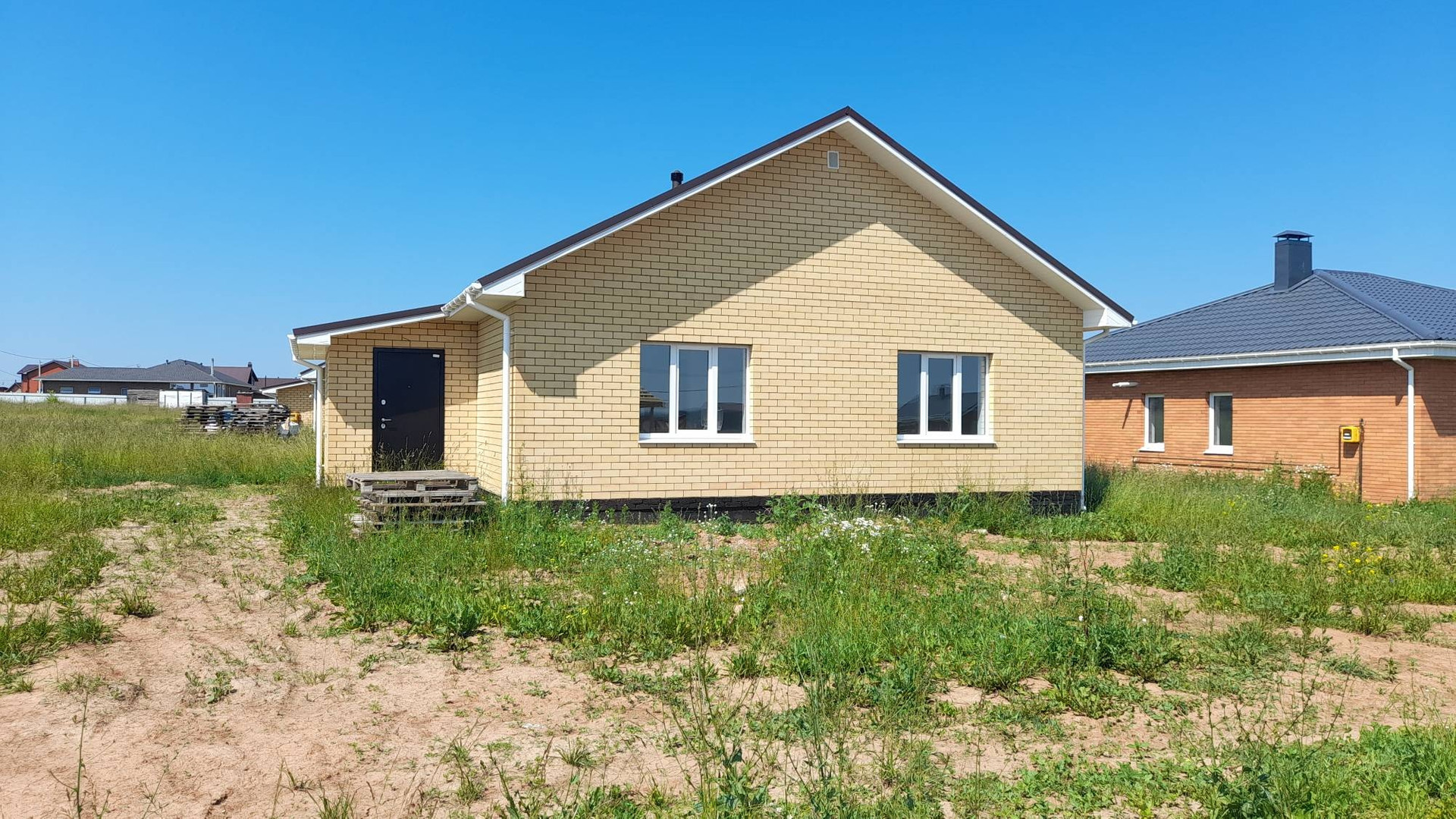 Дом в д. Лудорвай ул. Изумрудная 8. В доме три спальных комнаты, кухня-гостинная, прихожая, ванная и с/у, входная группа в которой расположена котельная и вся разводка. Везде теплые полы, Газ, вода, электричество, канализация, все в доме, стены оштукатурены и отшпаклеваны под обои. Стоит двухконтурный газовый котел. По деревне новая асфальтированная дорога, до дома 200м по отсыпаной дороге, зимой чистят без проблем, по улицам освещение, мусор вывозят, не коттеджный  поселок. В деревне есть мед.пункт, школа, дет.сад (в 2022 сдача нового), почта, аптека, магазины. ходят автобусы три маршрута.