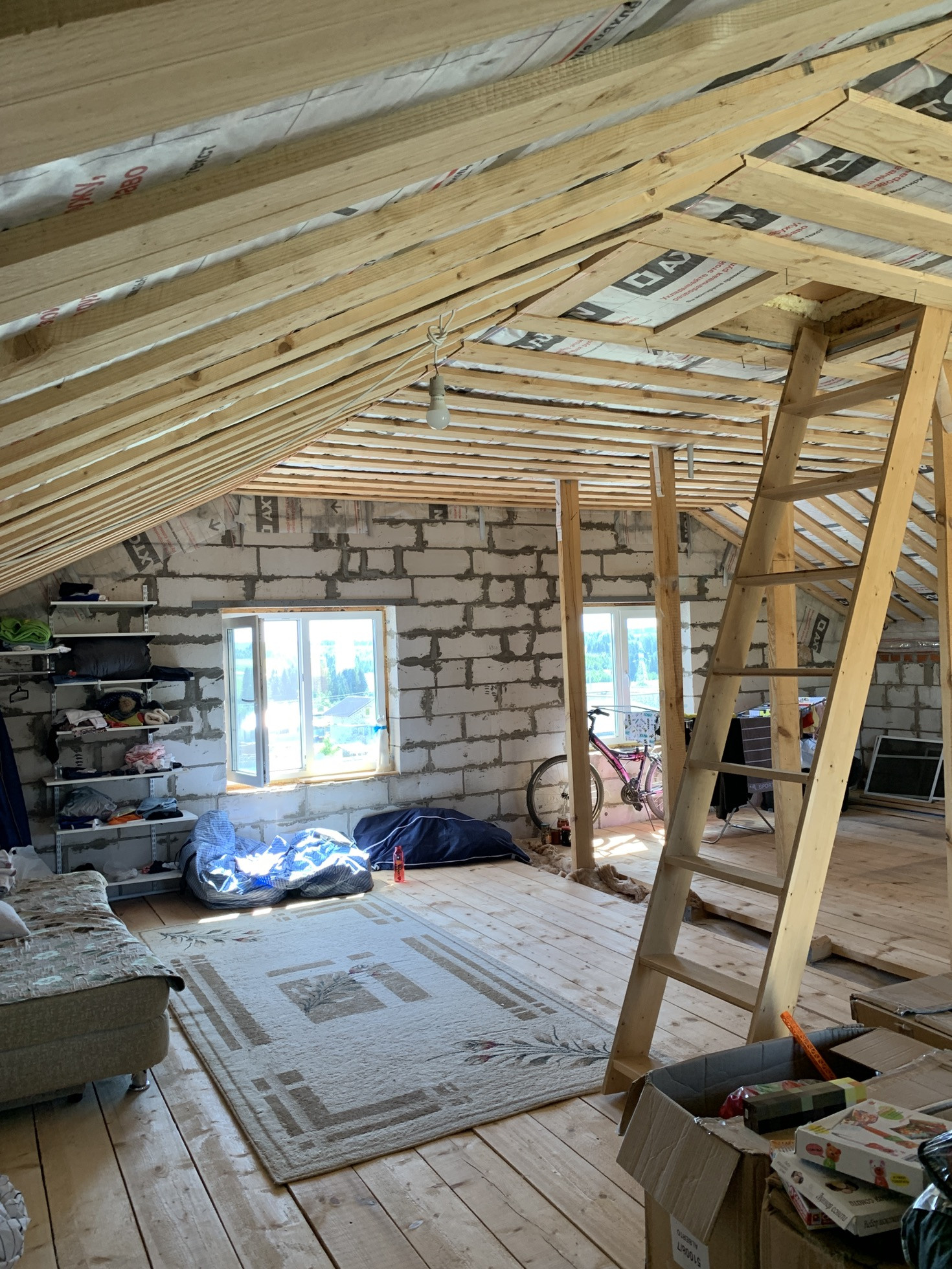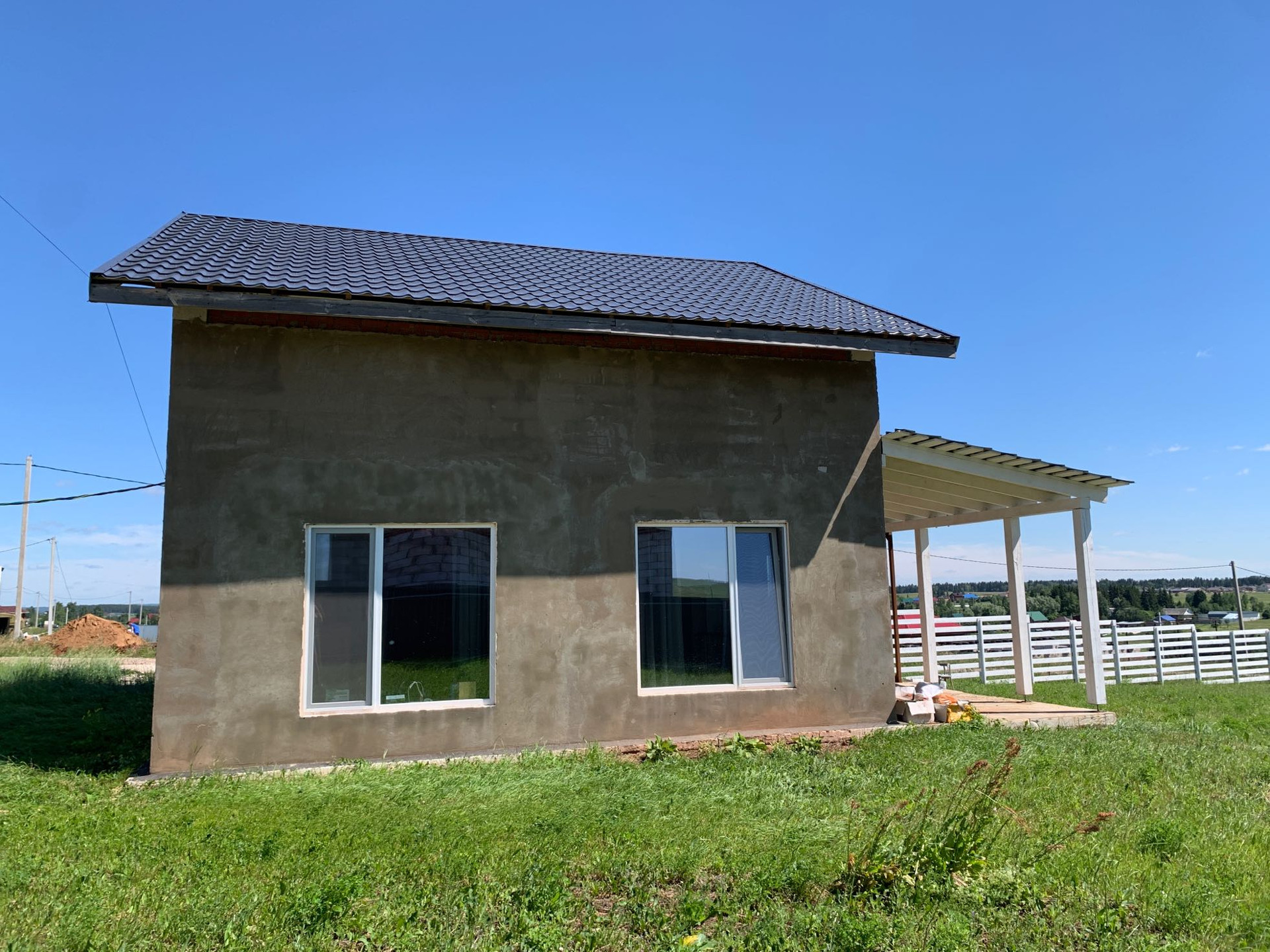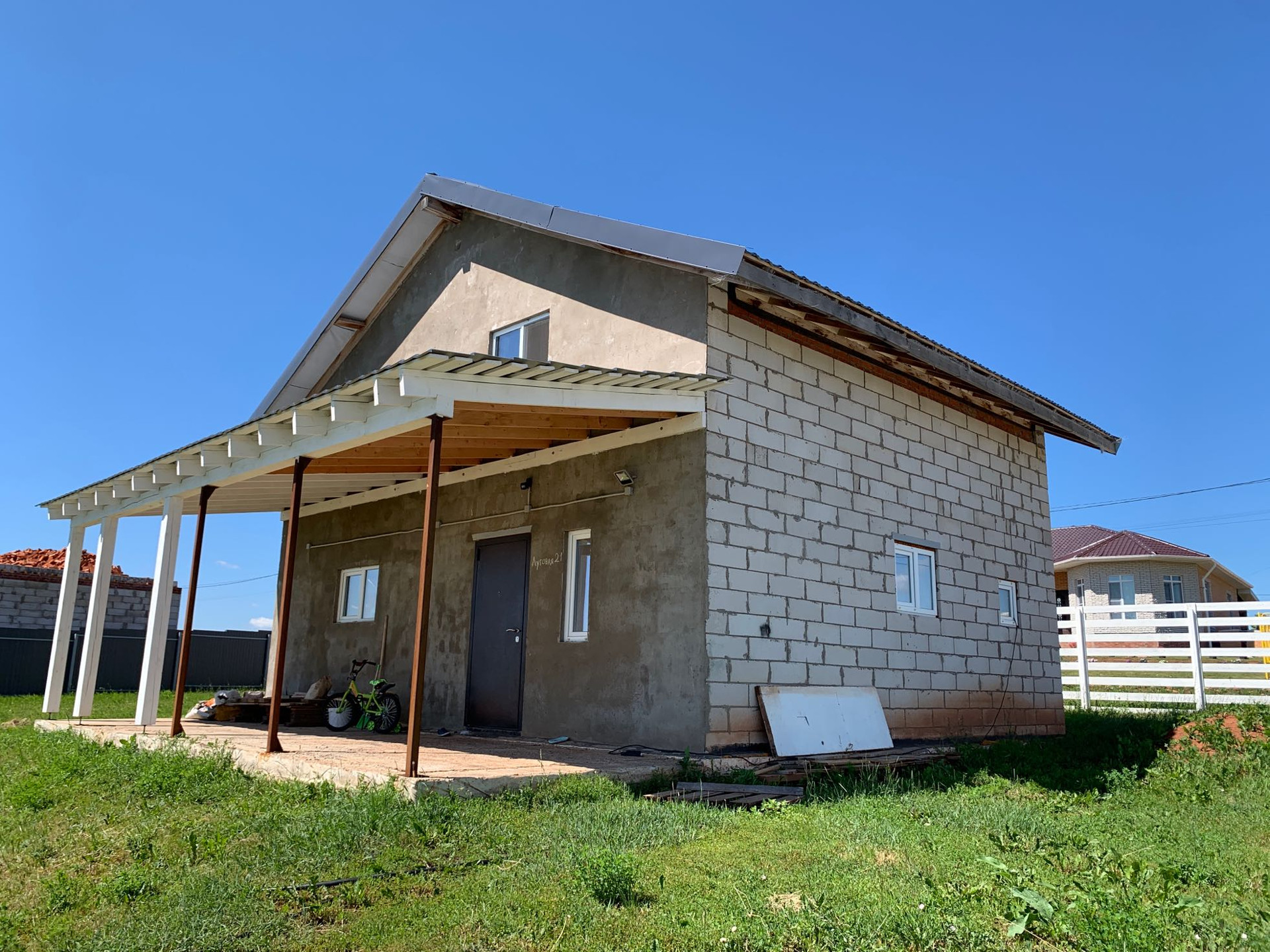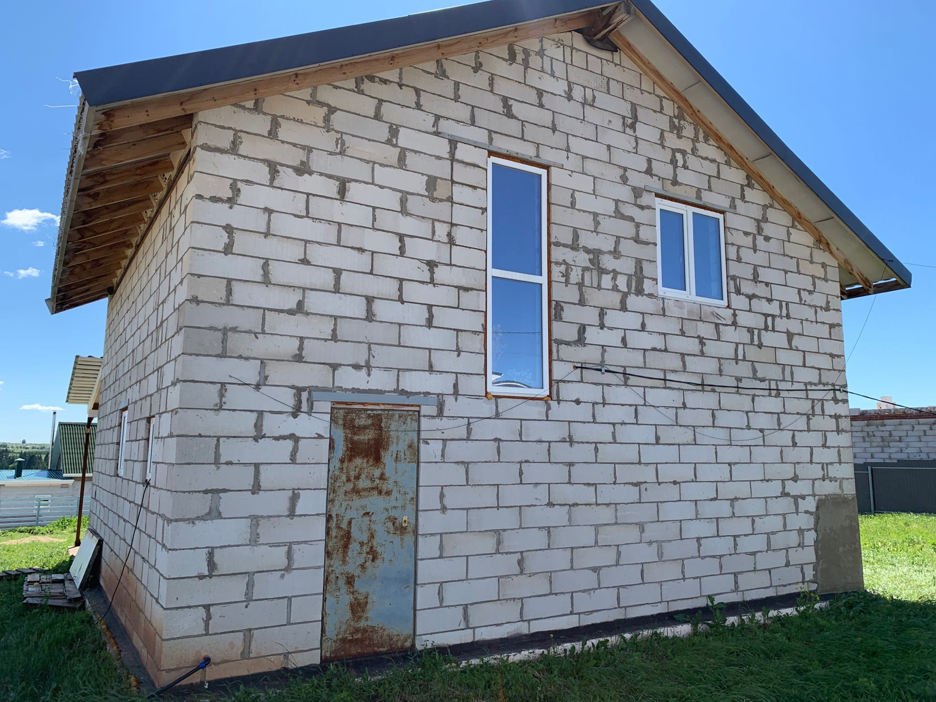 Готов к проживанию. Готовый первый этаж, но нет потолков и стены просто отштукатурены, второй нужно довести до ума. Всё утеплено.