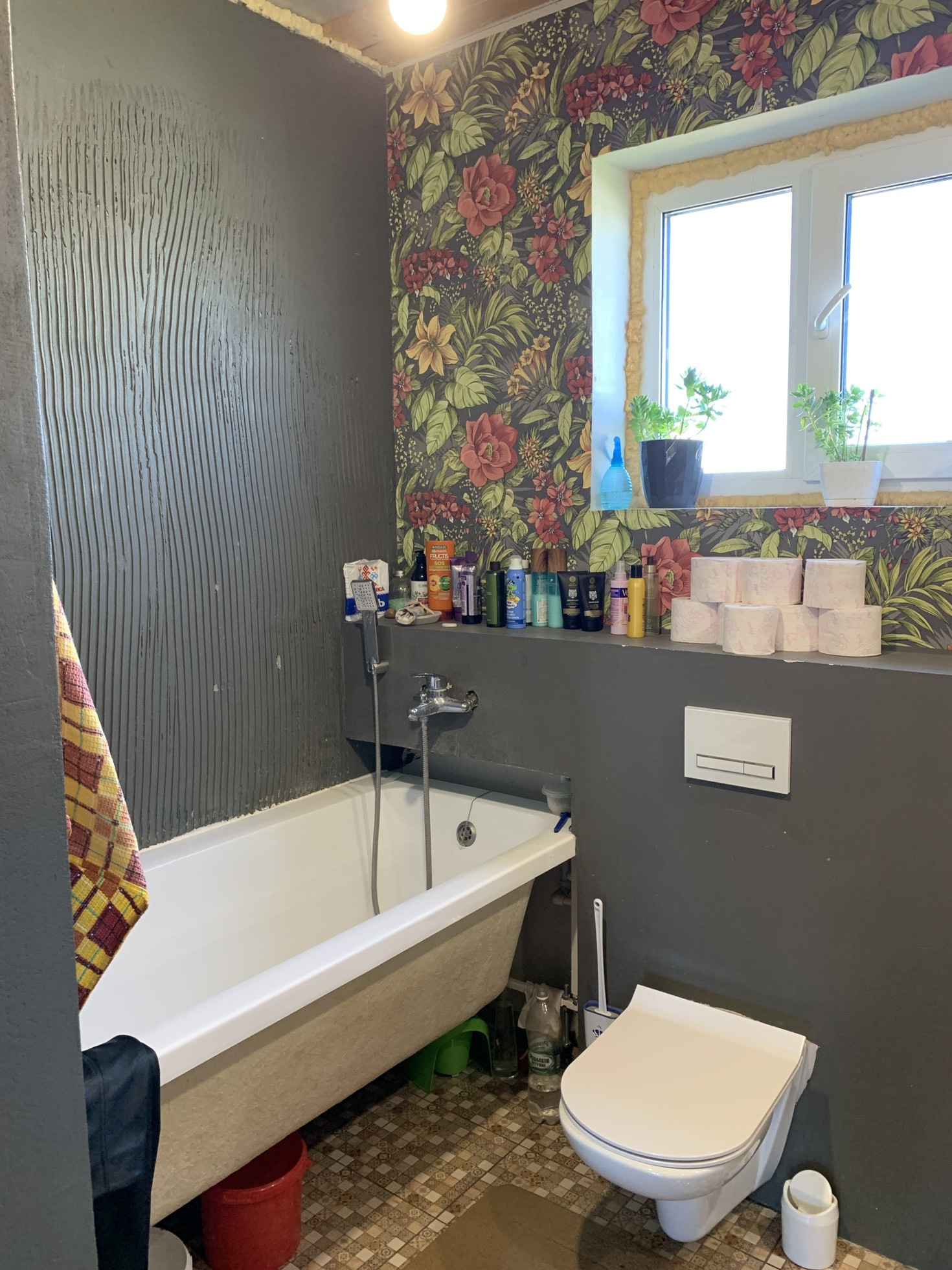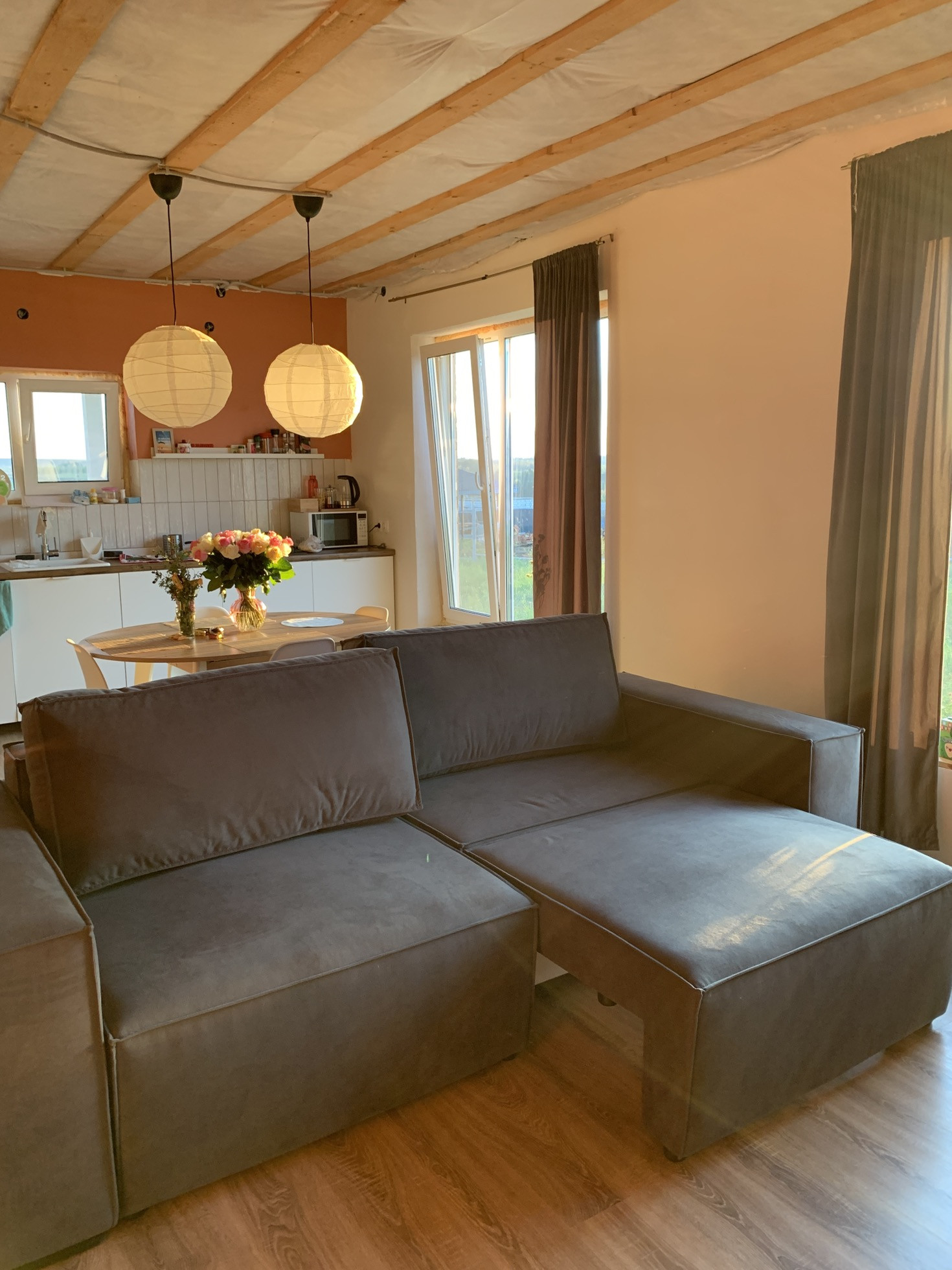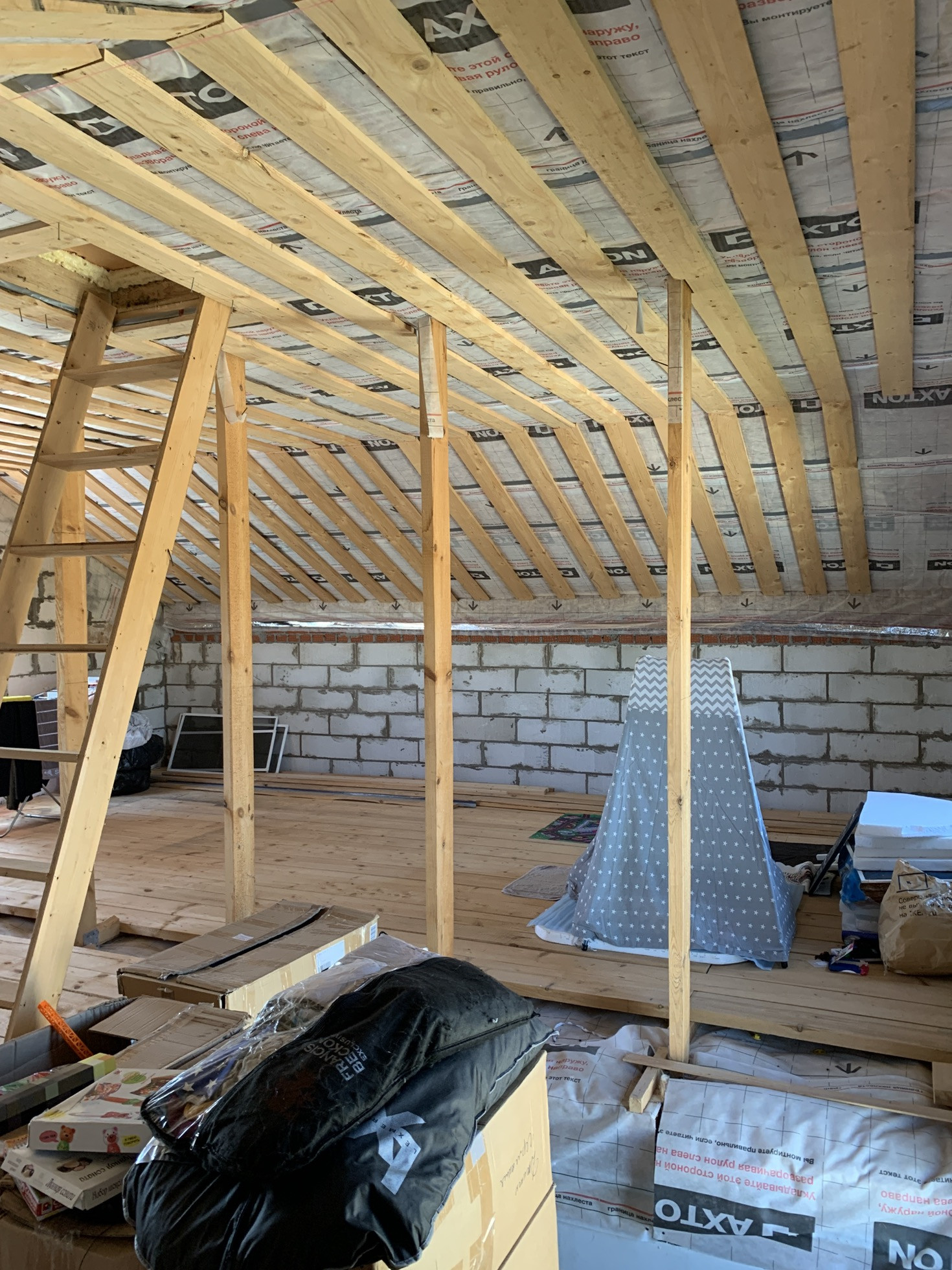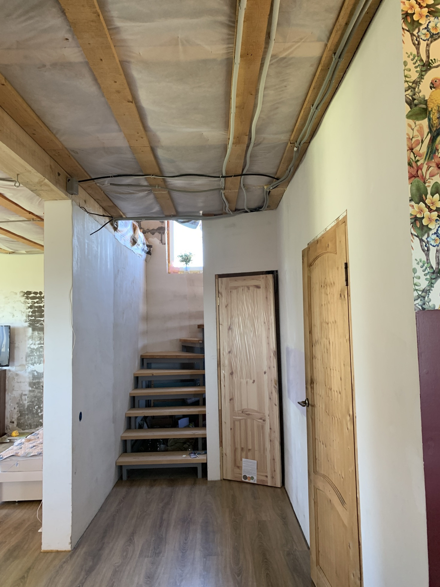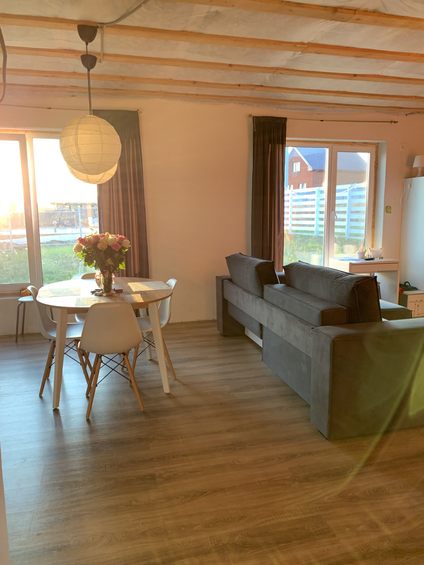 Готов к проживанию. Готовый первый этаж, но нет потолков и стены просто отштукатурены, второй нужно довести до ума. Всё утеплено.