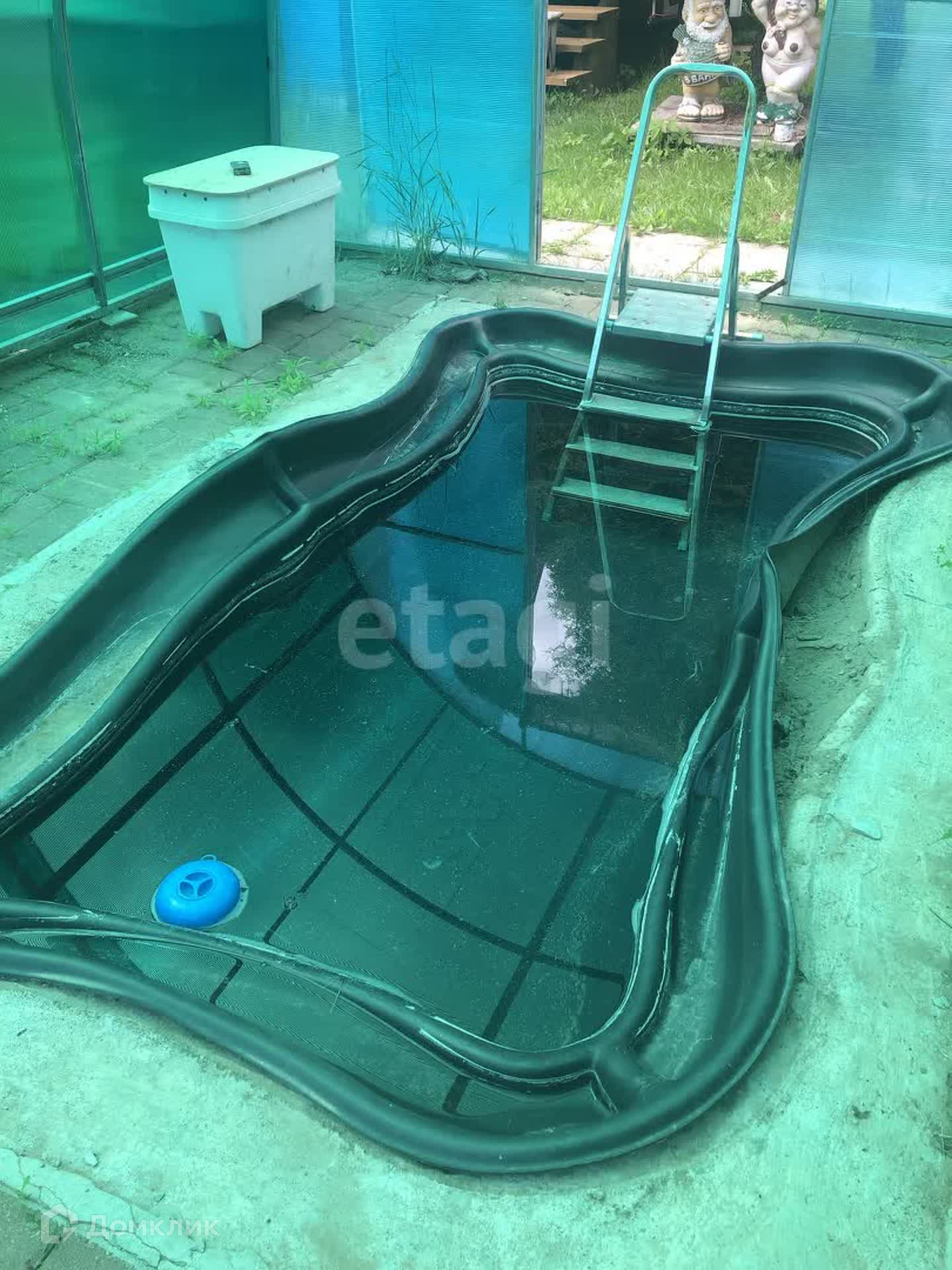 При выходе из бани бассейн, с навесом. Можно пользоваться в любую погоду, зимой окунуться после баньки или летом спастись от жаркой погоды.