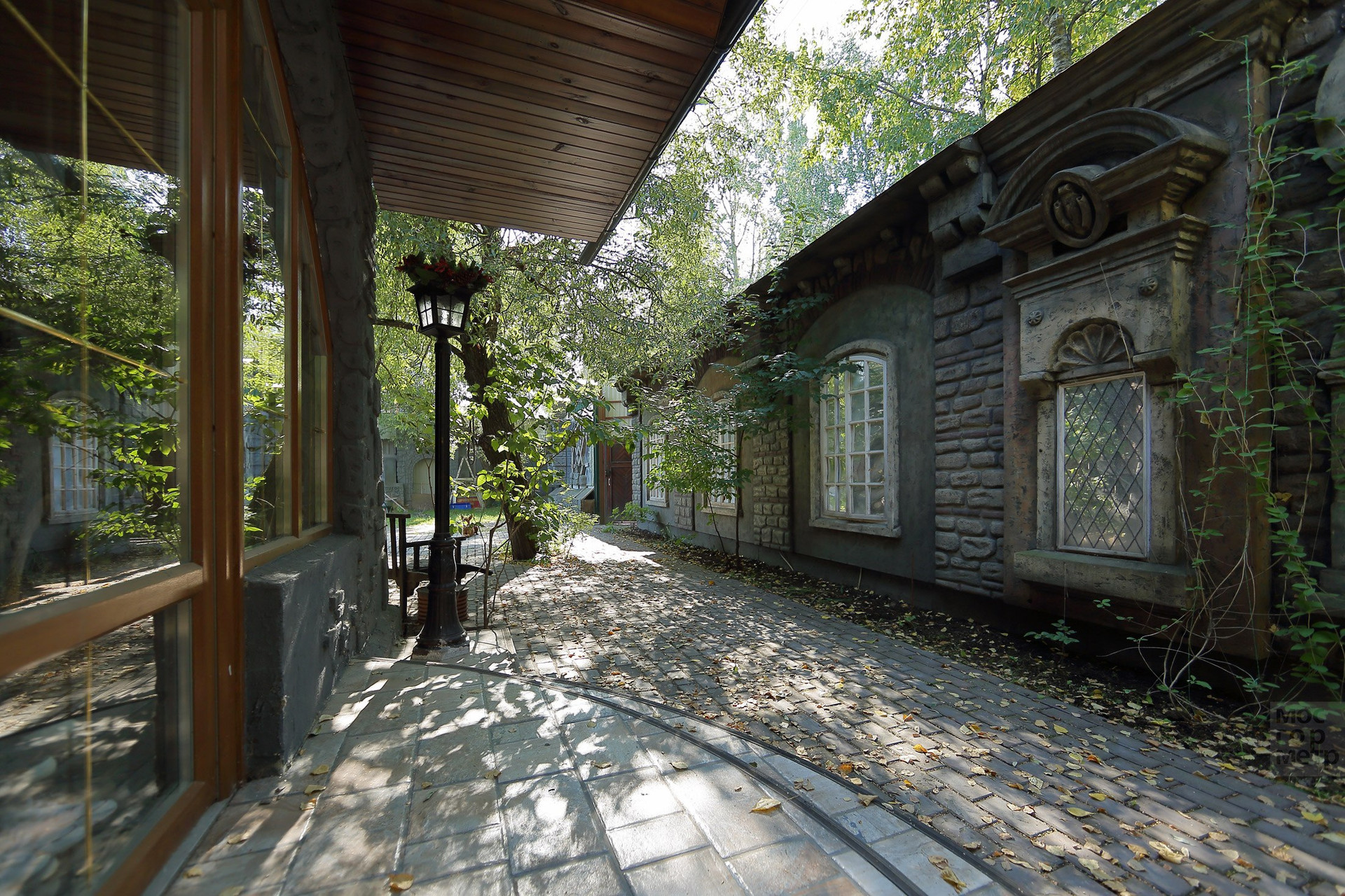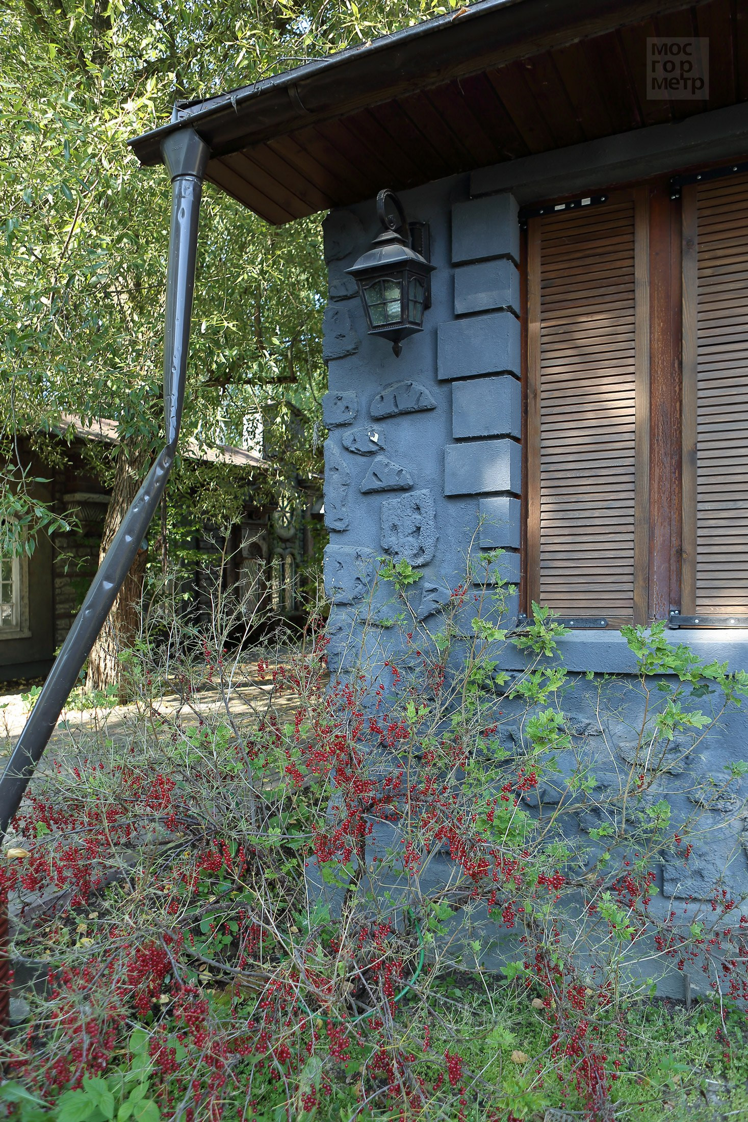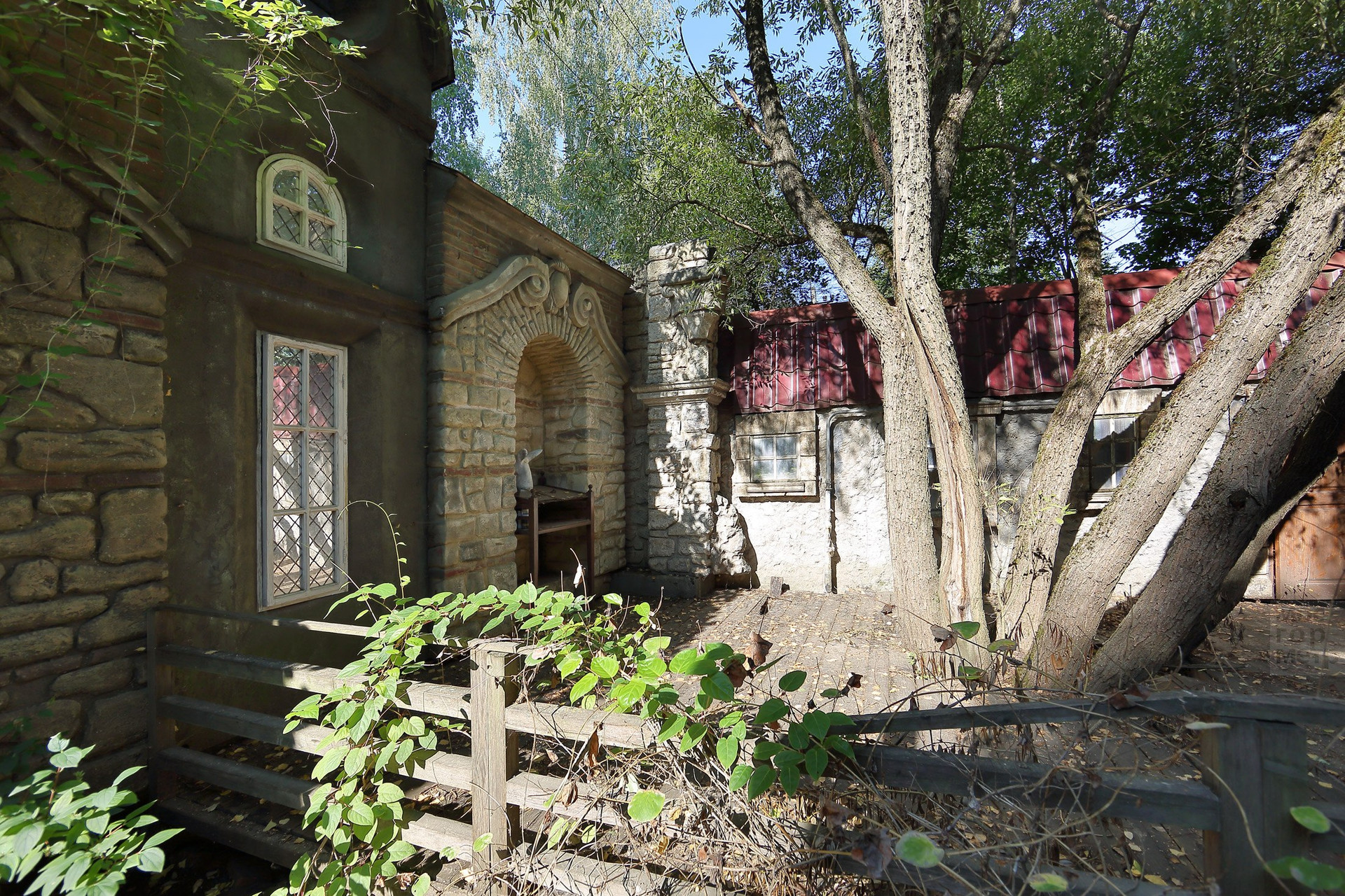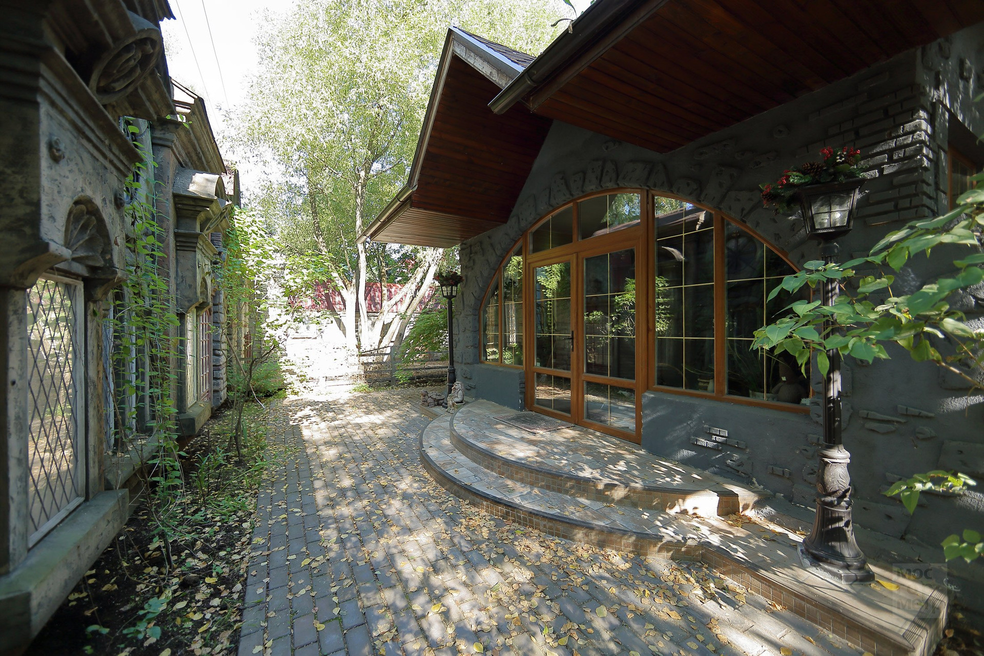 Интересное решение ограждения участка - высокий забор по периметру замаскирован и стилизован домики и улочки старинного городка. В оконцах включается подсветка. Возникает удивительное ощущение, что можно выйти на улицу, завернуть за угол и оказаться в новом для себя месте, пойти в кафе, выпить чашечку кофе и встретить друзей.