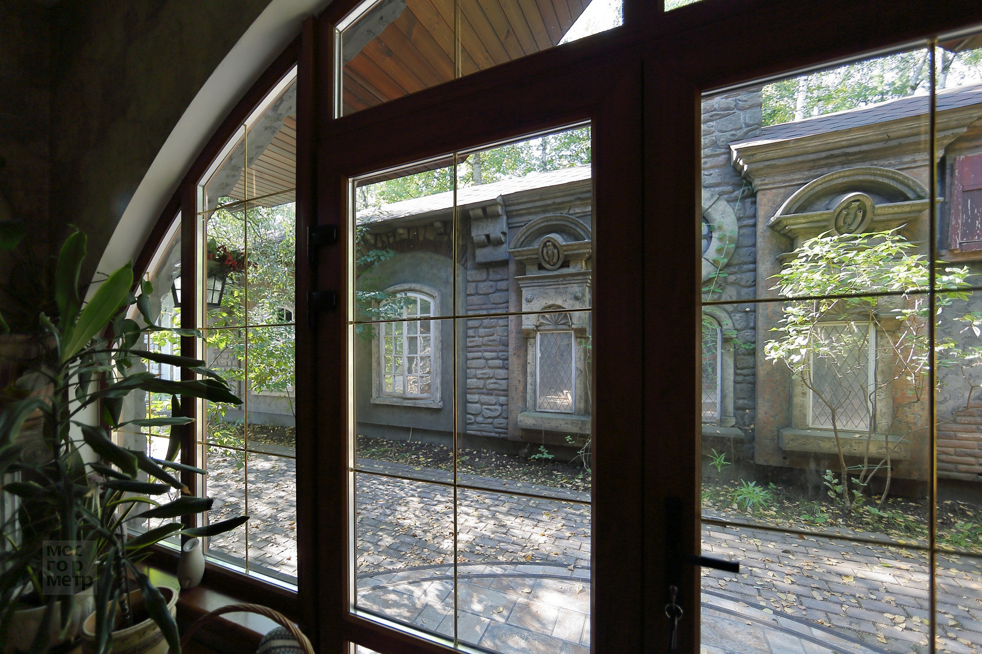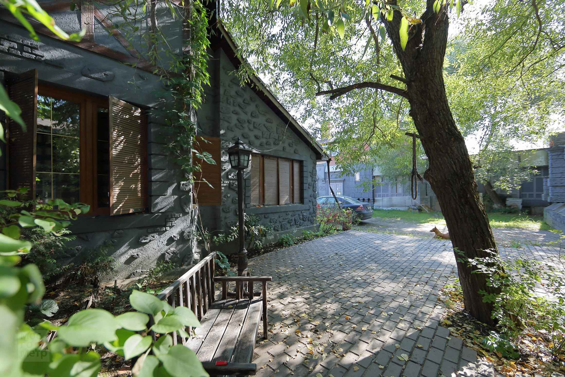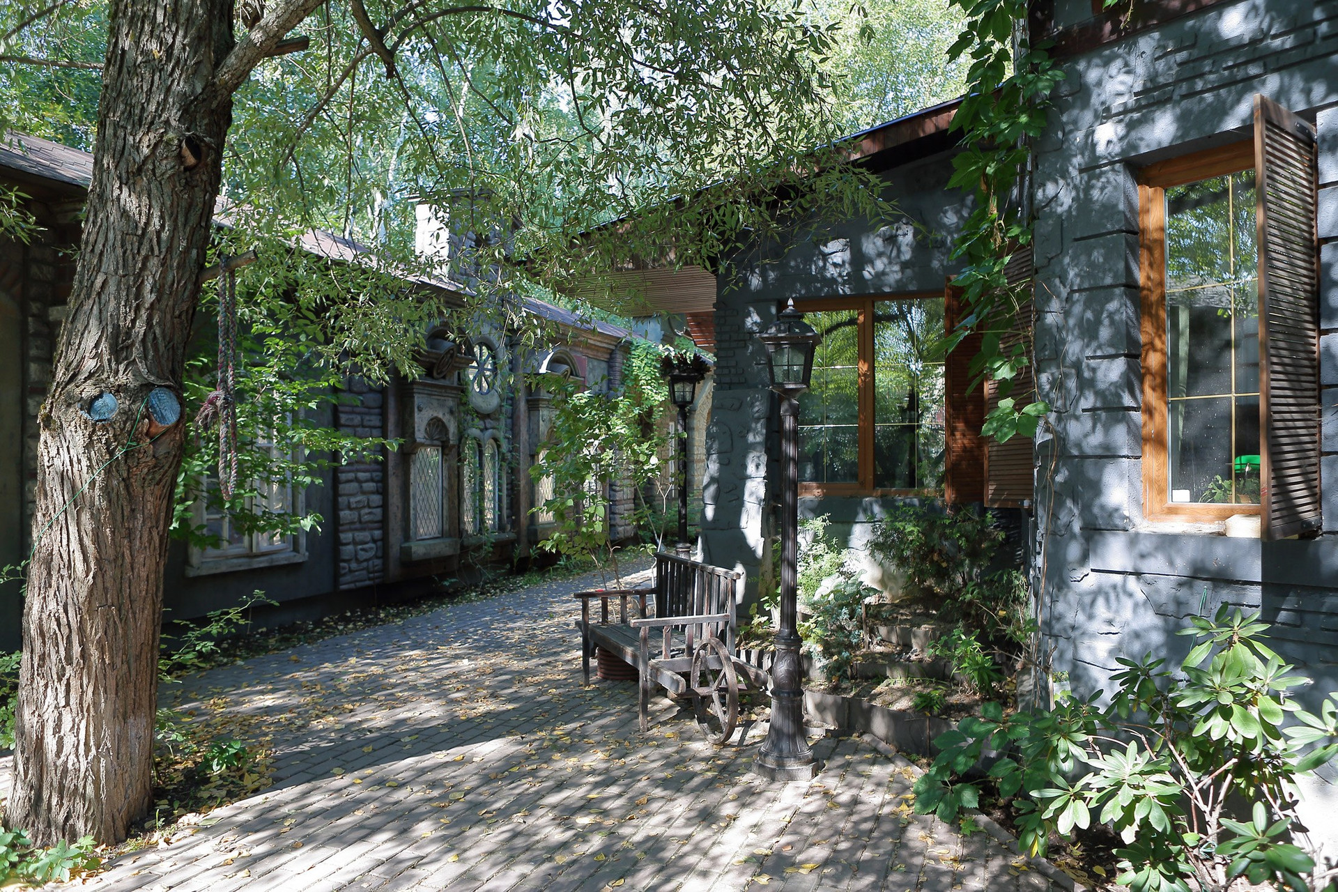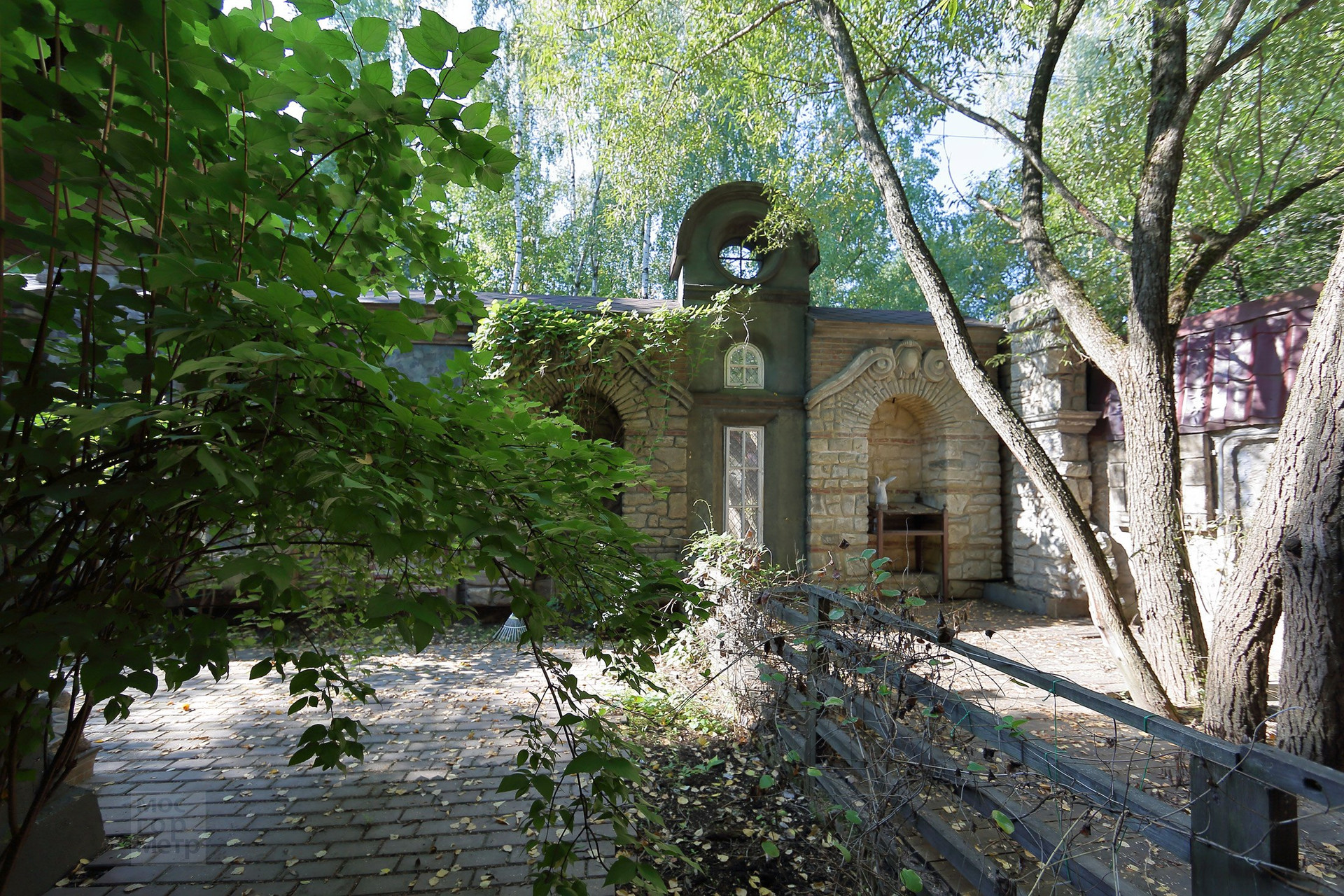 Интересное решение ограждения участка - высокий забор по периметру замаскирован и стилизован домики и улочки старинного городка. В оконцах включается подсветка. Возникает удивительное ощущение, что можно выйти на улицу, завернуть за угол и оказаться в новом для себя месте, пойти в кафе, выпить чашечку кофе и встретить друзей.