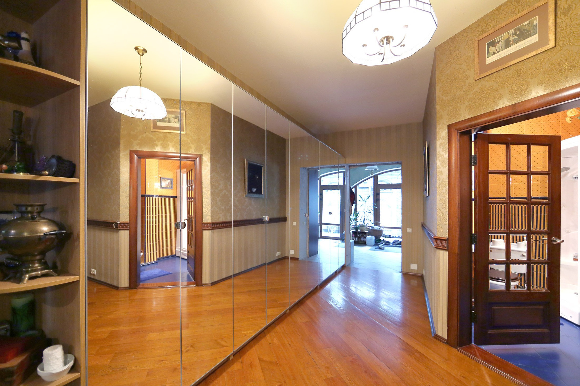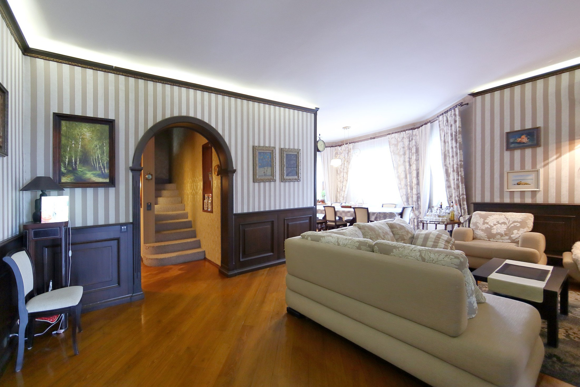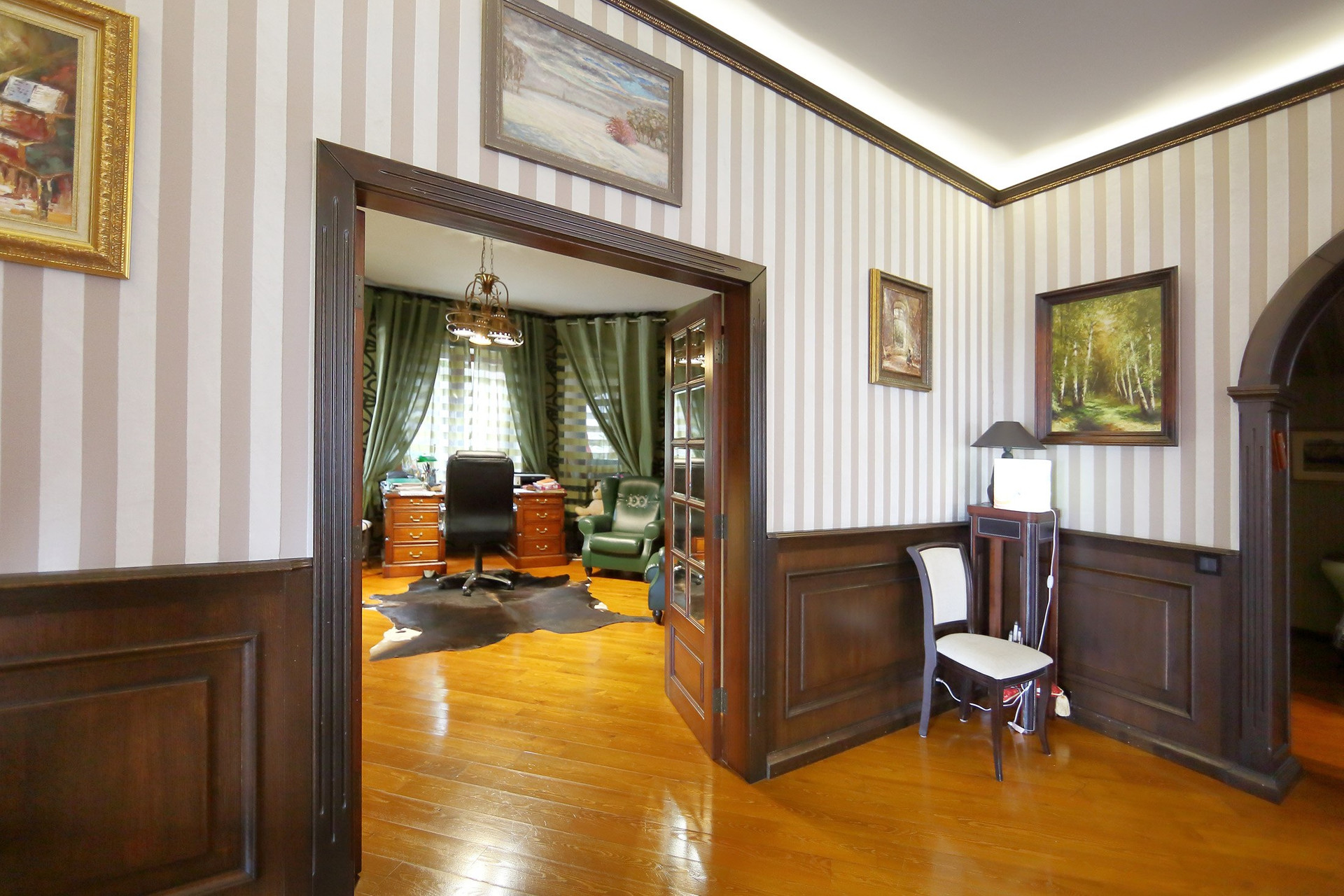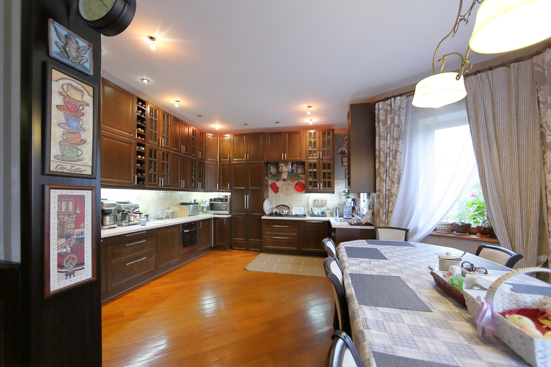 Первый этаж в доме: холл с большими зеркальными шкафами, большая гостиная и кухня, хозяйская спальня со своей комнатой отдыха и ванной комнатой, гостевой санузел с душевой кабиной, пристройка-терраса с настоящей русской печью и палатями. Из кухни через тайные двери можно попасть в техническое помещение с оборудованием дома и кладовую для продуктов. Здесь есть спуск в подвал на лифте или по лестнице. Кухня оборудована всей необходимой техникой и мебелью: встроенная посудомоечная машина Bosch, варочная газовая панель Aristone, духовой шкаф и вытяжка итальянская Kata. Кабинет в английском стиле с библиотекой и эркером.
