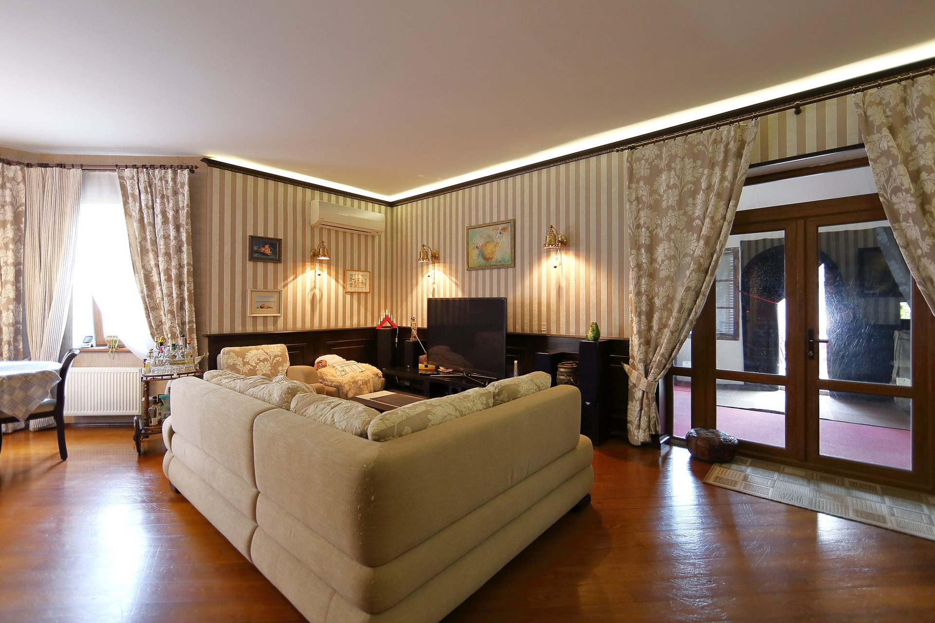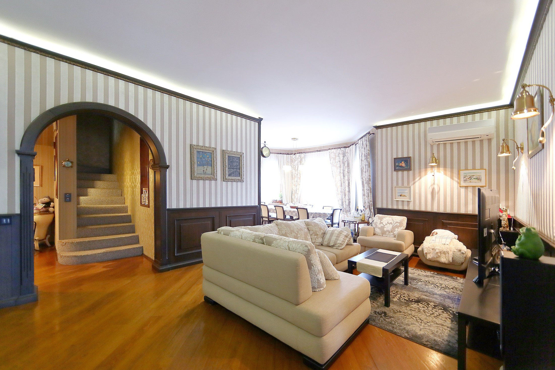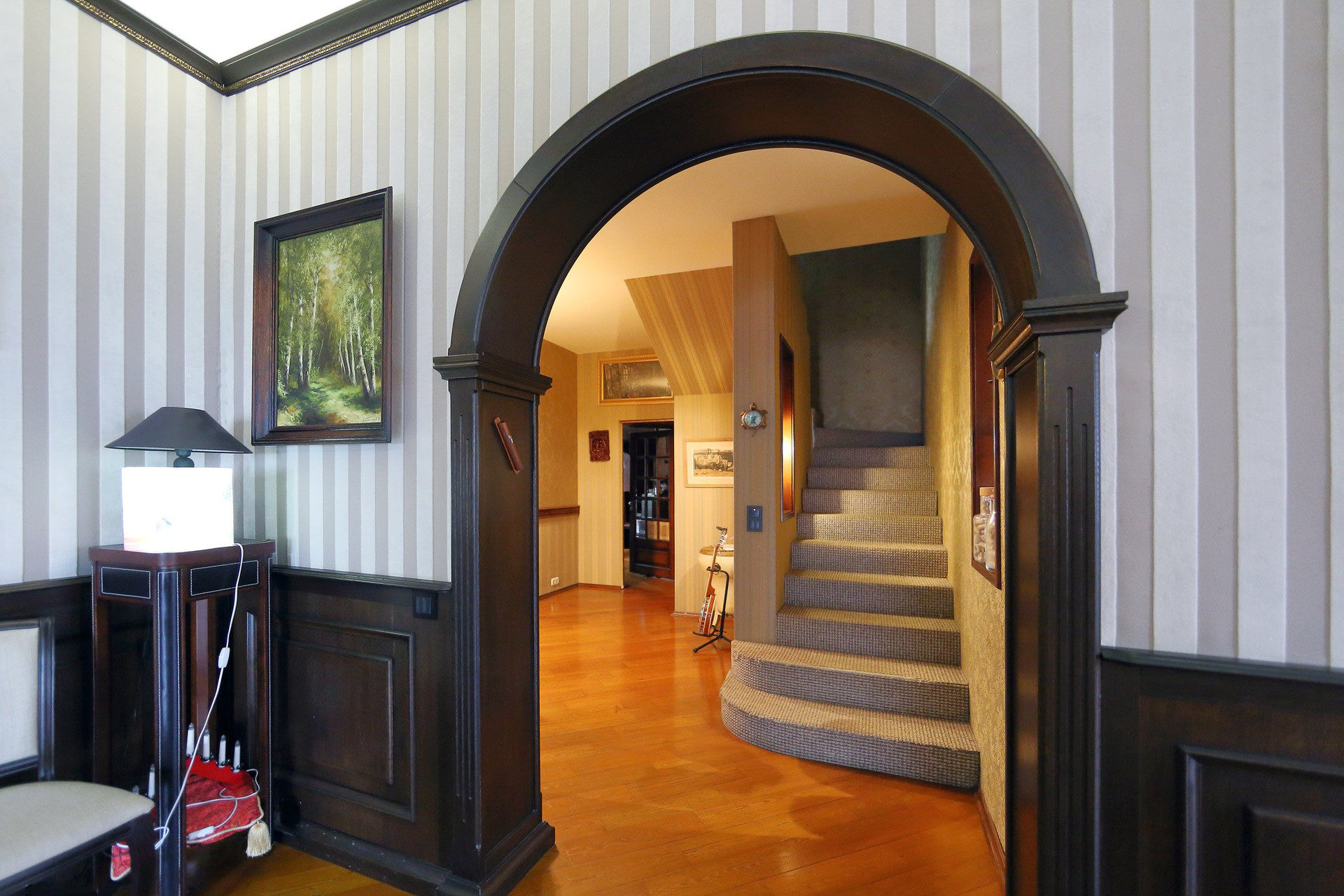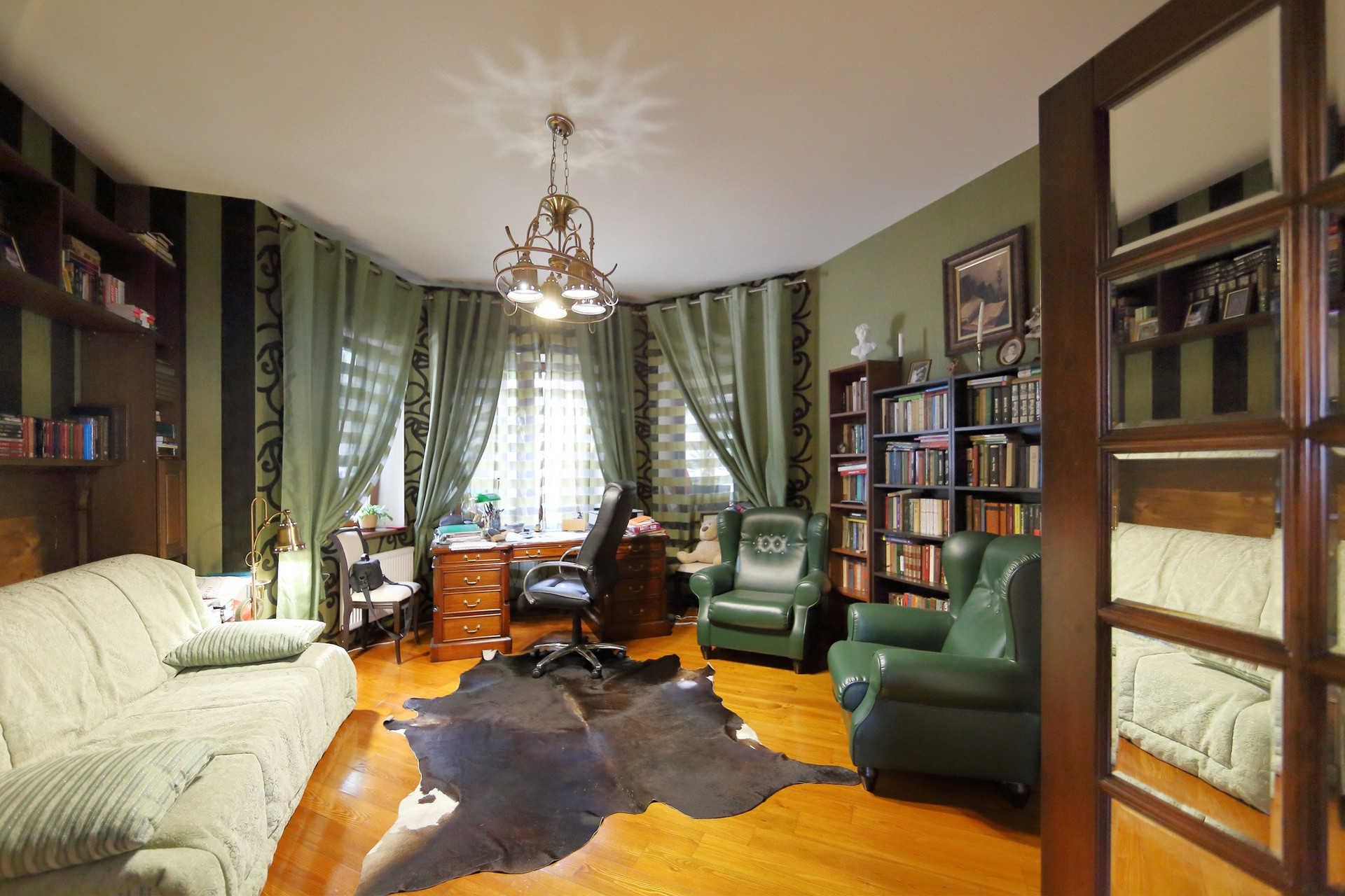 Первый этаж в доме: холл с большими зеркальными шкафами, большая гостиная и кухня, хозяйская спальня со своей комнатой отдыха и ванной комнатой, гостевой санузел с душевой кабиной, пристройка-терраса с настоящей русской печью и палатями. Из кухни через тайные двери можно попасть в техническое помещение с оборудованием дома и кладовую для продуктов. Здесь есть спуск в подвал на лифте или по лестнице. Кухня оборудована всей необходимой техникой и мебелью: встроенная посудомоечная машина Bosch, варочная газовая панель Aristone, духовой шкаф и вытяжка итальянская Kata. Кабинет в английском стиле с библиотекой и эркером.