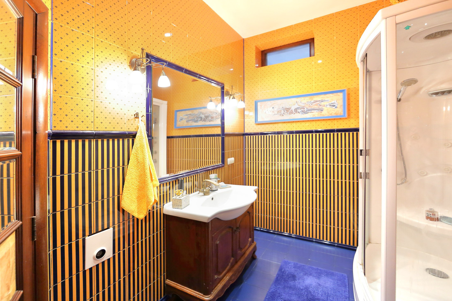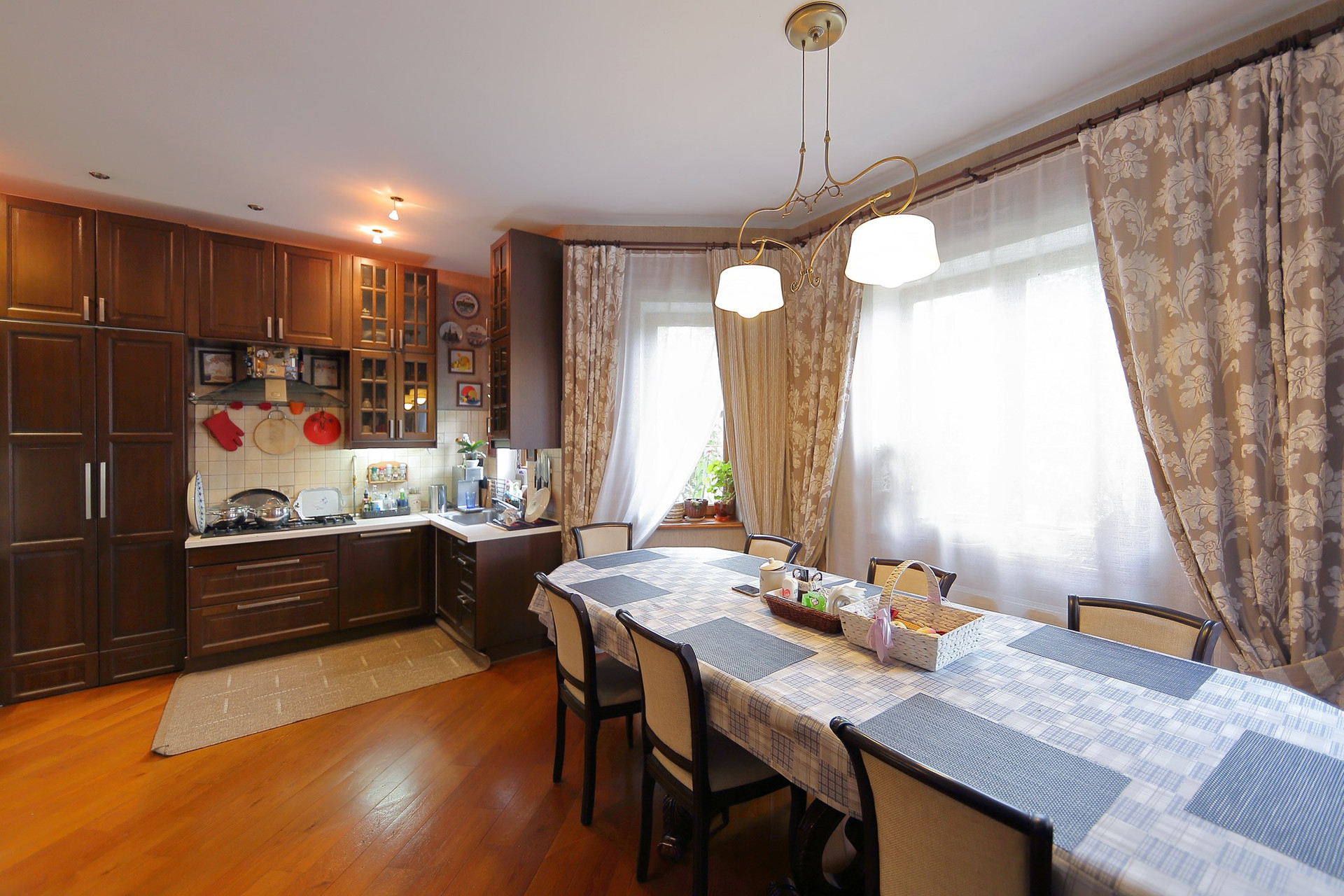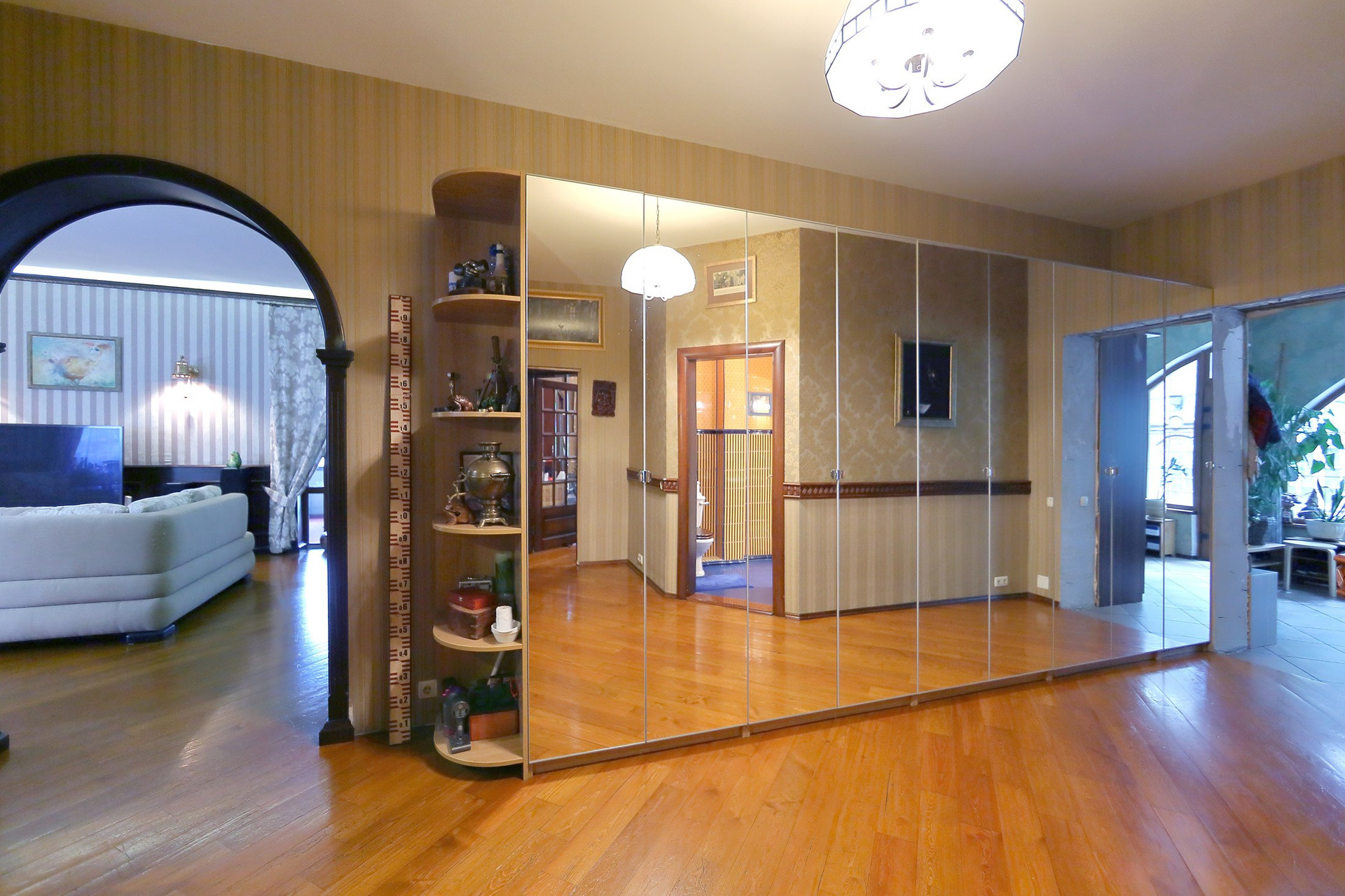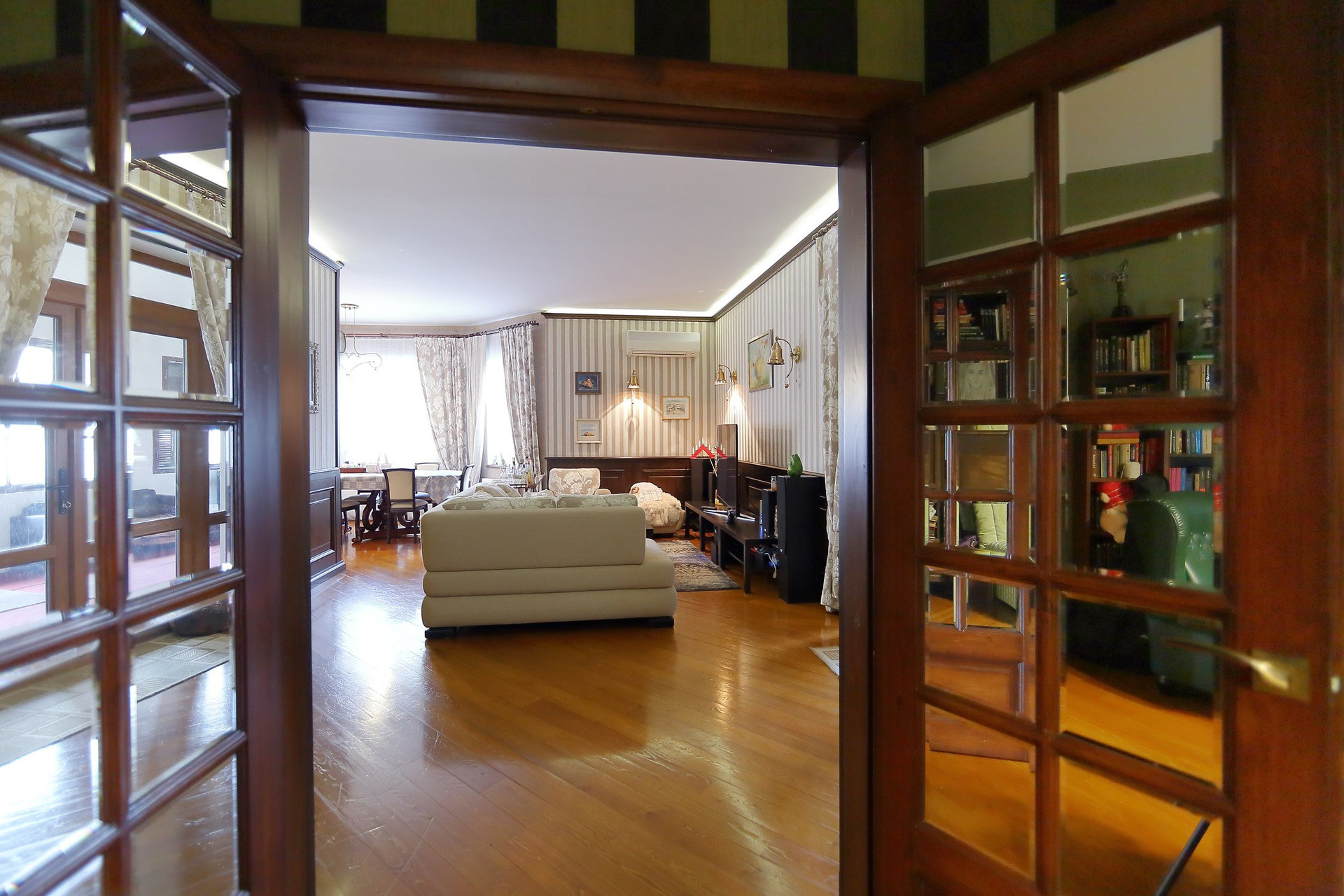Первый этаж в доме: холл с большими зеркальными шкафами, большая гостиная и кухня, хозяйская спальня со своей комнатой отдыха и ванной комнатой, гостевой санузел с душевой кабиной, пристройка-терраса с настоящей русской печью и палатями. Из кухни через тайные двери можно попасть в техническое помещение с оборудованием дома и кладовую для продуктов. Здесь есть спуск в подвал на лифте или по лестнице. Кухня оборудована всей необходимой техникой и мебелью: встроенная посудомоечная машина Bosch, варочная газовая панель Aristone, духовой шкаф и вытяжка итальянская Kata. Кабинет в английском стиле с библиотекой и эркером.