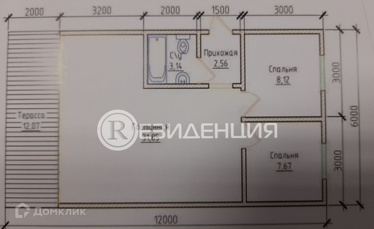Планировка:  зал-гостинная 32м2, 2 спальни по 8 м2, санузел 3,1 м2, терраса 12 м2.