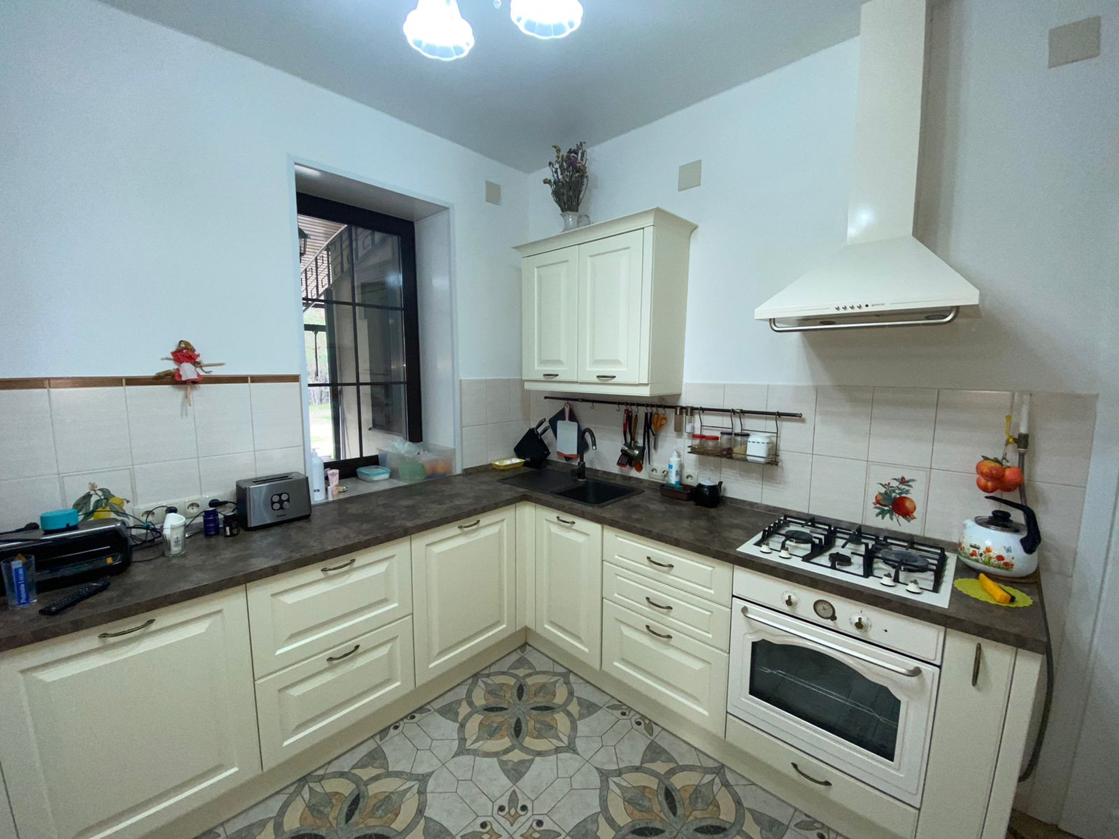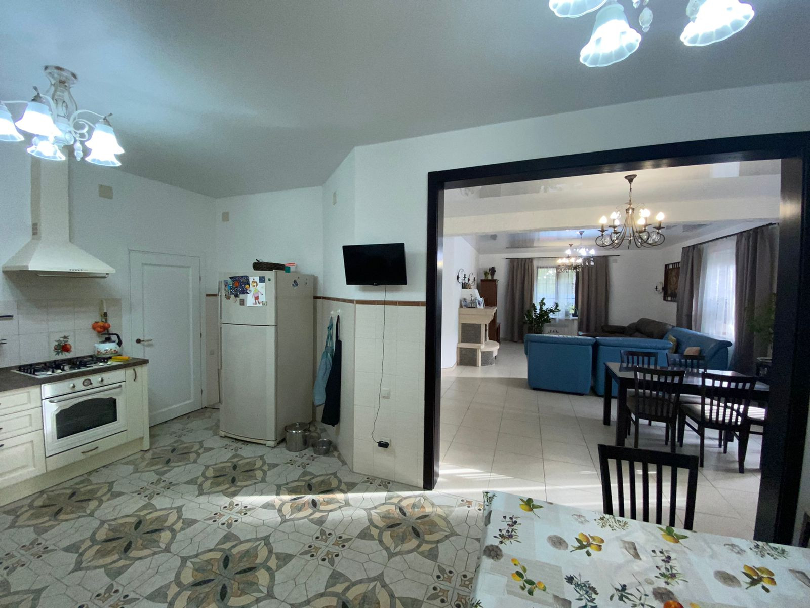 Первый этаж: кухня-гостиная 60 кв.м. с действующим камином, с выходом на просторную террасу, гостевая комната-кабинет, гардеробная, кладовая, санузел. По всему этажу система водяного теплого пола. Пол выложен керамогранитом испанского и итальянского производства. Имеется выход в гараж, где установлены автоматические ворота.
