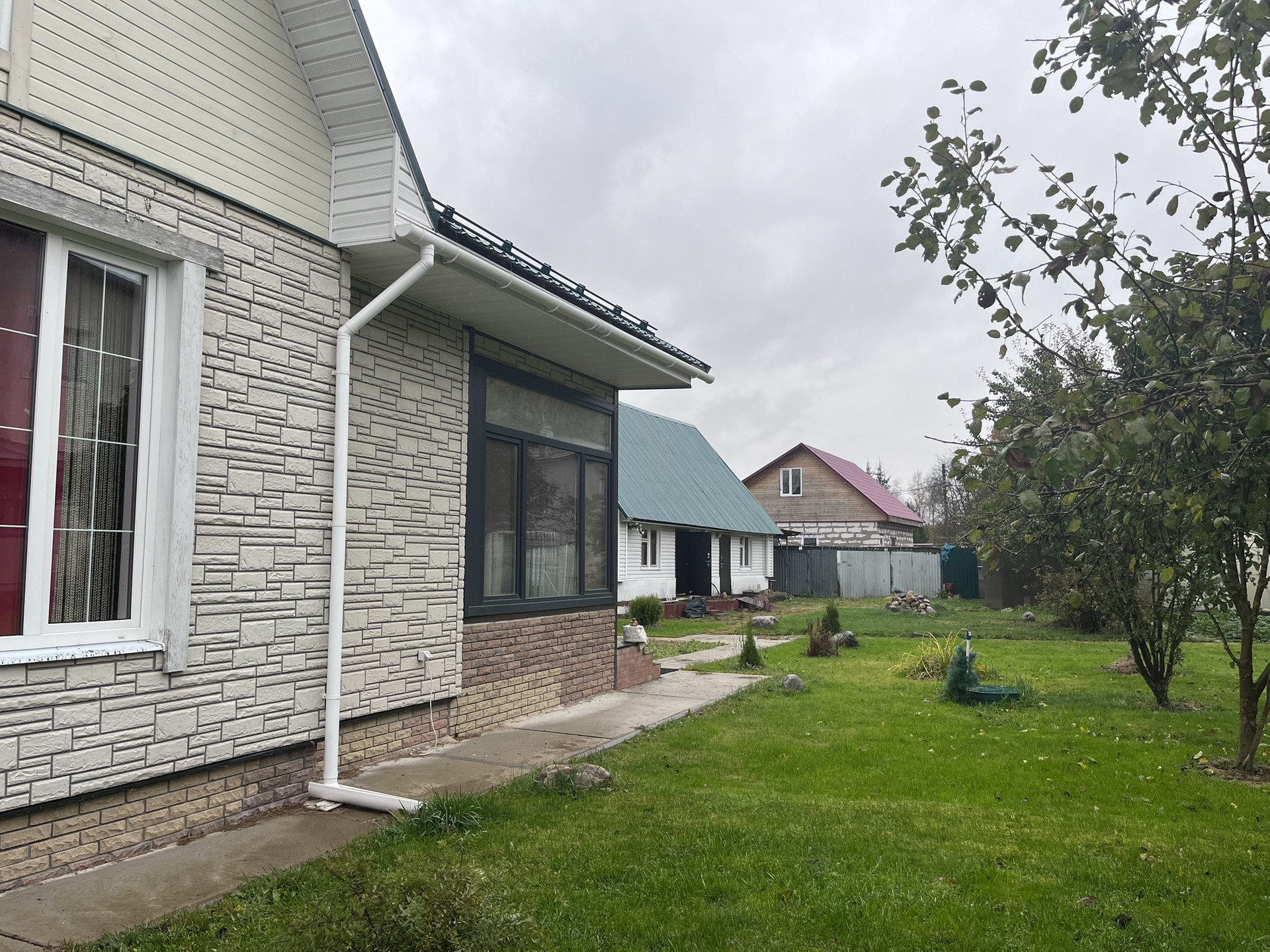 На участке имеются следующие постройки: главный дом, двухэтажный гостевой домик с хозяйственным блоком, летняя беседка.