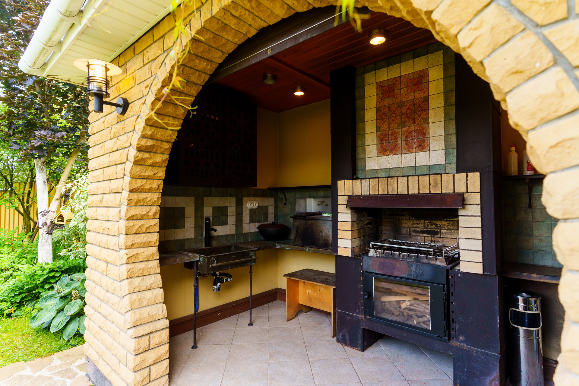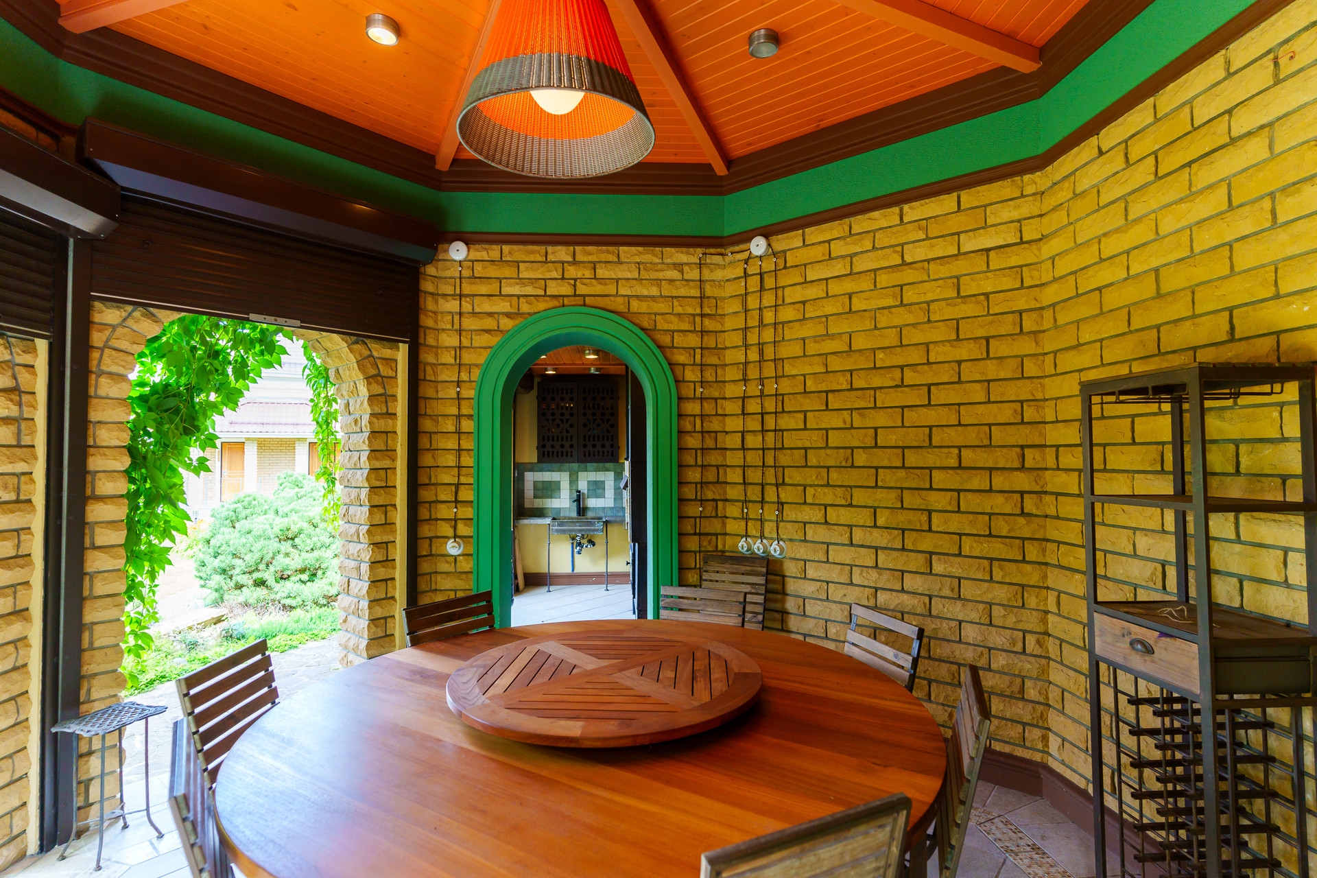 - Беседка: Кирпичная с мангалом и комнатой отдыха, от непогоды защищена рольставнями.