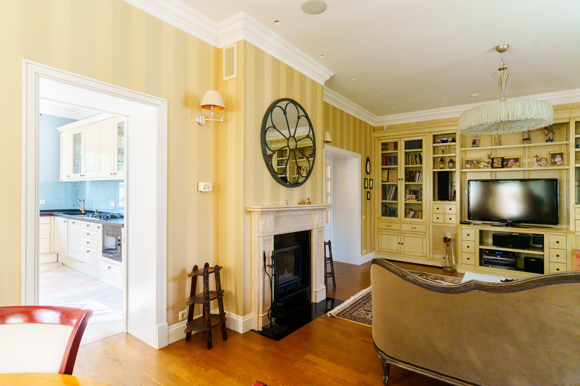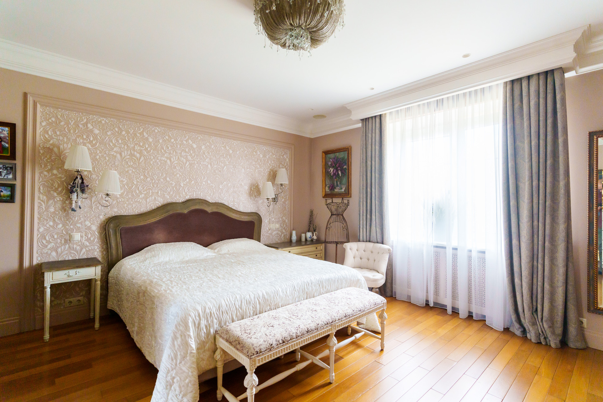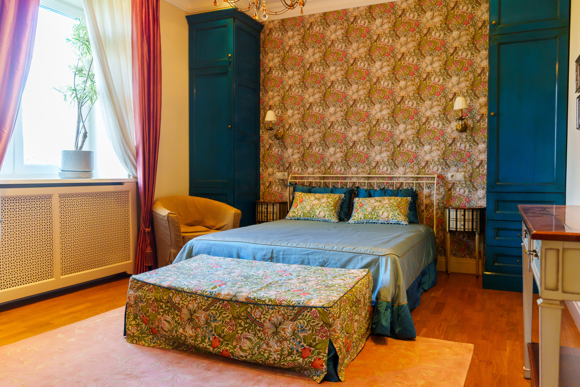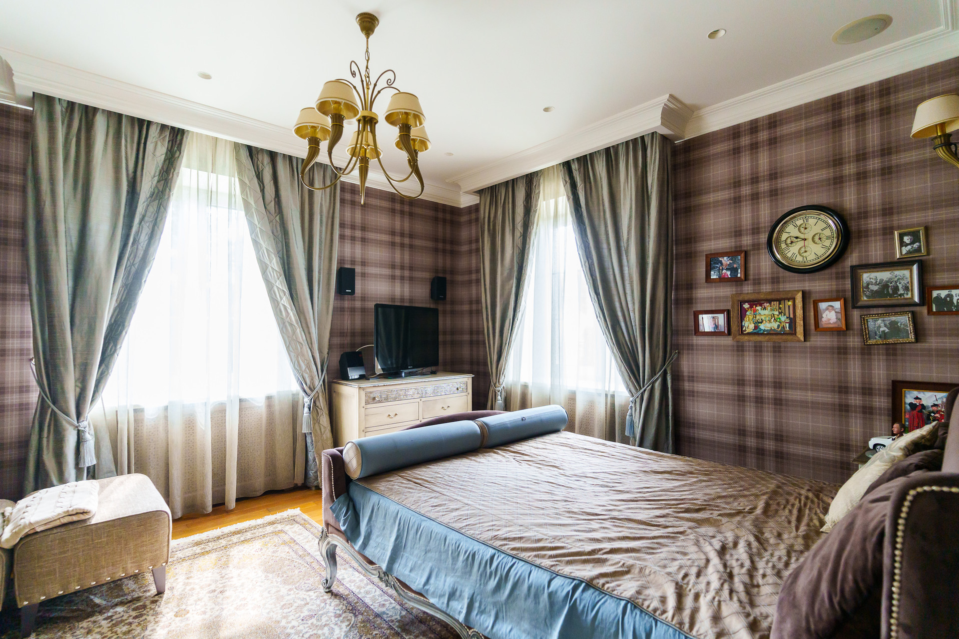 - Стены: Декоративная штукатурка, стойкая к повреждениям; английские обои в спальных комнатах.