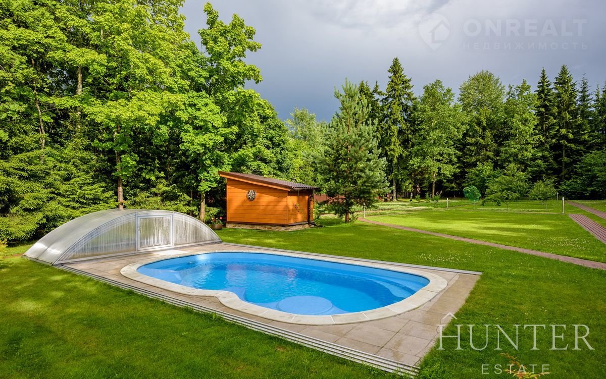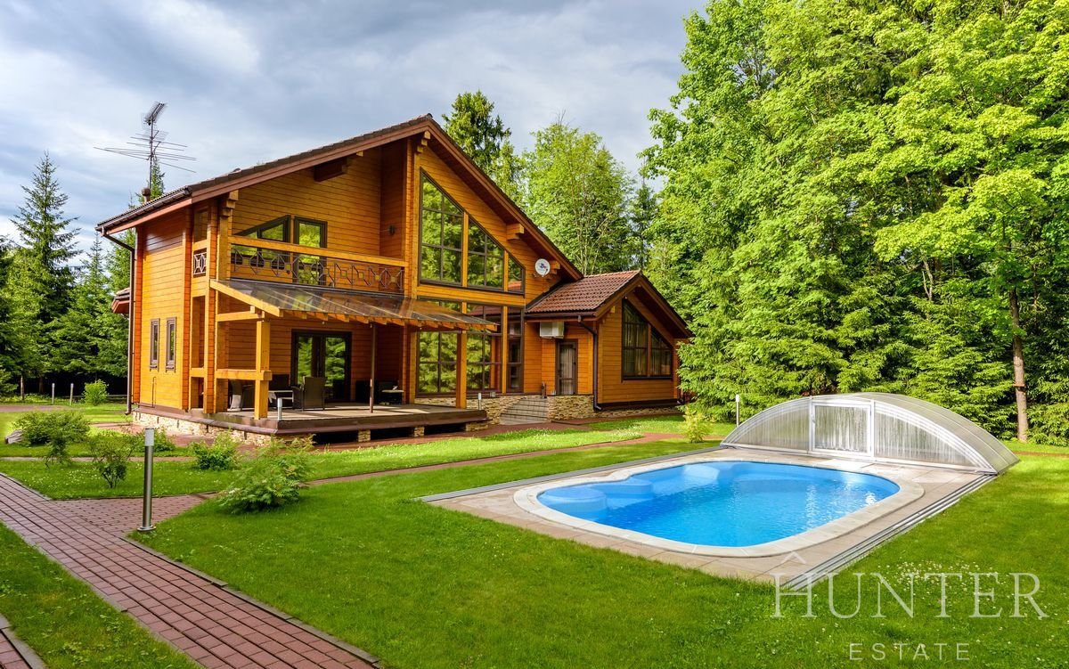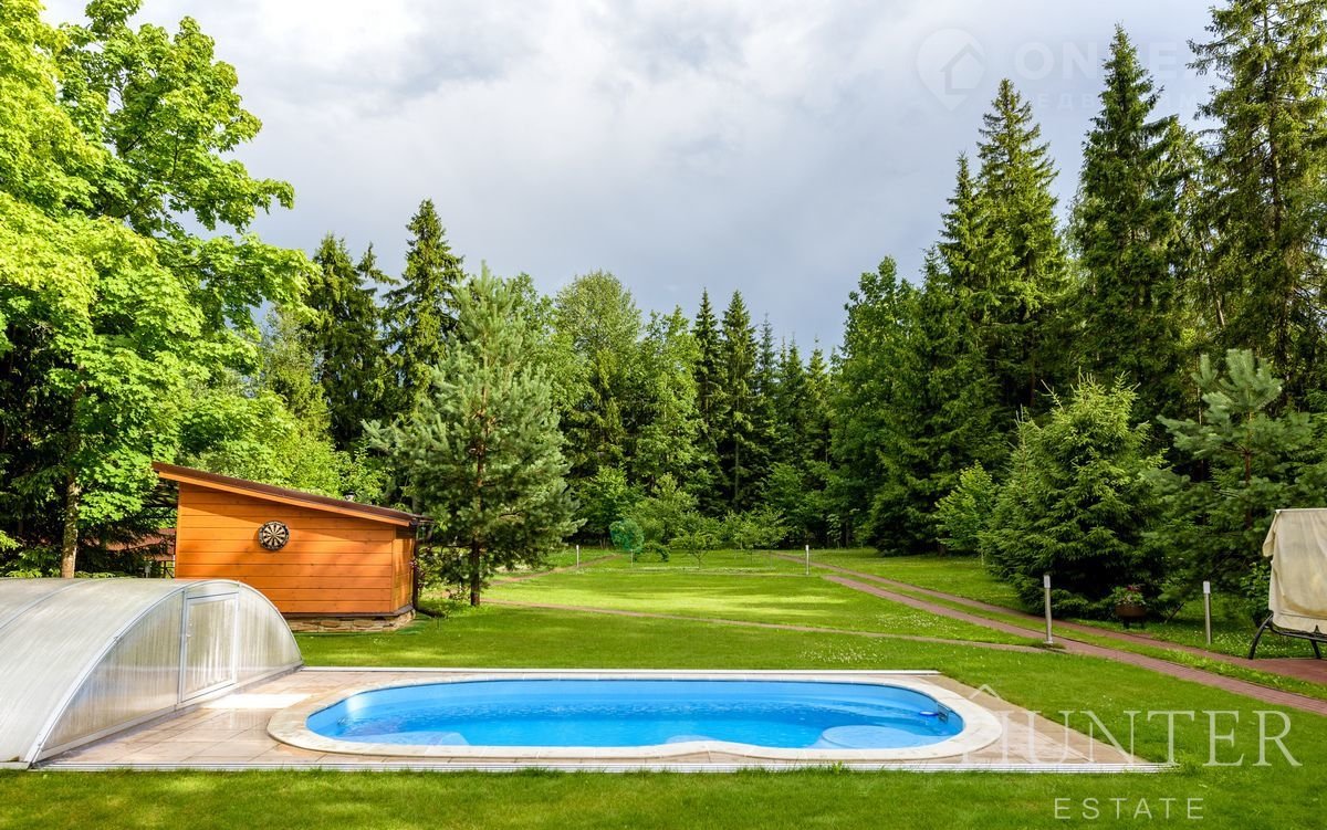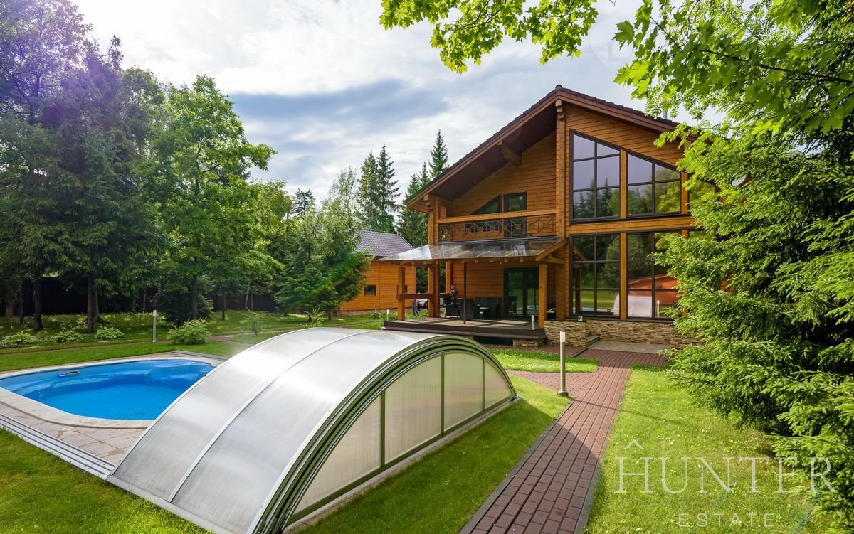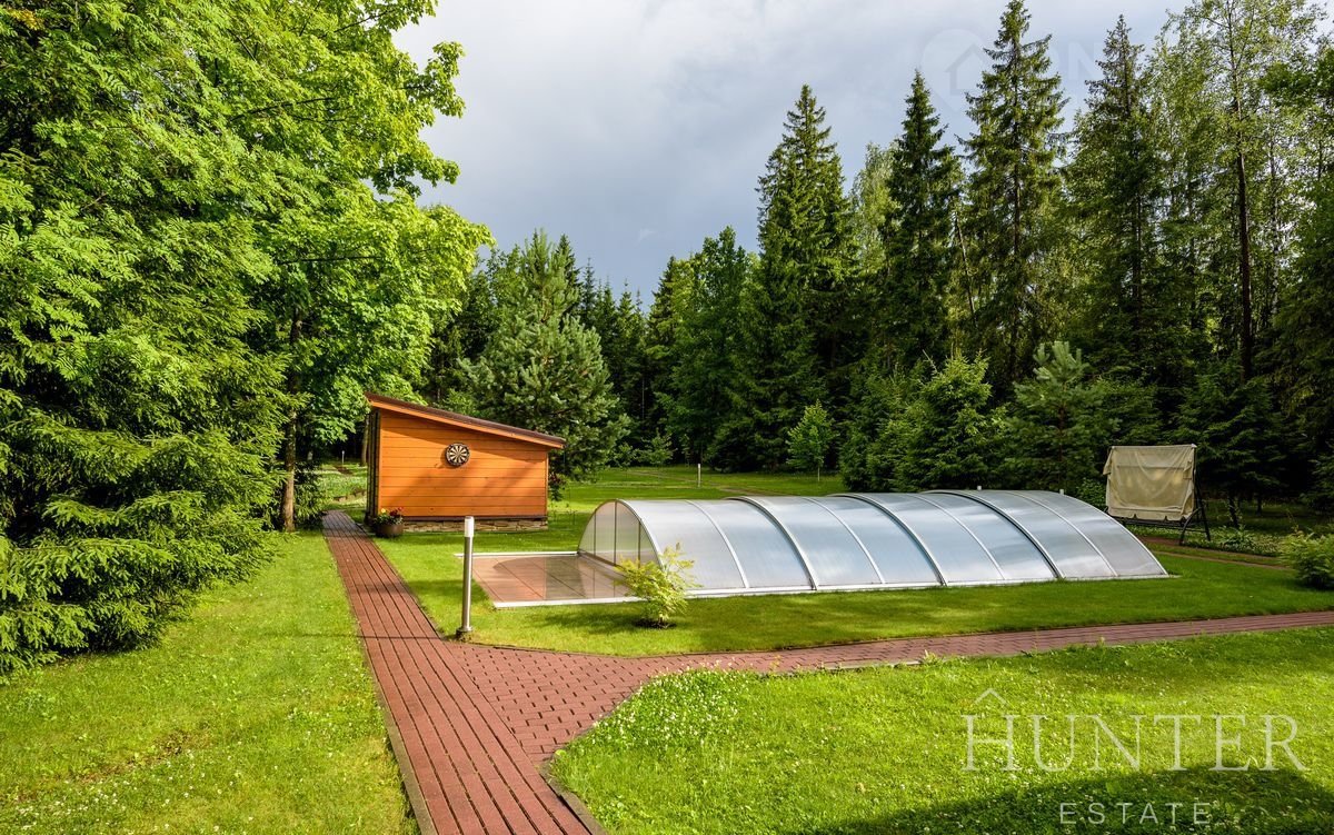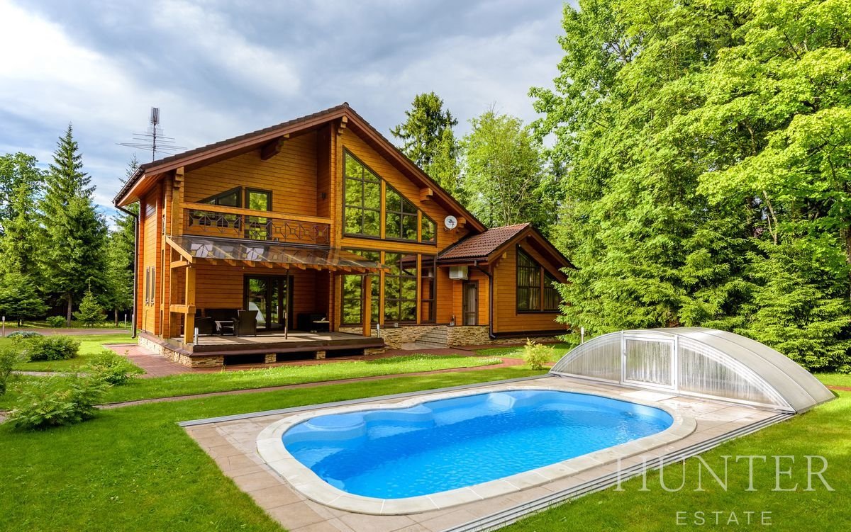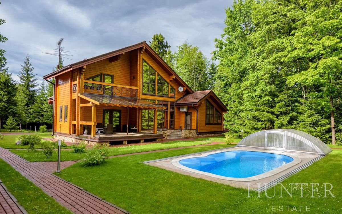 На лесном участке площадью 60 соток кроме основного дома построены: открытый подогреваемый бассейн 3*7 с противотоком и навесом, беседка ВВQ и гараж на 2 м/м с квартирой для персонала.