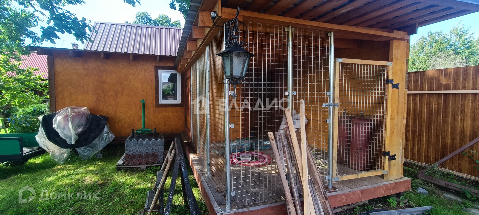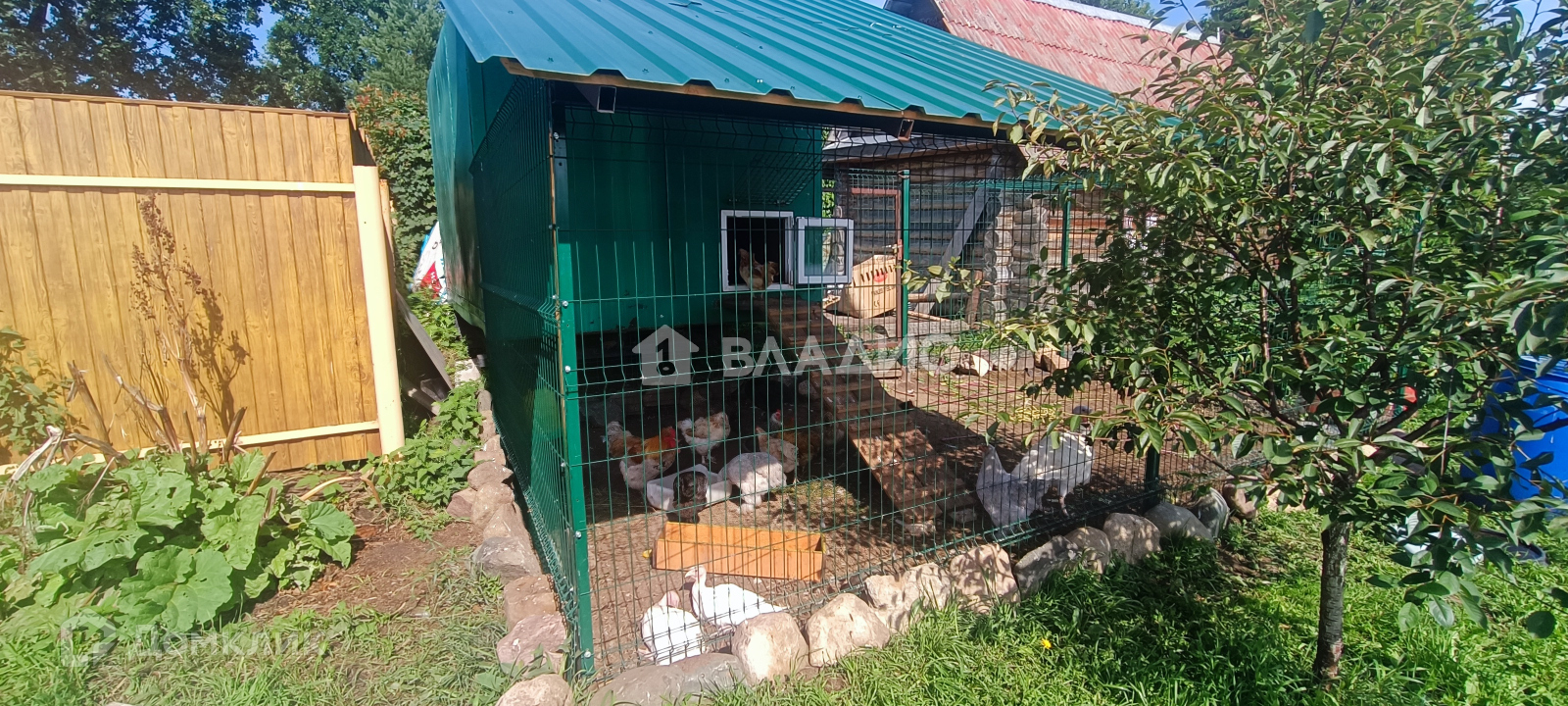 На участке расположена беседка, барбекю, современная баня, вольер для собаки, курятник, гараж и мастерская;