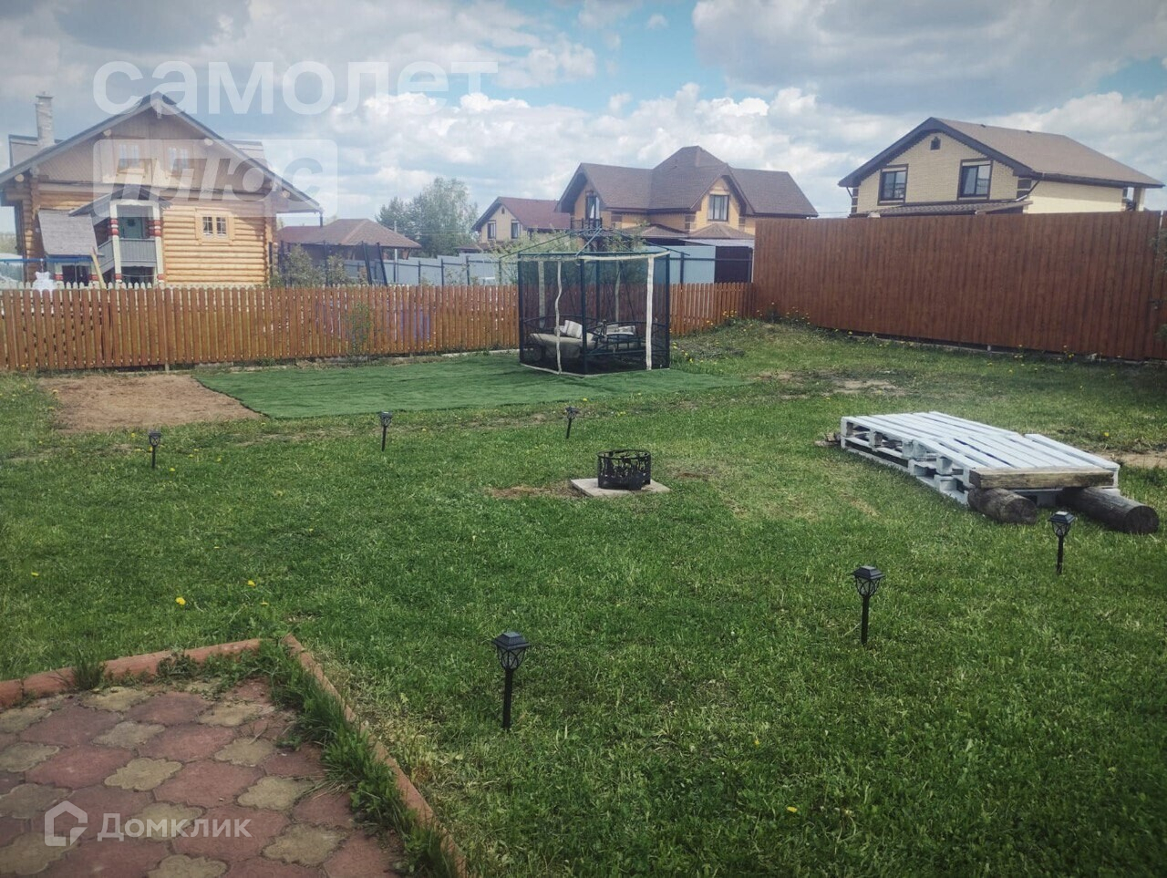 На участке садовые качели, мангальная зона, каркасный бассейн (1,5м. высота, 6 м в диаметре), садовая обеденная мебель.