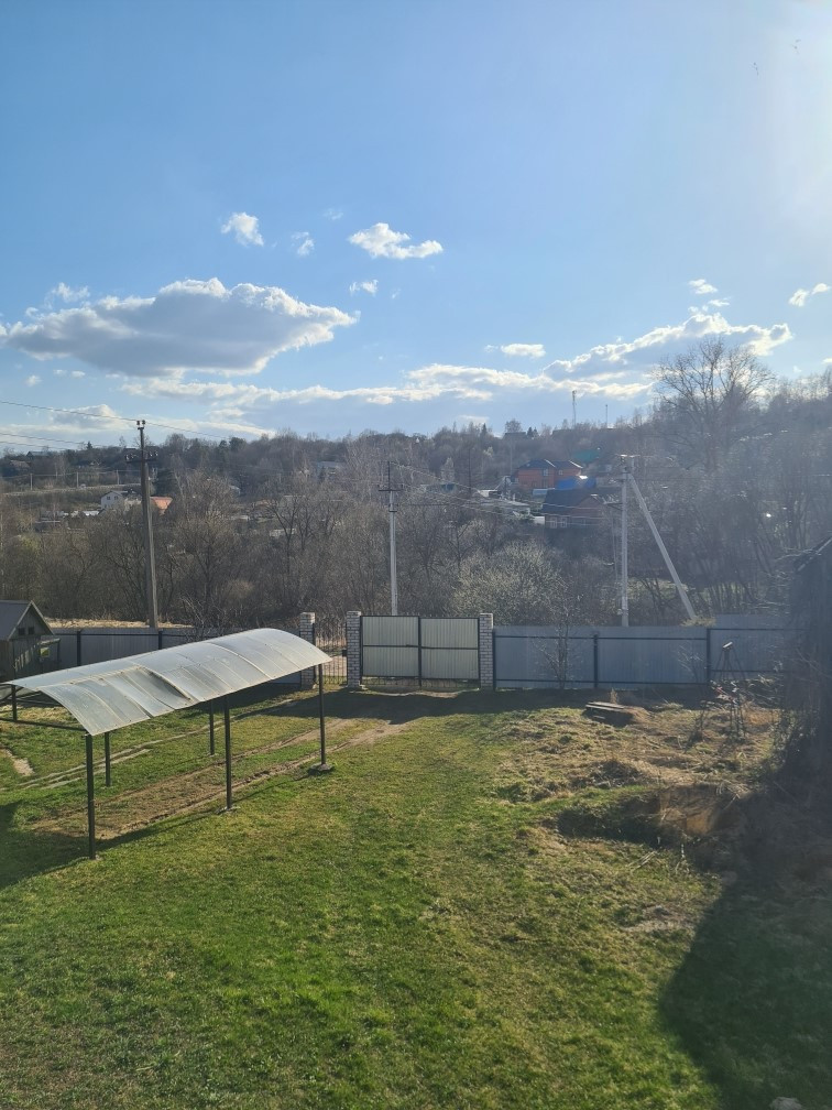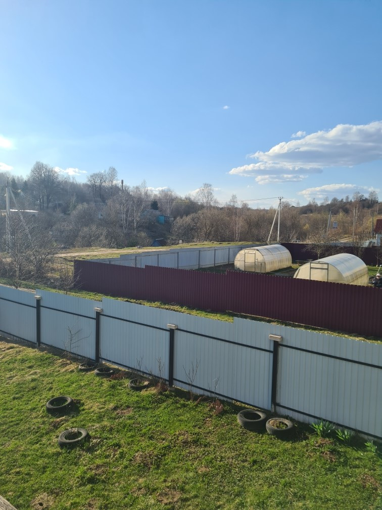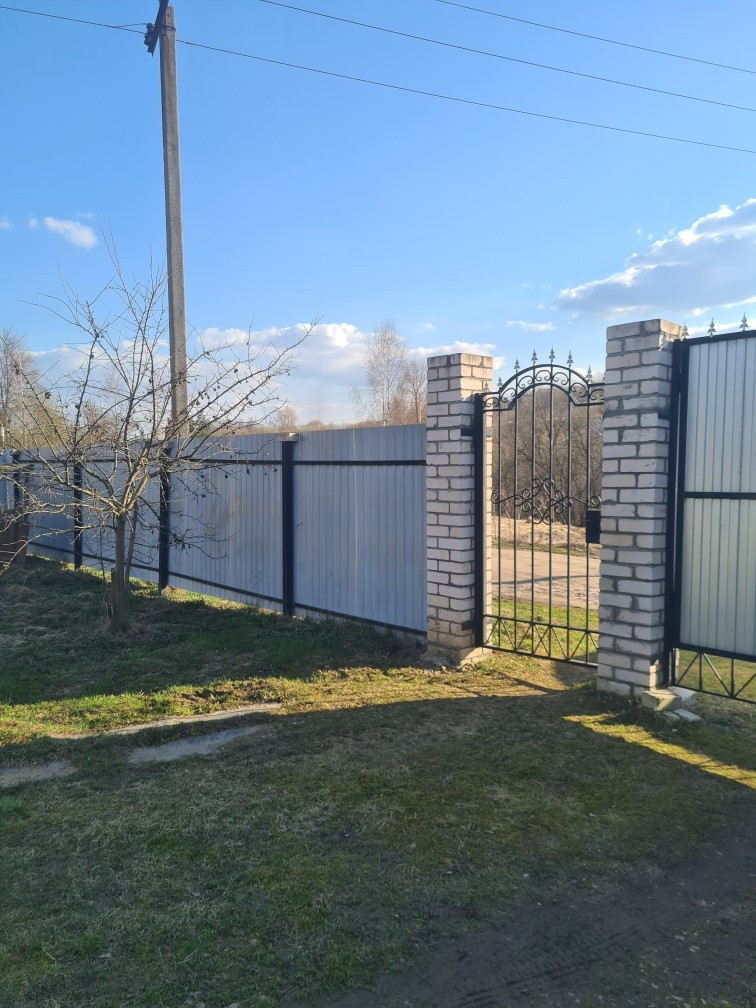 Участок правильной формы по всему периметру огорожен забором из профлиста, крытое машиноместо, зона барбекю, также есть сруб под баню 10x6 метров.