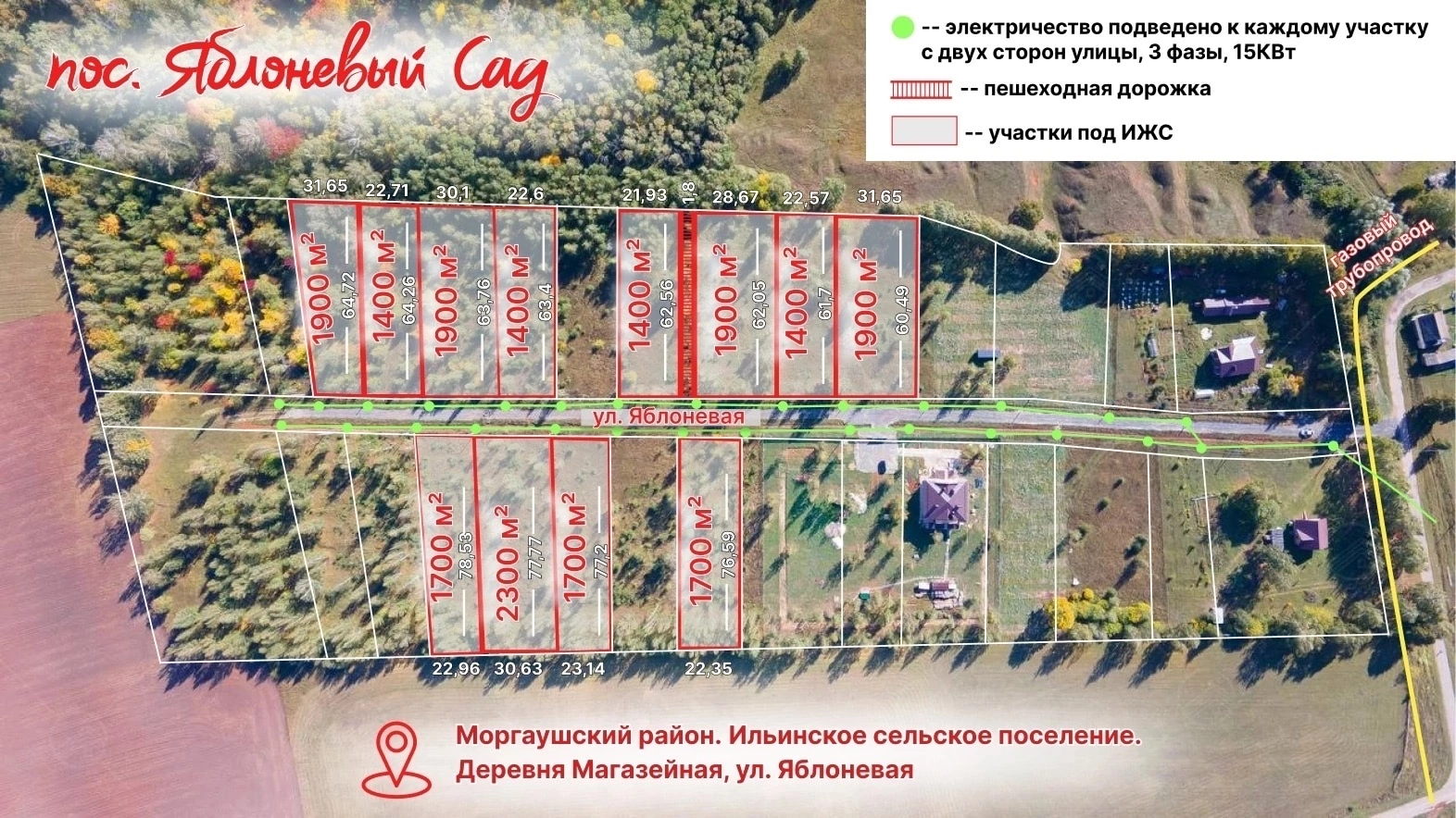 Посёлок «Яблоневый сад» занимает территорию площадью 6,8 га. Ухоженная, красивая, аккуратная территория. Хорошая дорога из асфальтовой крошки. Уже построенные на некоторых участках добротные дома. Пространство без шумных трасс и городской суеты. Предложение для тех, кто: