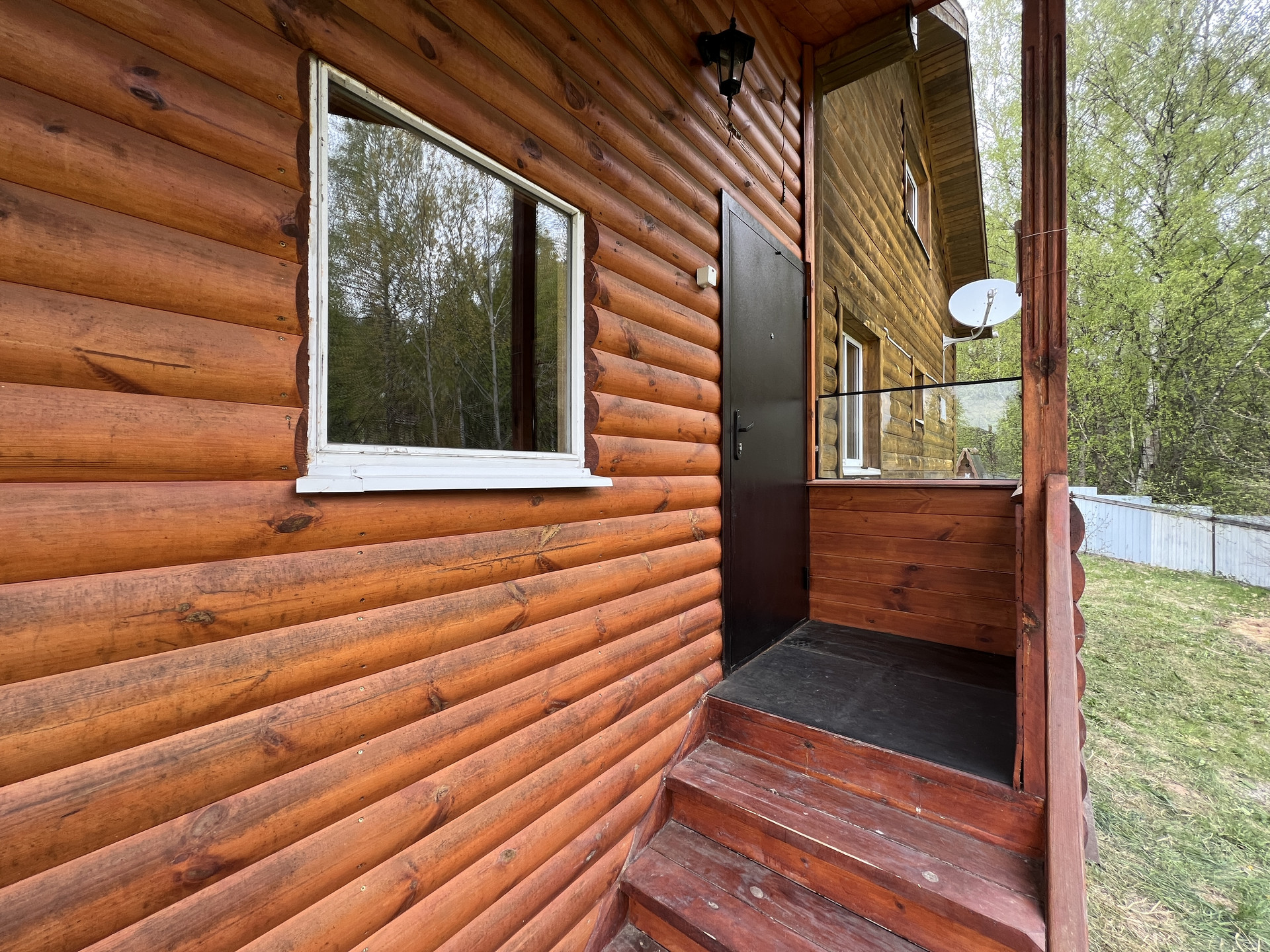 Дом построен из экологичной дорогой древесины - клеёный брус; Фундамент основной постройки ленточный, закрытая терраса (летняя веранда) на ж/б сваях, отделан ацеитовыми листами; Окна - двухкамерные стеклопакеты; Крыша - мягкая кровля; Отделка - вагонка; Полы — плитка/ламинат.