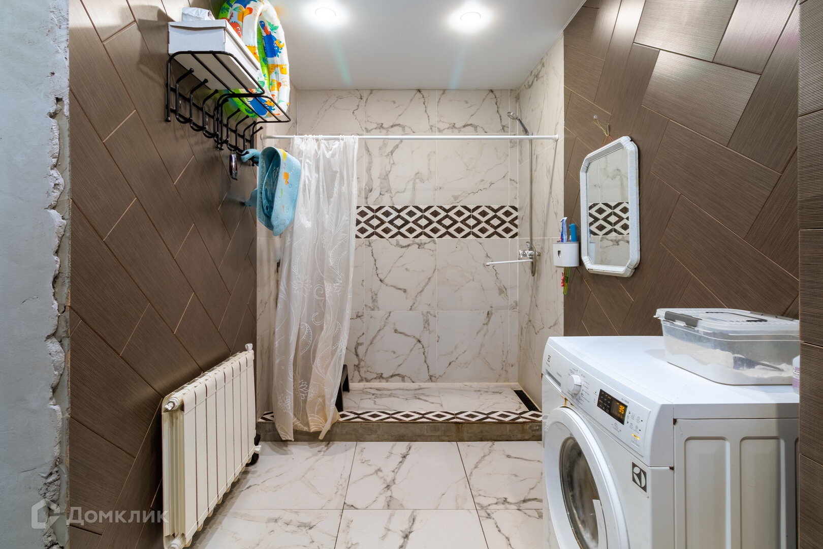 - в ванной кафель, современная стиральная машина.