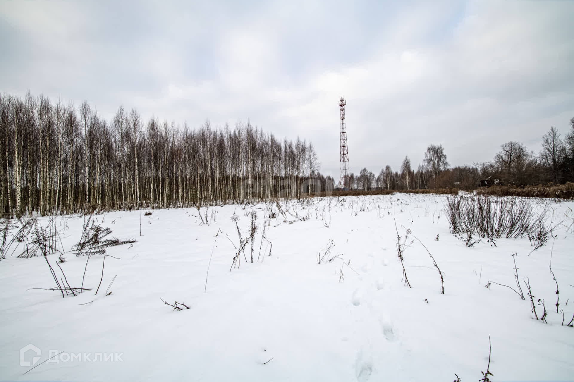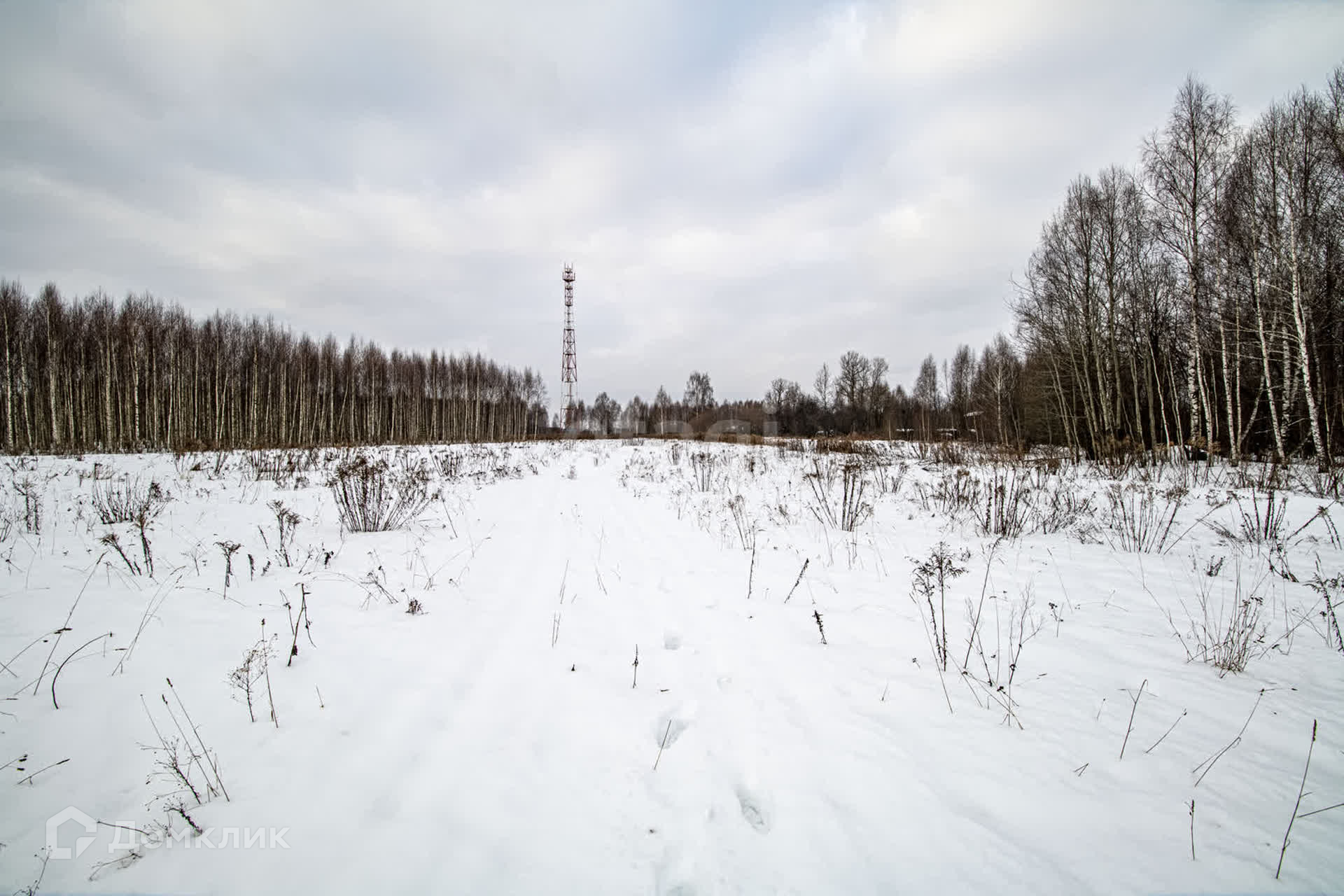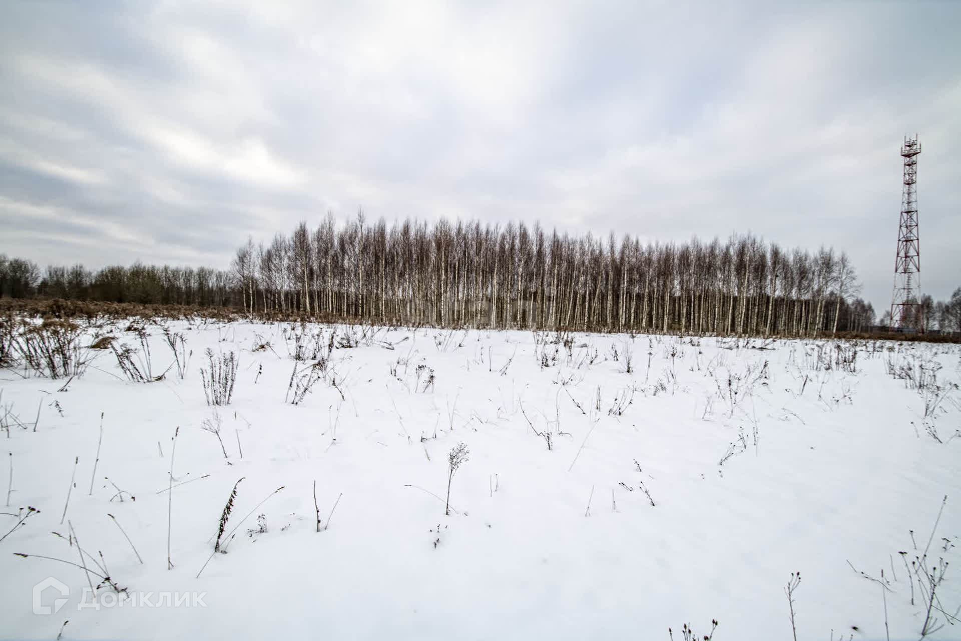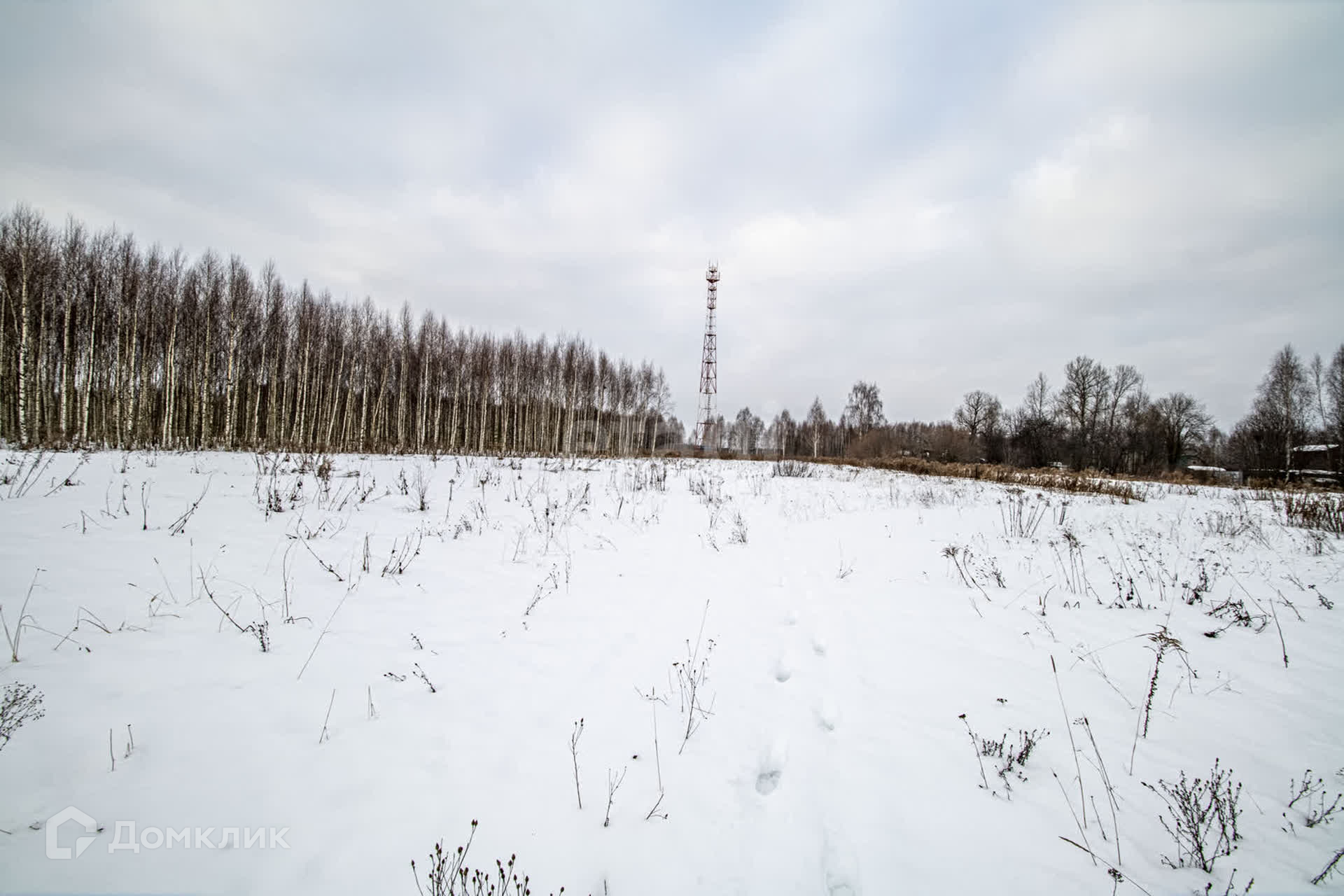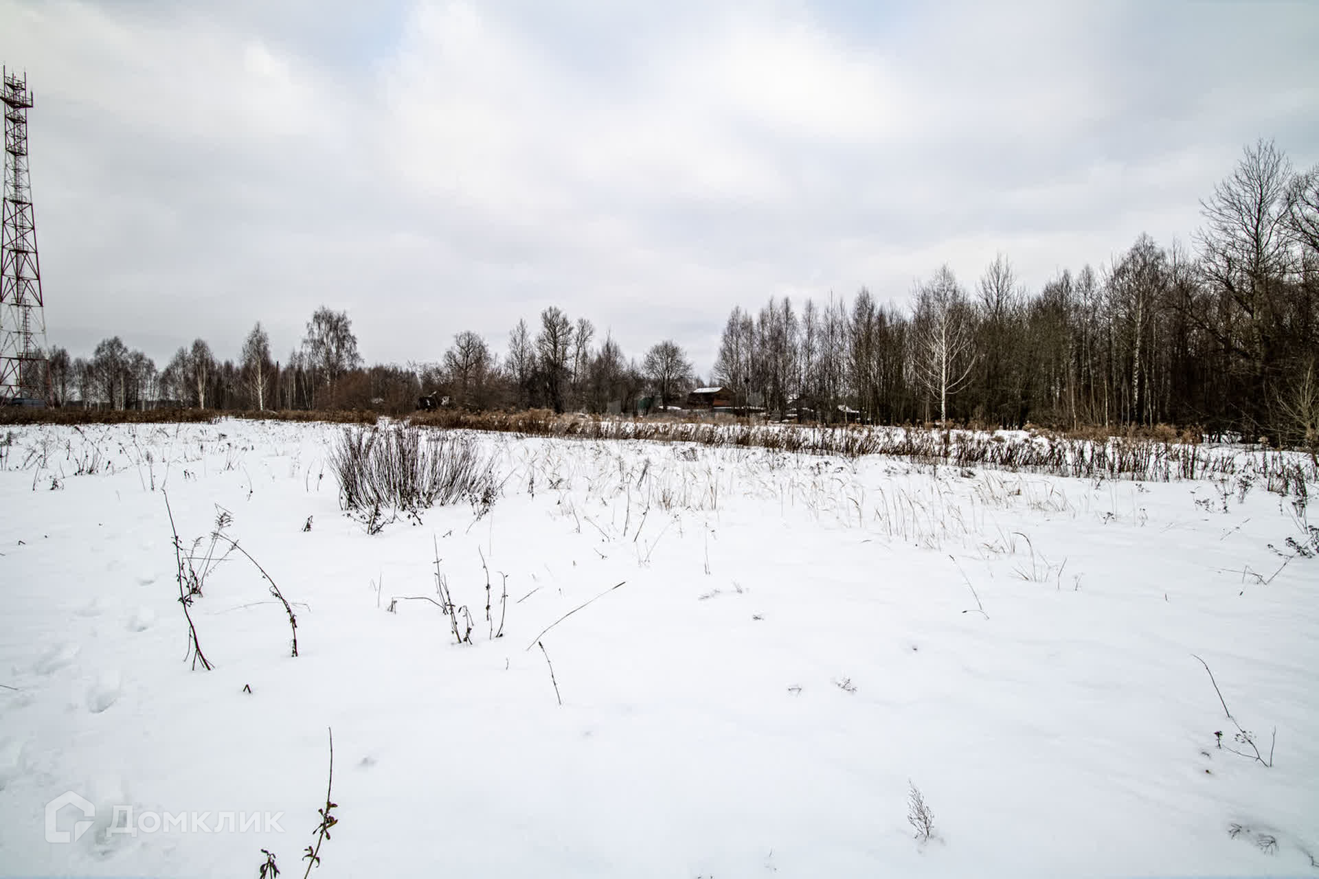На границе участка стоит столб электропередач.