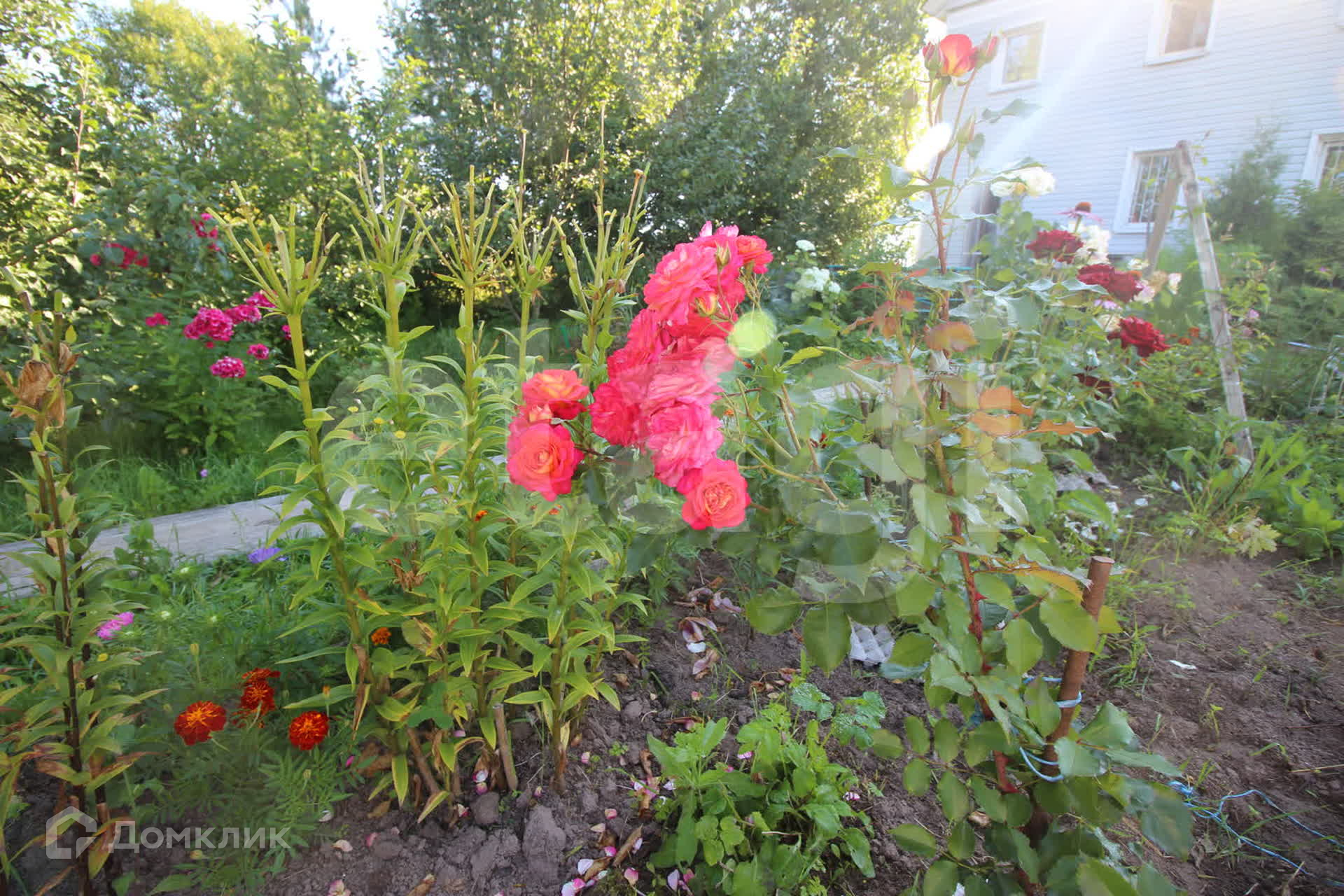 Участок разработан. Посажены овощи, зелень, ягодные культуры, плодово-ягодные деревья. Цветут прекрасные розы, гладиолусы, флоксы и другие цветы.