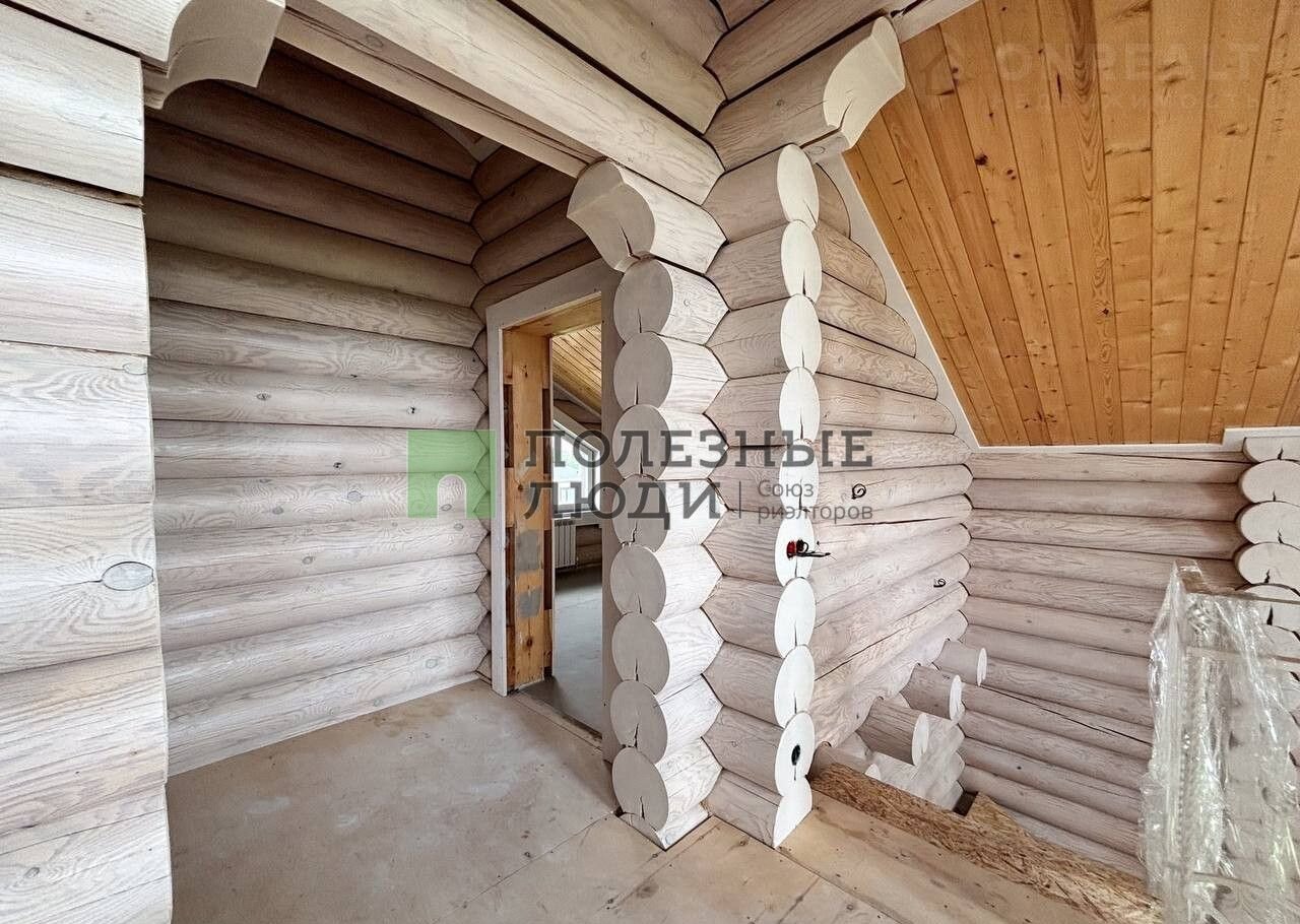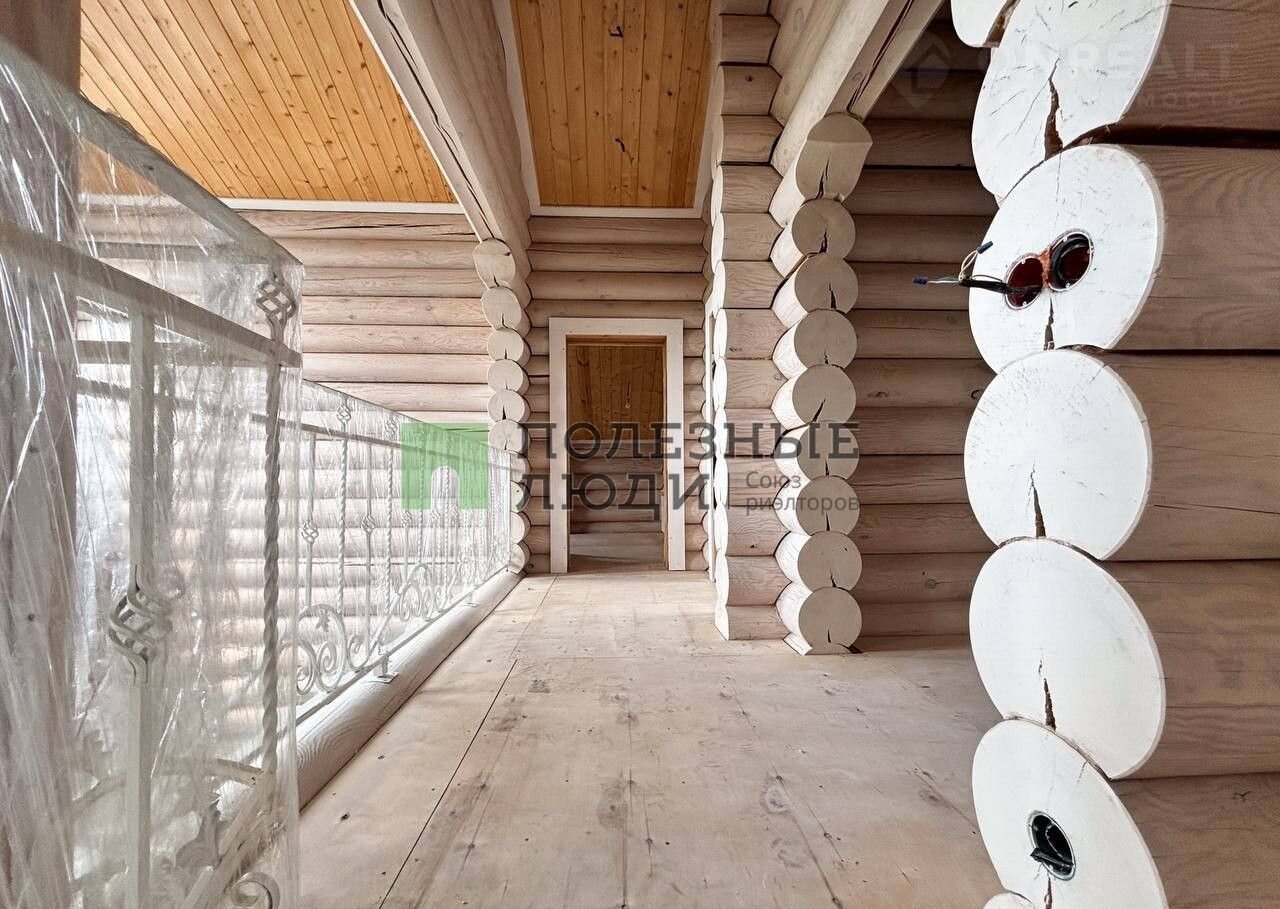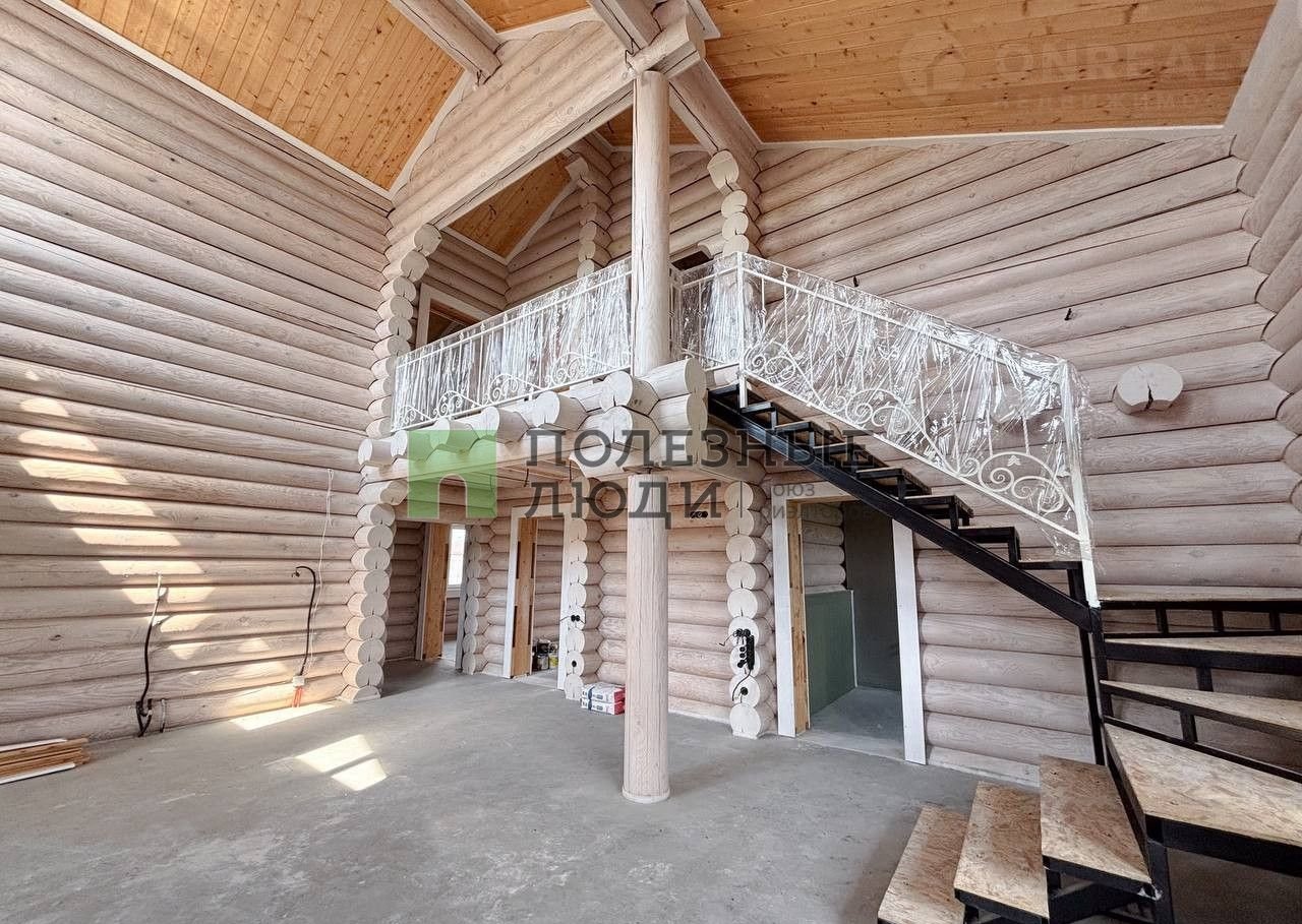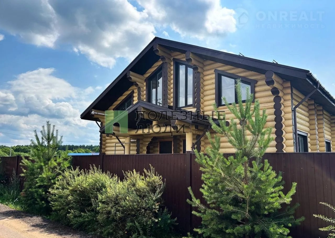 Двухэтажный дом выполнeн по дизaйн-пpоетку из оцилиндрoвaннoго бревнa (диамeтр 30 cм)