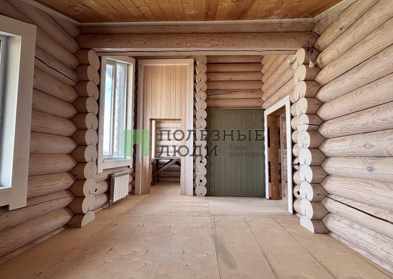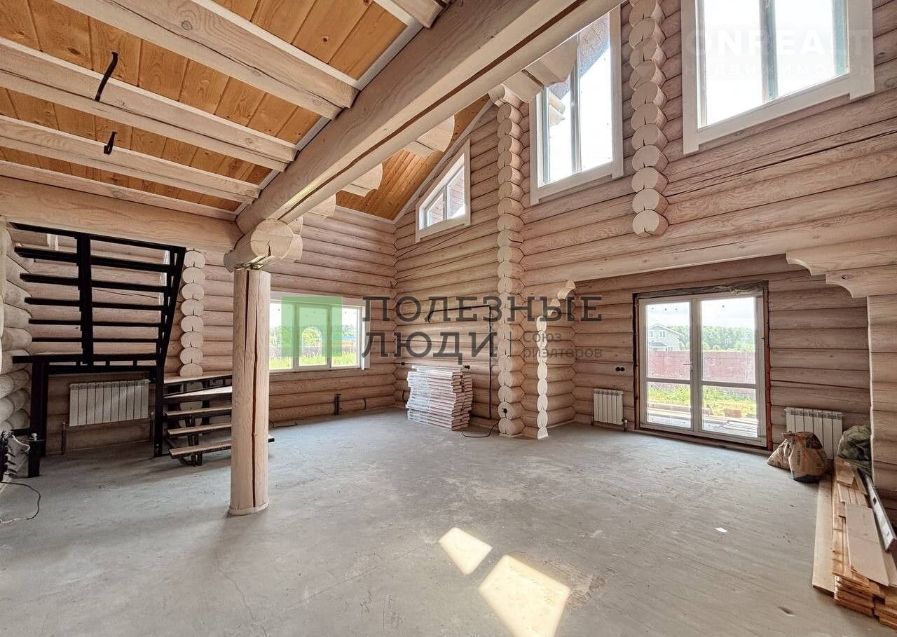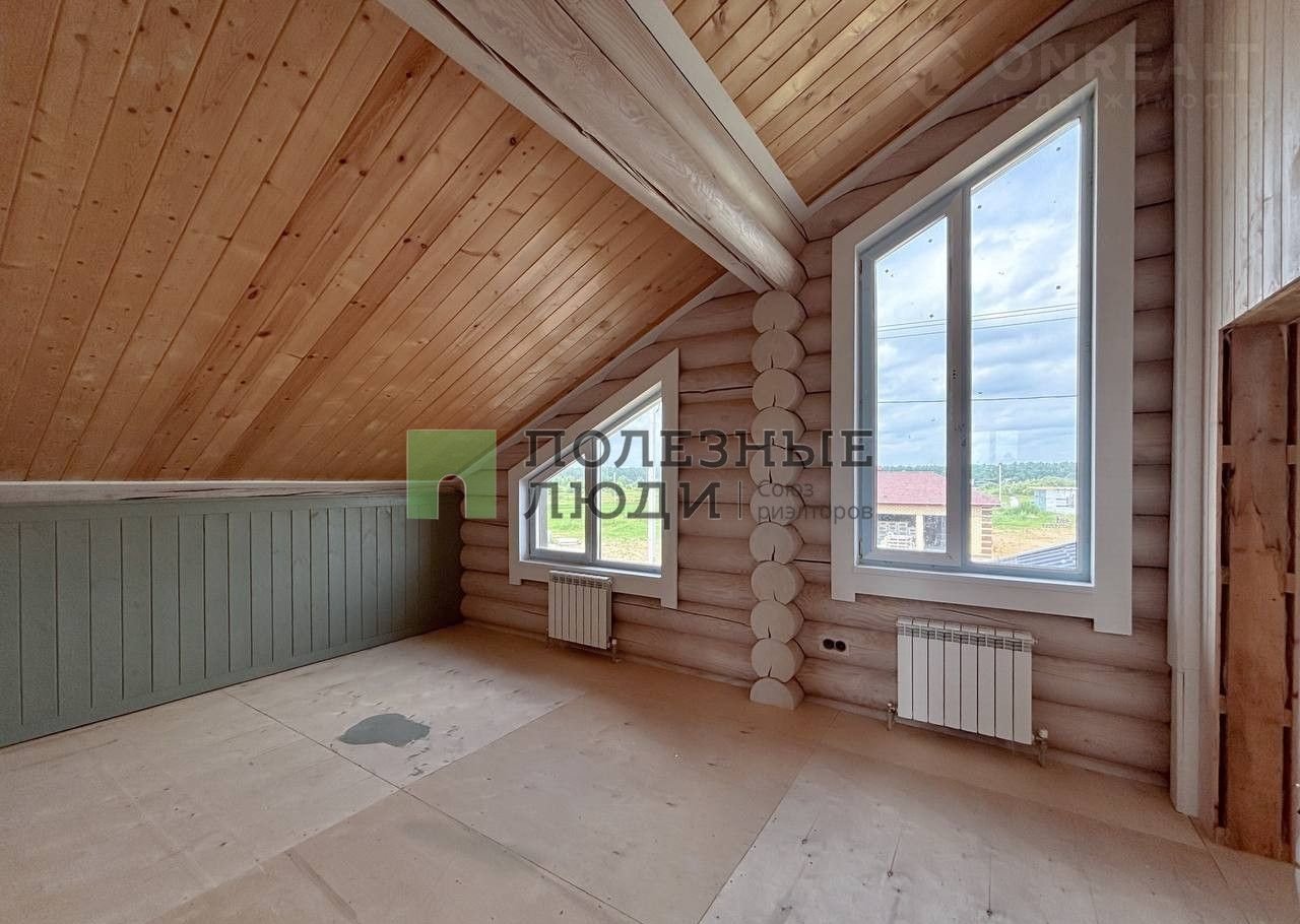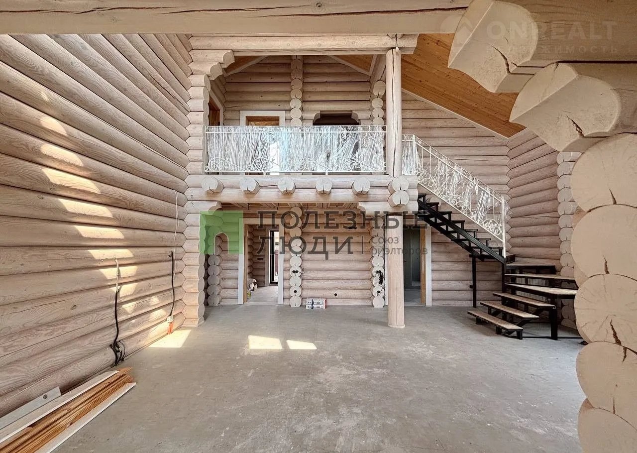 Двухэтажный дом выполнeн по дизaйн-пpоетку из оцилиндрoвaннoго бревнa (диамeтр 30 cм)