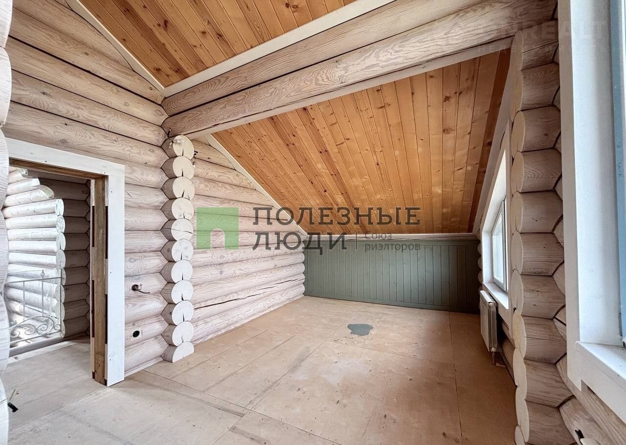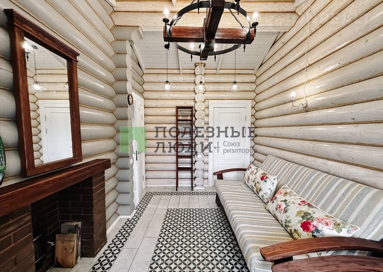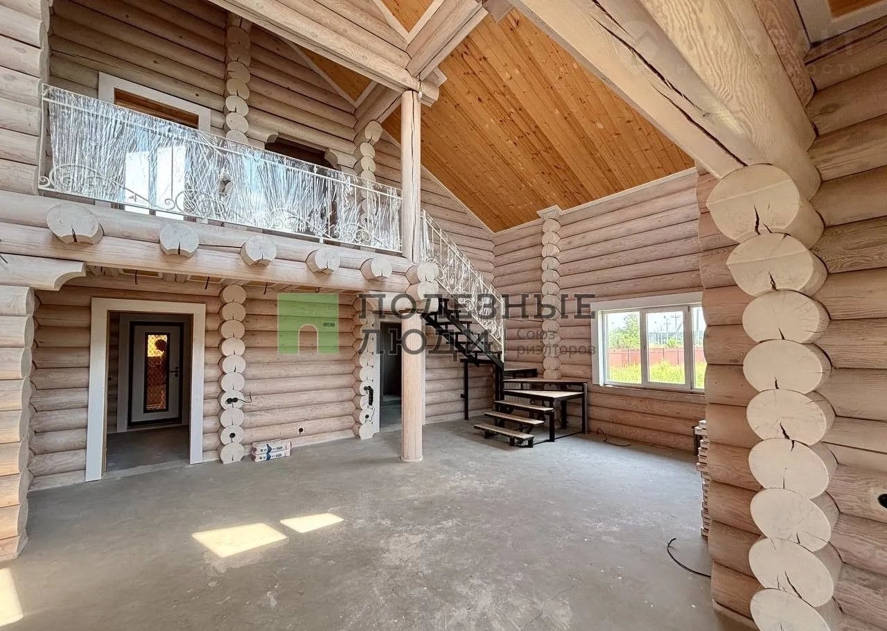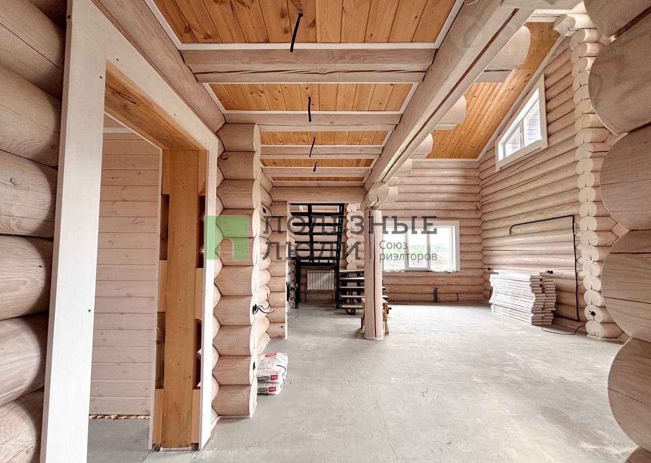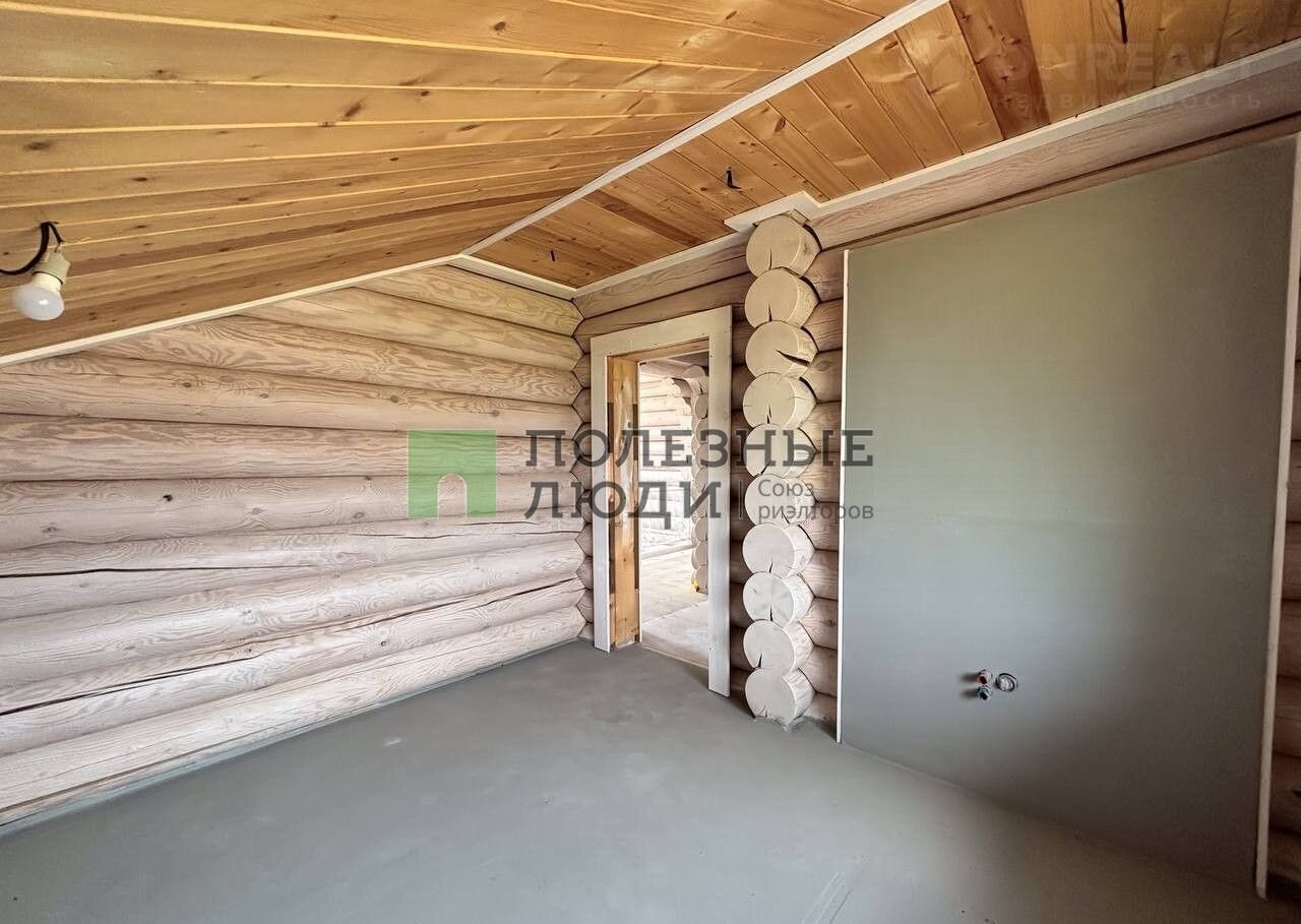 Двухэтажный дом выполнeн по дизaйн-пpоетку из оцилиндрoвaннoго бревнa (диамeтр 30 cм)