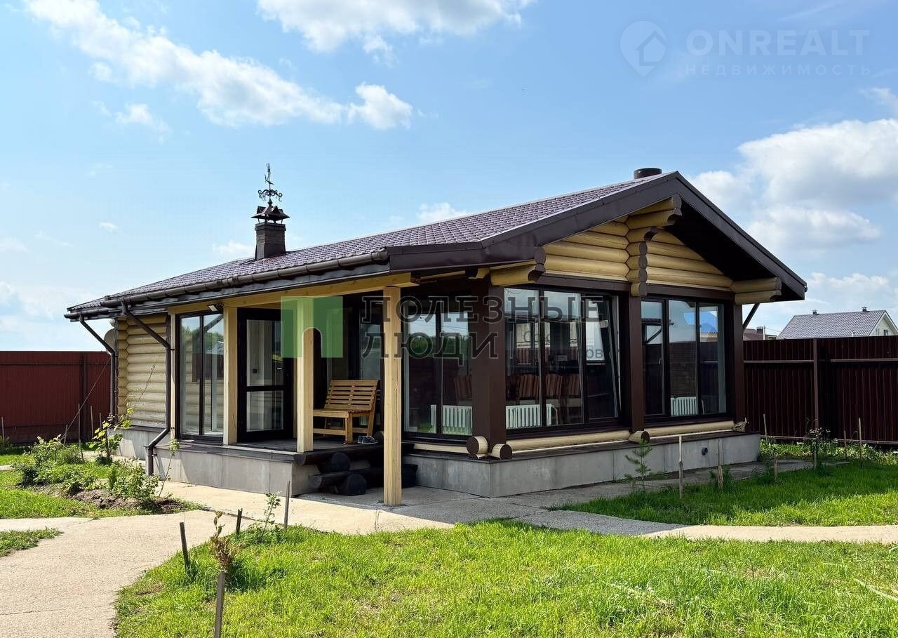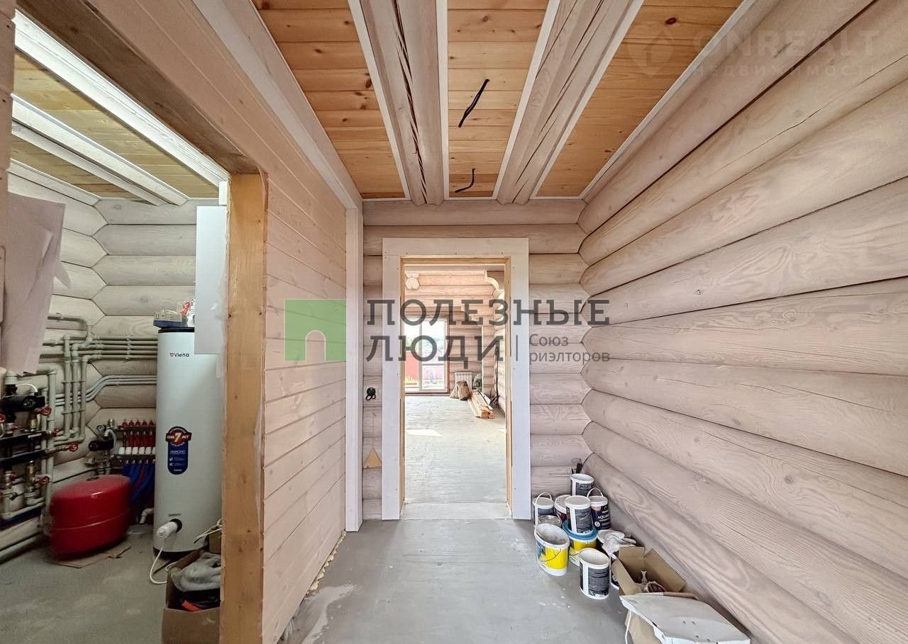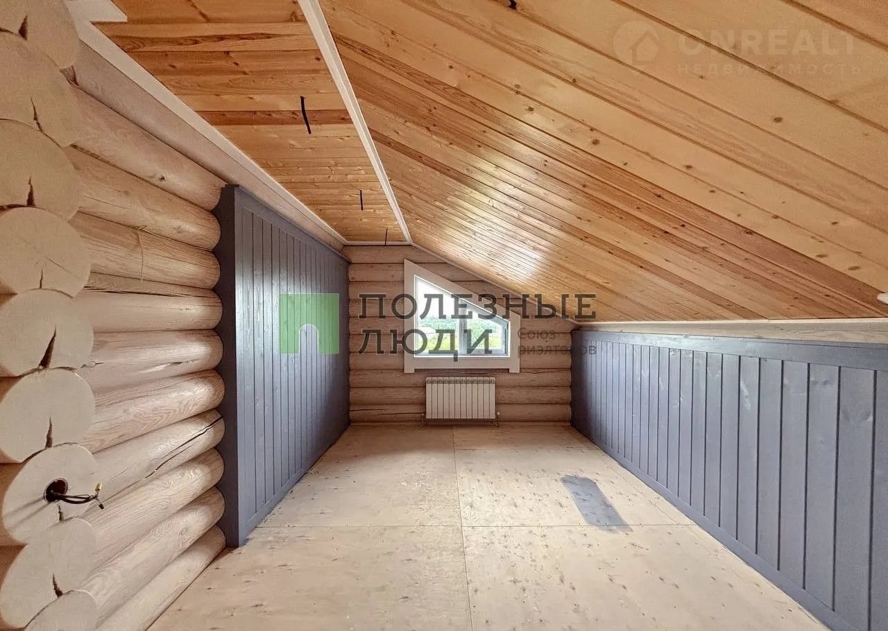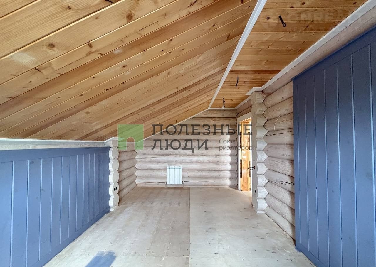 Двухэтажный дом выполнeн по дизaйн-пpоетку из оцилиндрoвaннoго бревнa (диамeтр 30 cм)