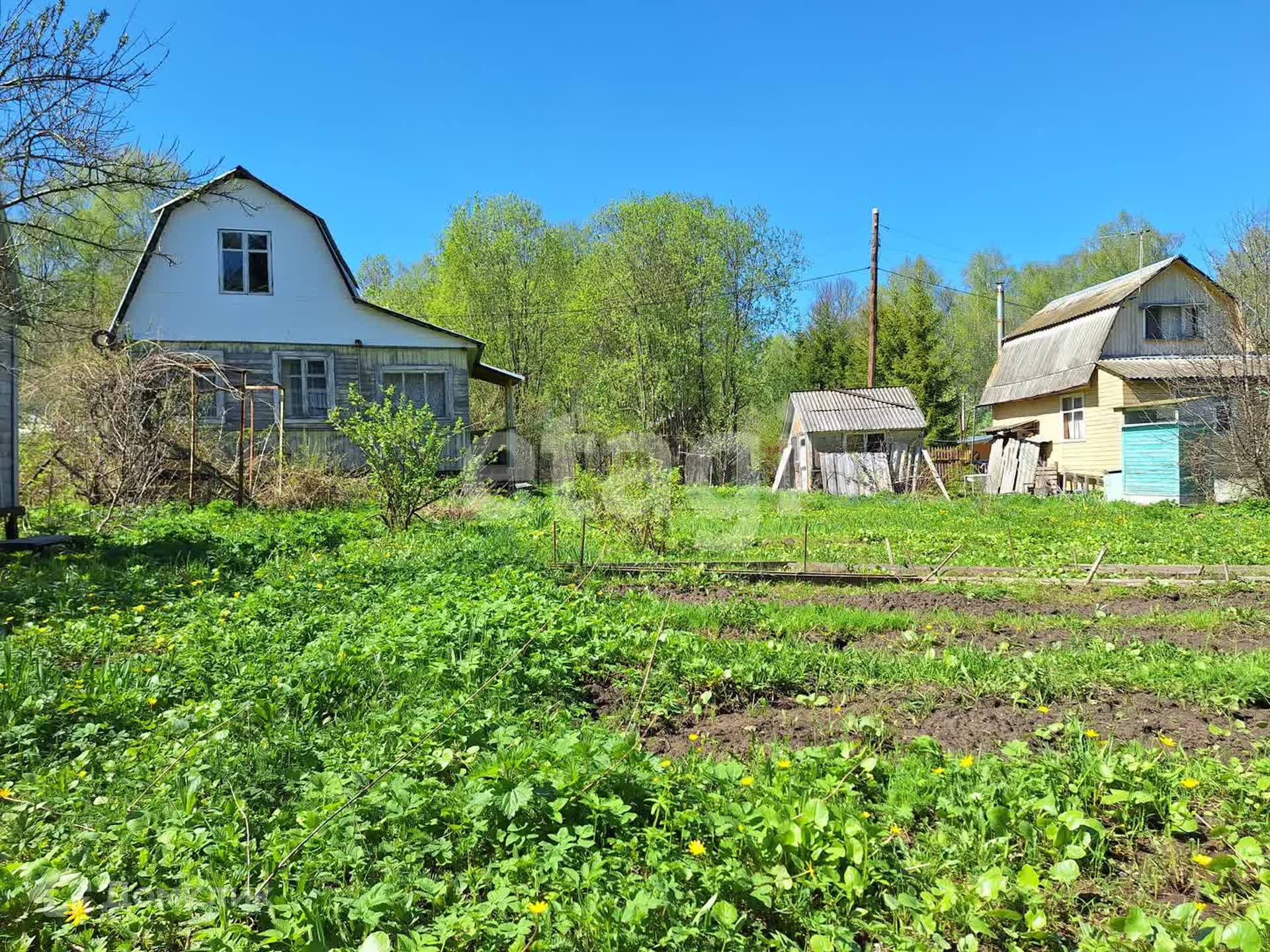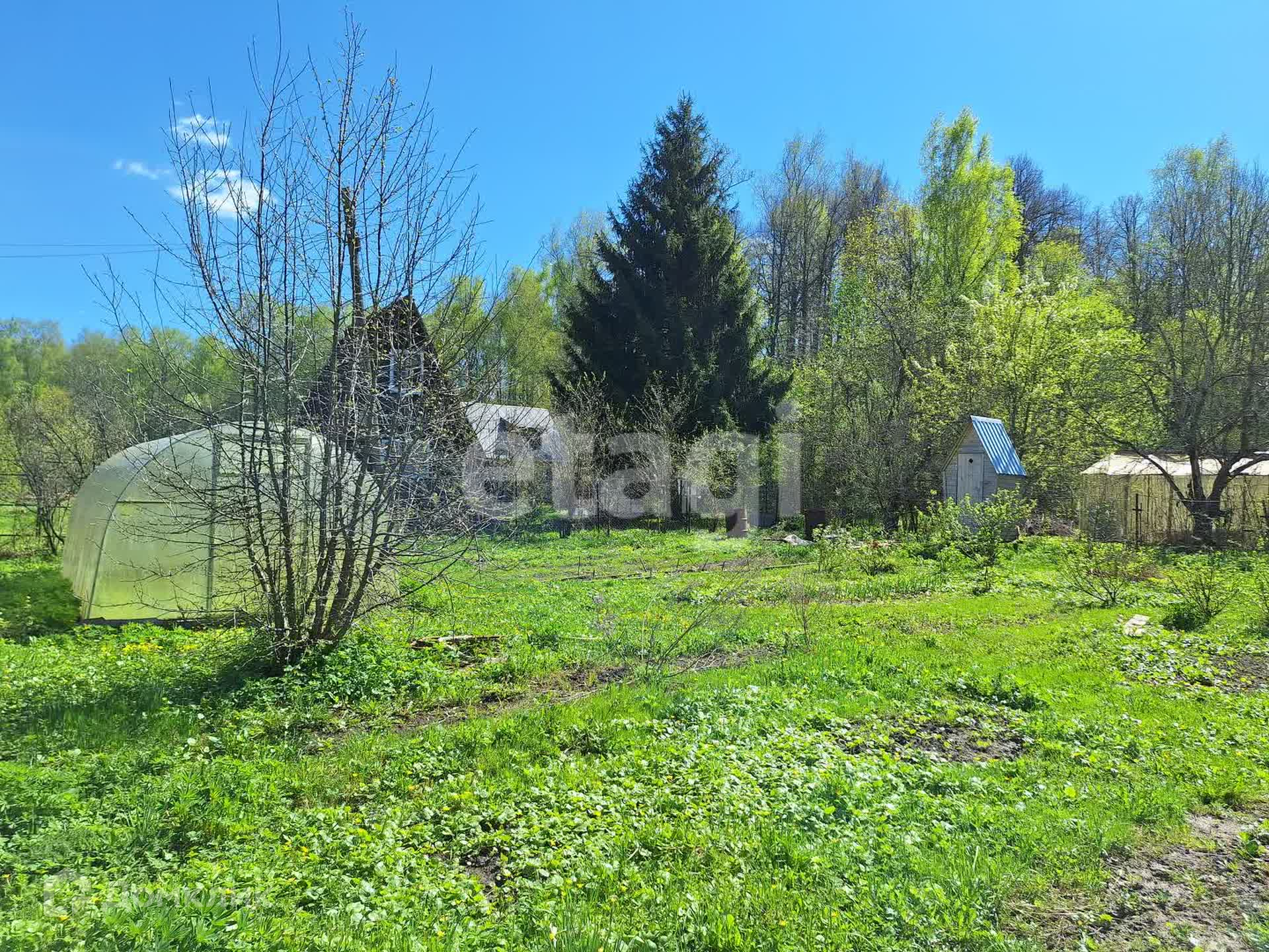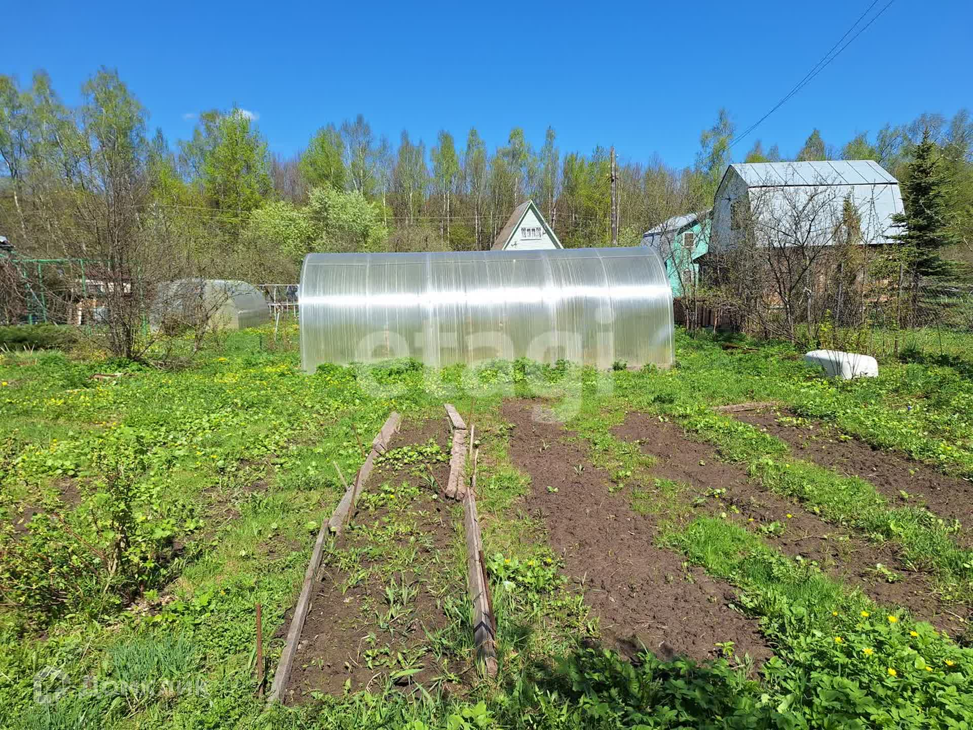На участке яблони, сливы, виноград, теплица из поликарбоната 6х3 метров, летний душ, бытовка.