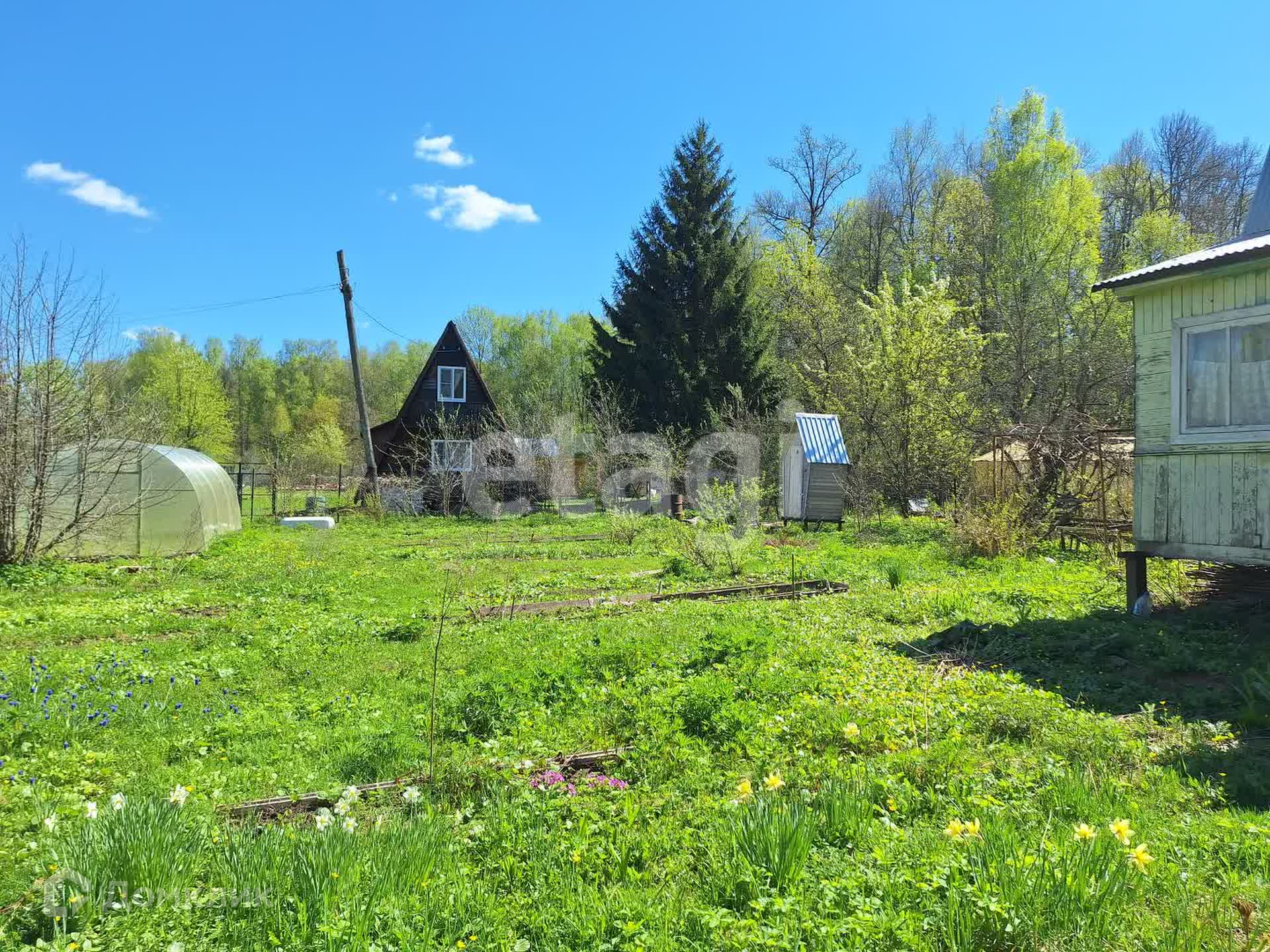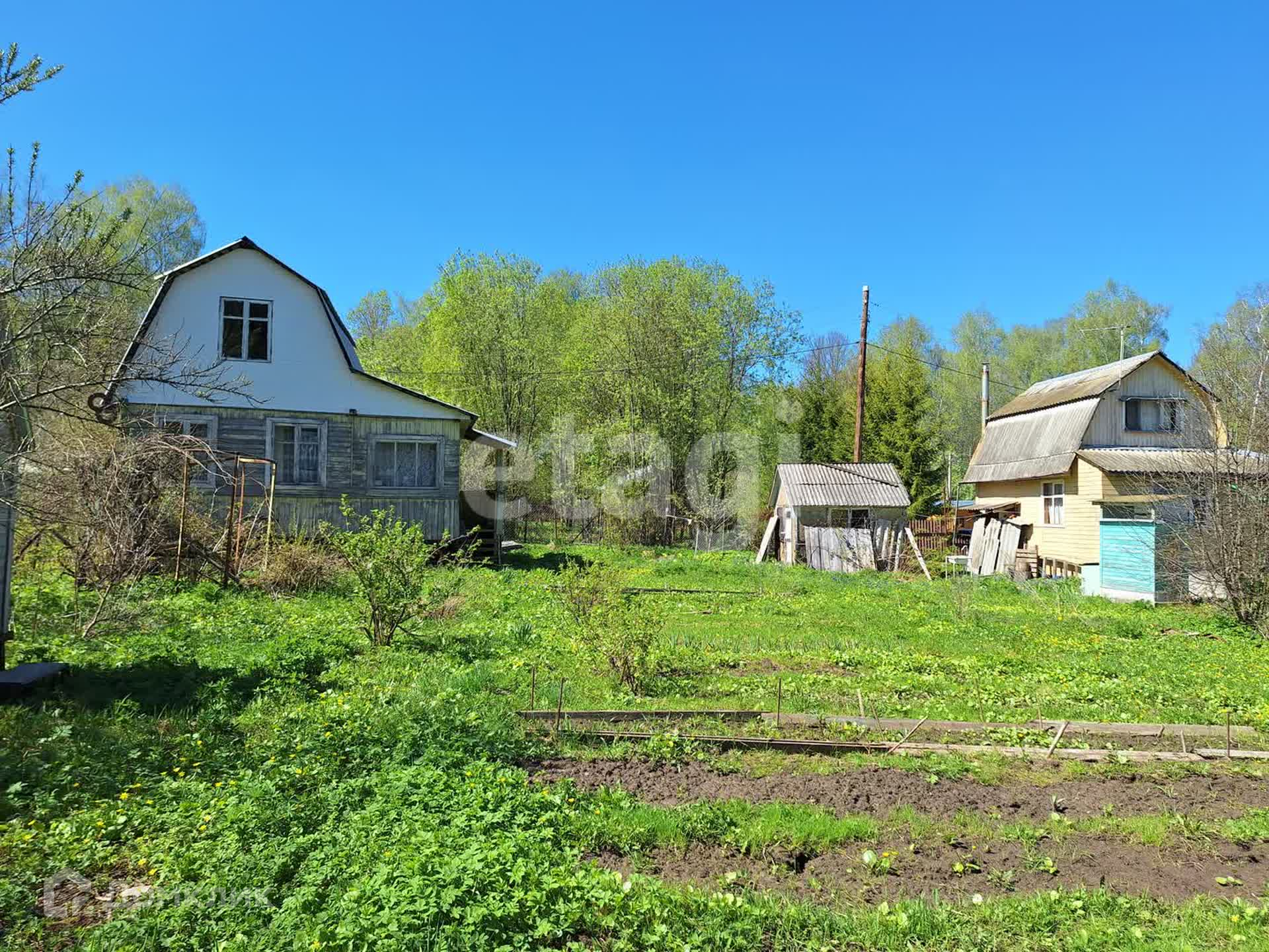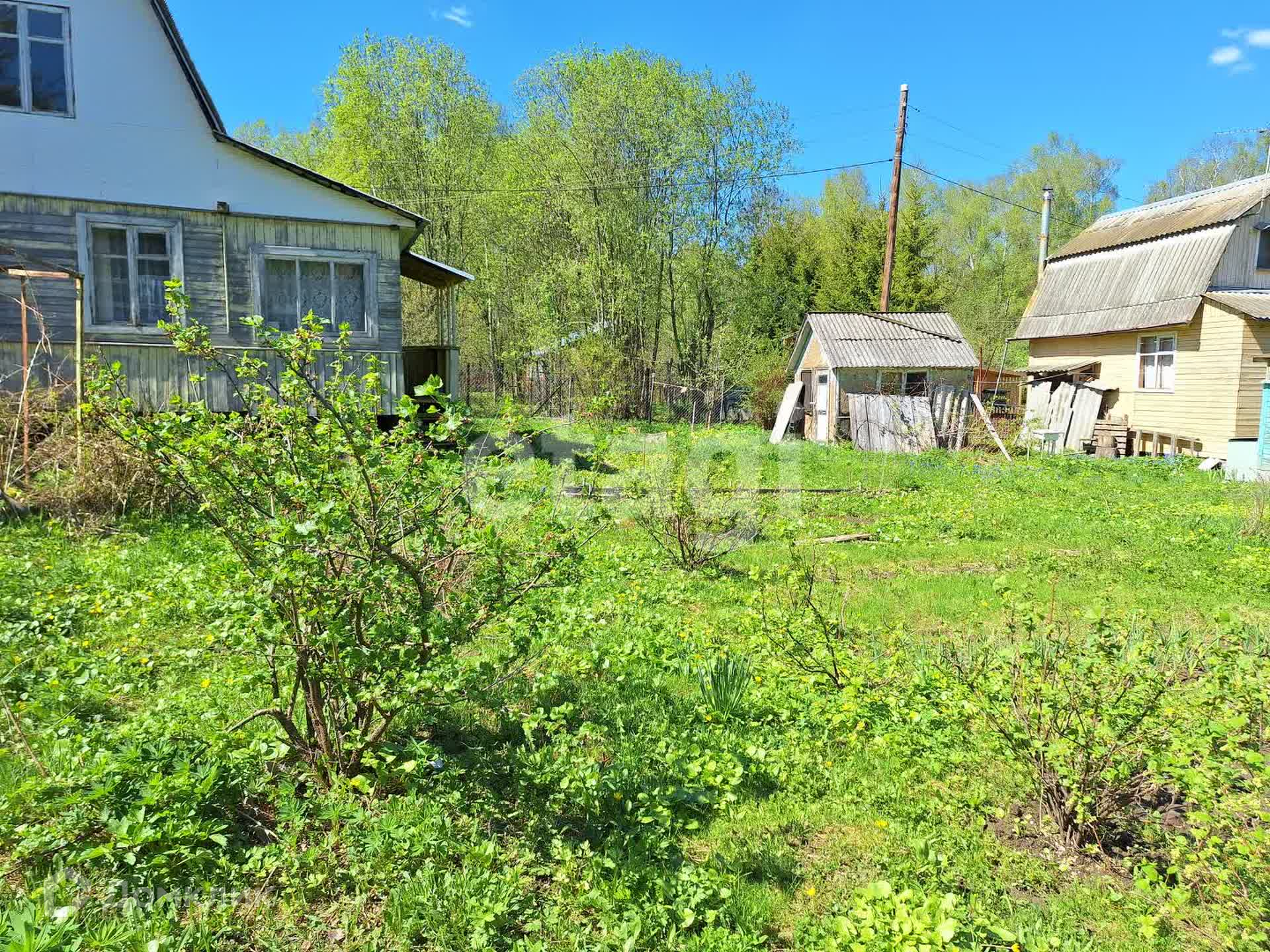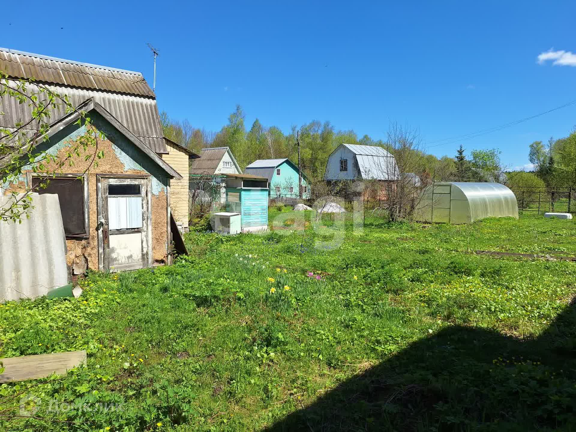 На участке яблони, сливы, виноград, теплица из поликарбоната 6х3 метров, летний душ, бытовка.