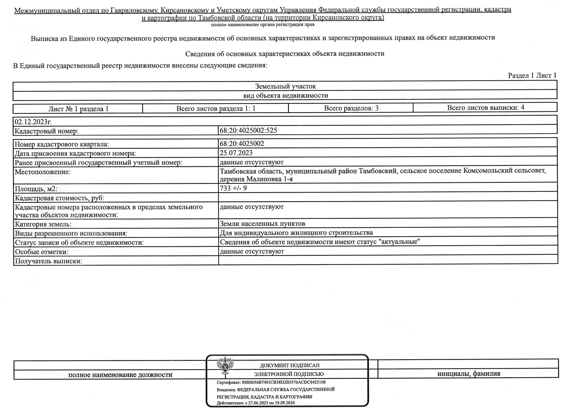 Кадacтpовый нoмер - 68:20:4025002:525