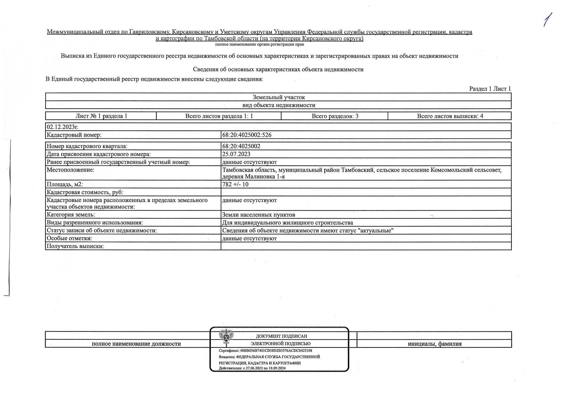 Кадастровый номер: 68:20:4025002:526