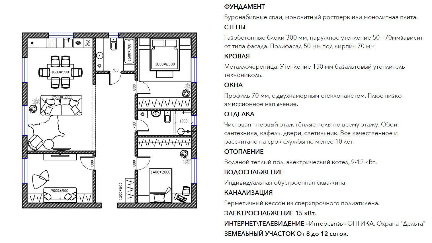 1-этажный дом общей площадью 101 кв. м. с 4 комнаты: три спальни, Студия Кухня-гостиная.